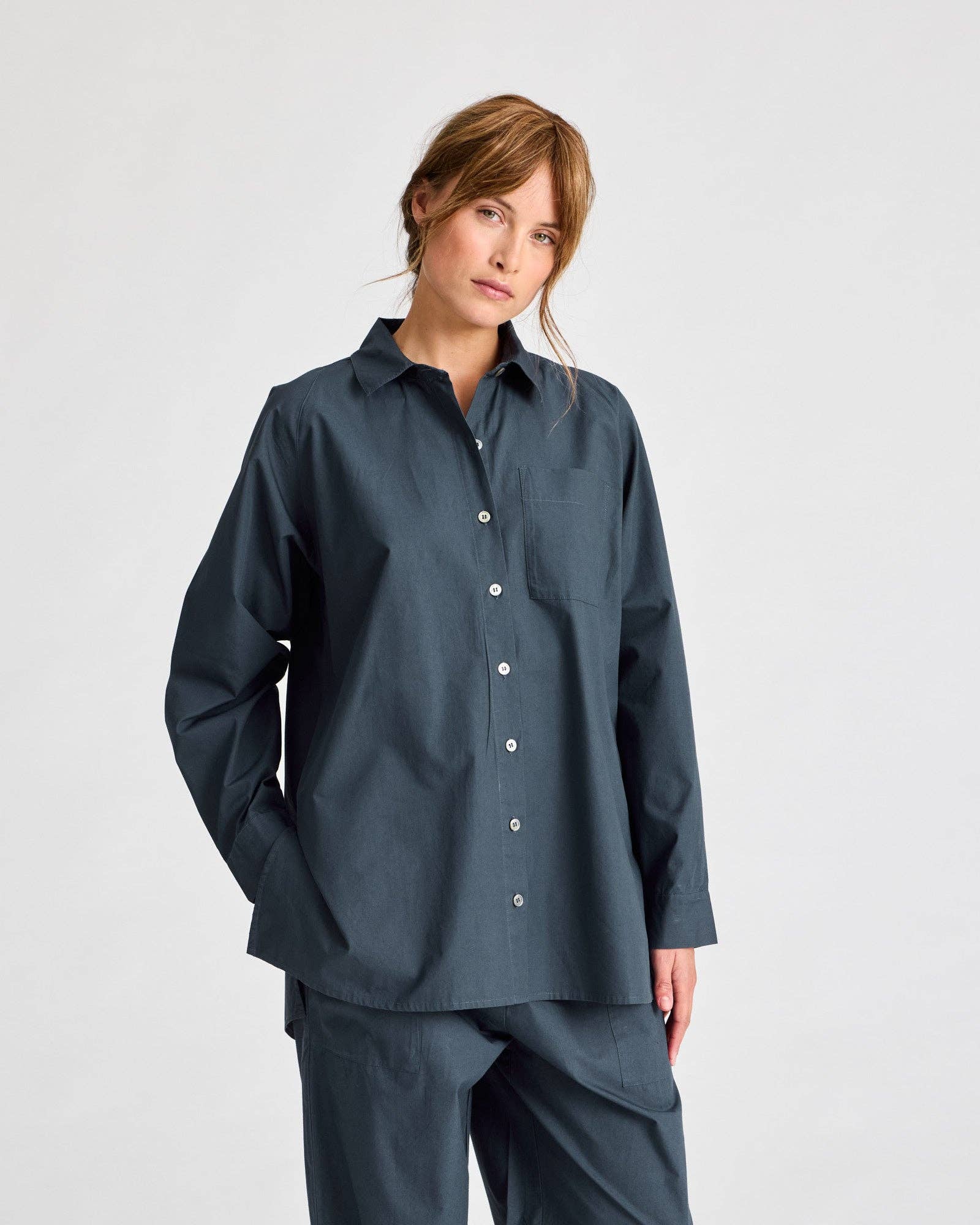 Astrid ist ein langärmliges Hemd mit Knopfleiste, hergestellt aus 100% Bio-Baumwollpopeline. Das Hemd hat Manschetten mit Knopfverschluss und eine einzelne Brusttasche. Das Hemd hat Perlmuttknöpfe an der Vorderseite und den Manschetten. Das Astrid-Hemd hat eine gerade, lockere Passform. Das Astrid-Hemd ist GOTS-zertifiziert. Zertifiziert von Ecocert Greenlife, Lizenznummer 243975