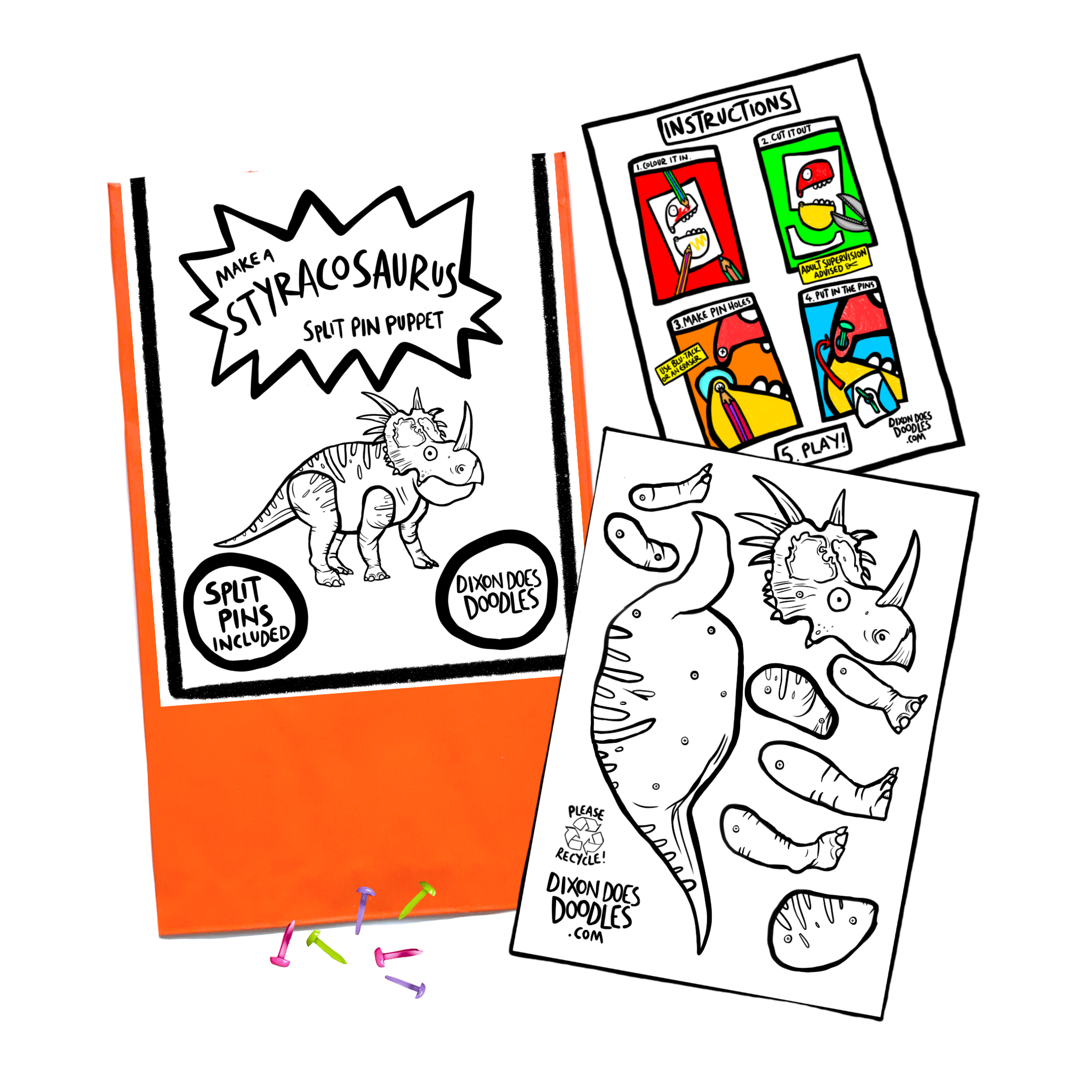 Ein fantastisches Stegosaurus-Split-Pin-Marionetten-Bastelset für Kinder ab 4 Jahren. In der Verpackung der Papiertüte ist ein Blatt Karte mit den Puppenteilen zum einfachen Ausmalen enthalten, ein einfaches Anleitungsblatt und einige bunte Metallspaltstifte. Jede Menge kreativer Spaß! Alles in dieser Packung kann recycelt werden und wurde auf Sicherheit getestet.