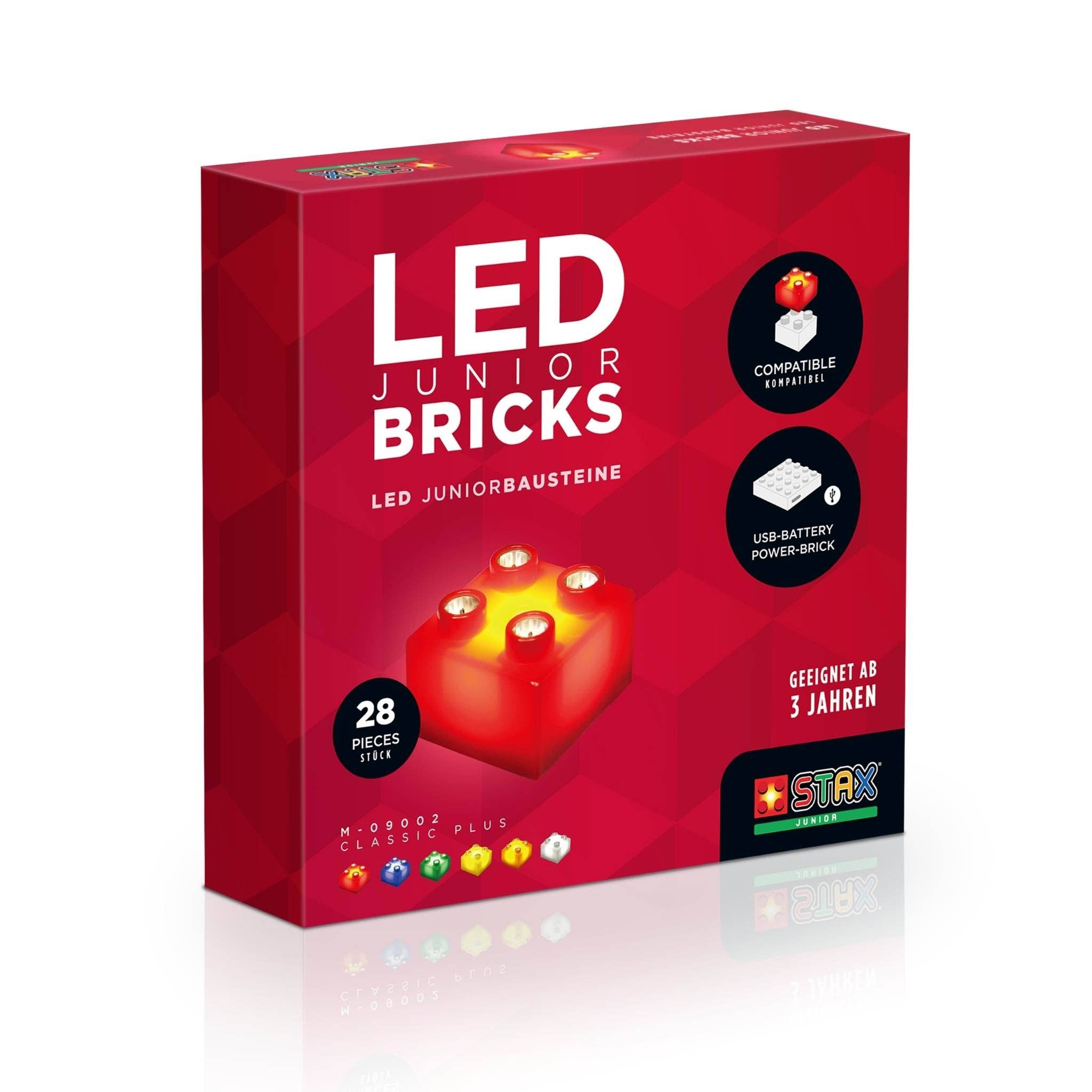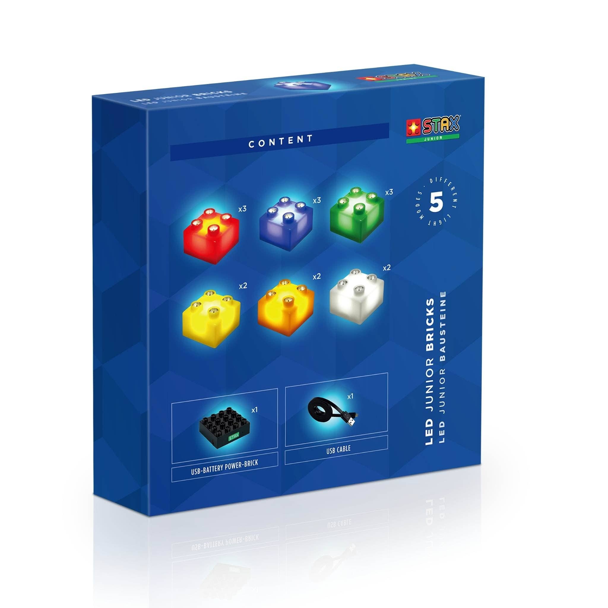 The LIGHT STAX® play table in DUPLO®-compatible format (stud count: 32 x 32) with 50 LIGHT STAX in 2 x 2 format can be built upon at any desired spot to make the respective STAX light up. Ideal for families with multiple children as well as for kindergartens and daycare centers. Also perfectly suitable as a sales support item for the toy retail trade! Contents: - STAX Power Table 32x32 format (Table dimensions: 63.5 cm x 63.5 cm x 11.0 cm) - 50 STAX Junior Bricks 2x2 format (12 x red, 8 x blue, 8 x green, 8 x white, 8 x yellow, 6 x orange) - Power Base with cable Warning! Contains battery. Not suitable for children under 36 months. Choking hazard due to small parts that can be swallowed. Strangulation hazard due to included cable.