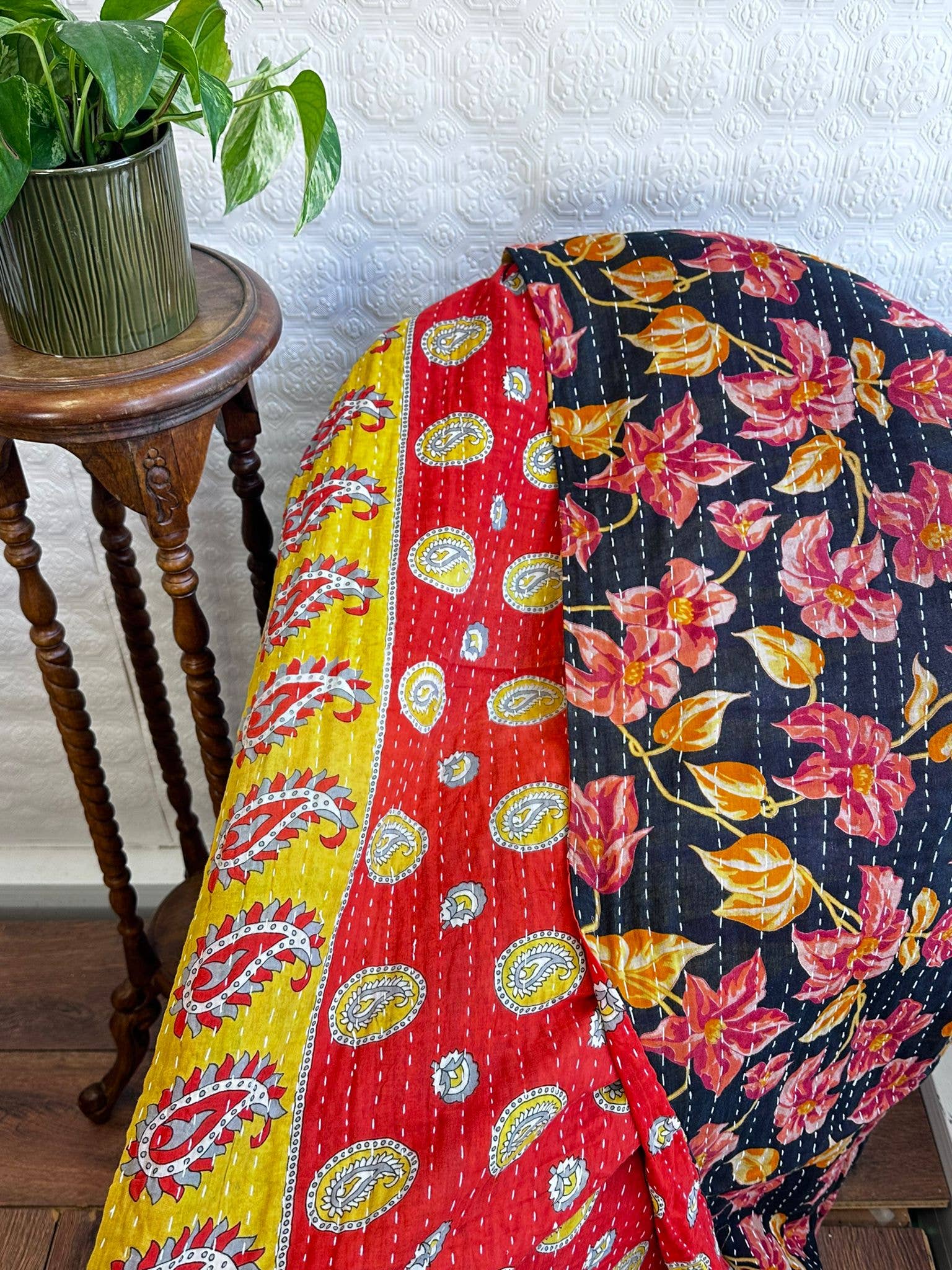 Wunderschöne Vintage-Wendedecke mit Suzani-Stickerei aus Wollfaden! Unter den zahlreichen Kanthas wählen wir sorgfältig Decken aus, von denen wir glauben, dass sie Liebe und gemütliche Stimmung an ihren endgültigen Ort bringen werden. Mit jedem Kantha kommt eine Geschichte und eine Geschichte, die als Energie reist, und wir verschönern dieses schöne Stück mit Stickereien, um ästhetische Elemente in Ihr schönes Zuhause zu bringen! Kantha ist eine einfache Handstickerei mit einem Laufstich, der Stoffstücke kombiniert. In traditionellem Indien und Bangladesch versammeln sich die meisten Frauen, um Zeit miteinander zu verbringen und Kunst in Form ihrer Arbeit zu schaffen, während sie auch Geld für ihre Familien verdienen. Wir unterstützen und fördern aktiv die Beschäftigung von Frauen und den fairen Handel. Indem Sie sich für Kantha-Produkte entscheiden, tragen Sie dazu bei, etwas umweltfreundliches und nachhaltiges aus lokal angebauter 100% Baumwolle zu wählen. Vintage-Stücke haben normalerweise einige mit alternativen Designs bedeckte Flicken, um die Decke vollständig zu machen. Wir versuchen, alle Seiten des Kantha zu fotografieren, um jede einzelne Ecke zu zeigen. PS: Jede Vintage-Decke variiert in der Größe, wenn Sie genaue Maße wünschen, schreiben Sie uns bitte! Macht großartige Sofabezüge, die leicht zu pflegen sind. Sieht toll auf Statement-Stühlen aus. Diese fügen Farbe und Lebendigkeit zu Bettfußteilen hinzu! Wir bemühen uns nach Kräften, während der Fotografie die richtigen Farben sicherzustellen, aber die Farbe kann je nach Bildschirmauflösung leicht variieren. Wir fotografieren bei natürlichem Licht und manchmal sind Außenaufnahmen enthalten, um die Farben zu zeigen. Bitte wählen Sie Versand-Upgrades entsprechend Ihren Bedürfnissen. Bei Fragen können Sie uns gerne eine Nachricht senden.