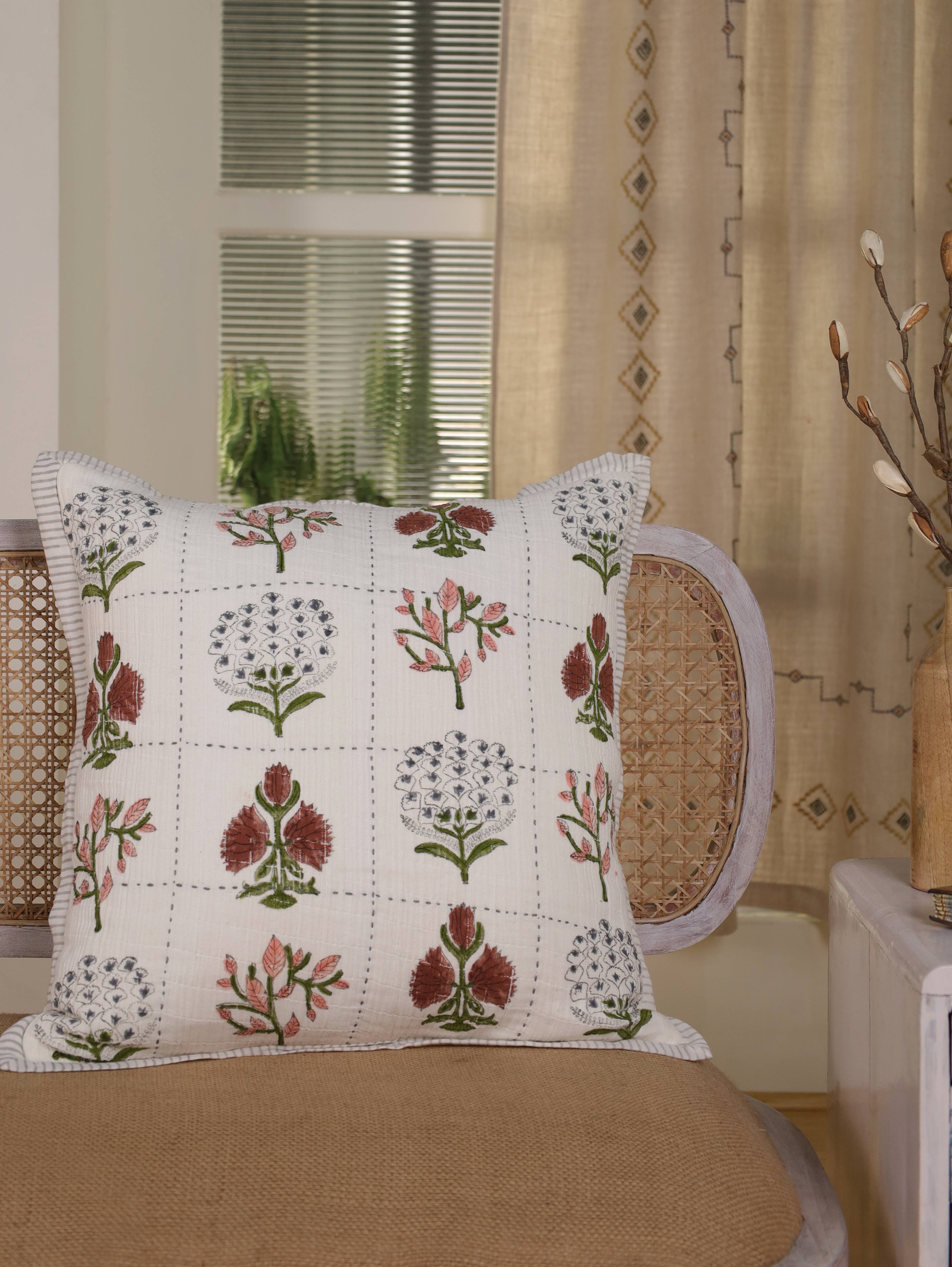 Farbe - Mehrfarbig Größe - 20x20 Zoll & 14x22 Zoll Form - Quadrat & Rechteck Material - Leinen Muster - Blumenmuster Technik - Handblockdruck Pflegehinweis - Schonwäsche Verschlussart - Reißverschluss auf der Rückseite Fragen - Zögern Sie nicht, mir eine Nachricht zu senden, wenn Sie mehr erfahren möchten. Verleihen Sie Ihrem Raum mit dem weichen, natürlichen Charme unseres handbedruckten Leinenkissenbezugs mit Blumenmuster neuen Glanz. Sorgfältig von erfahrenen Kunsthandwerkern gefertigt, zeigt dieser Leinenkissenbezug zarte Blumenmuster in warmen Aprikosentönen und verleiht Ihrem Wohnzimmer oder Schlafzimmer eine leichte, frische Note. Hochwertiges Leinengewebe: Hergestellt aus atmungsaktivem, hochwertigem Leinen mit einer strukturierten, natürlichen Haptik, die sowohl zu modernen als auch rustikalen Interieurs passt. Handblockdruck-Design: Jeder Bezug wird sorgfältig von Hand bedruckt, wodurch jedes Stück seinen eigenen subtilen Charakter und handwerkliche Details erhält. Einfacher Reißverschluss: Mit einem verdeckten Reißverschluss auf der Rückseite für ein sauberes Aussehen und eine bequeme Kissenplatzierung gestaltet.