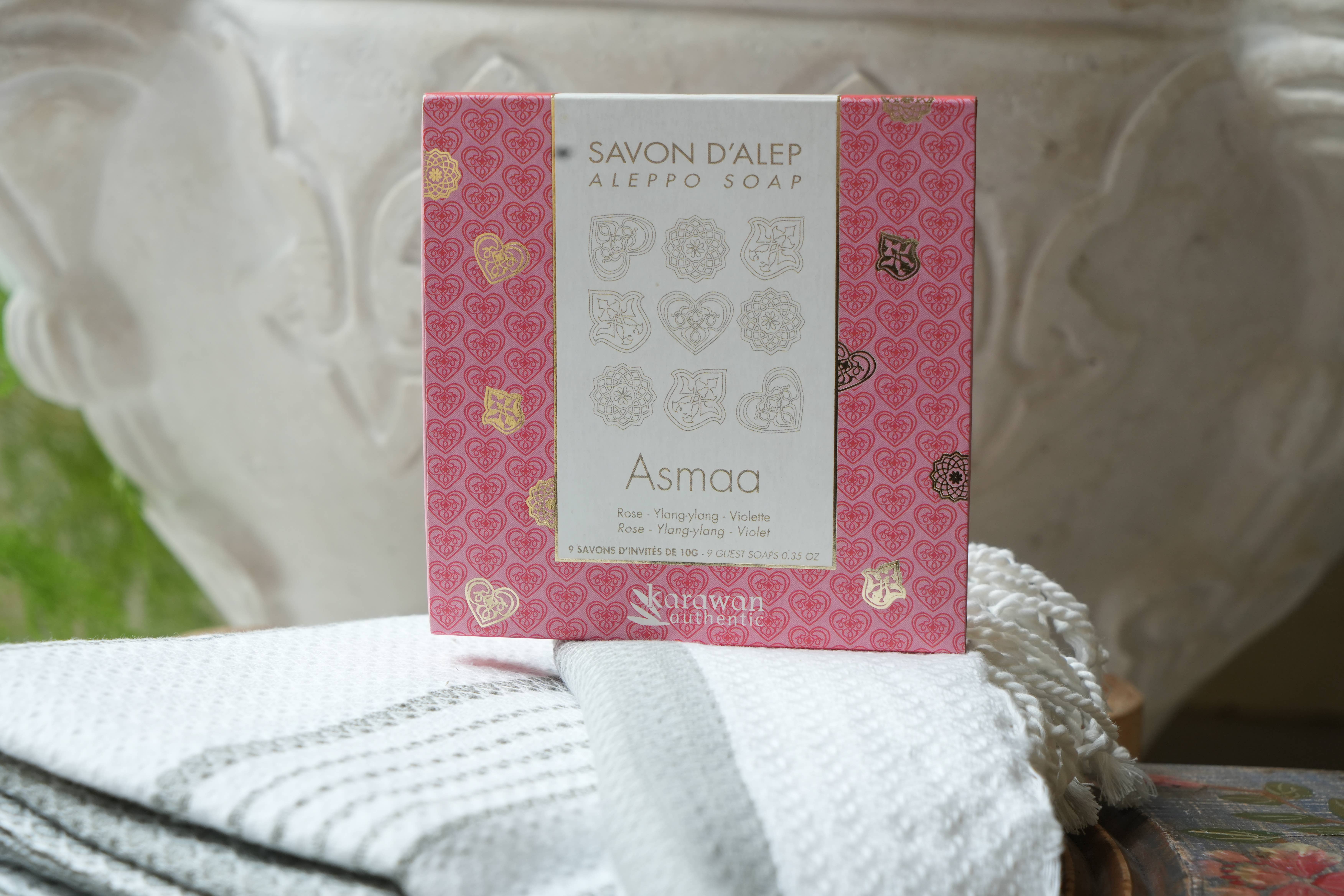 Aleppo-Seifen mit 95 % Olivenöl, beduftet mit besonderen Mischungen aus ätherischen Ölen und Pflanzenextrakten, hergestellt aus außergewöhnlichen natürlichen Rohstoffen. Die Verbindung der Aleppo-Tradition mit französischem Parfümhandwerk aus Grasse – eine tägliche Sinnesreise zum Genießen! Entdeckungsbox mit 9 Seifen in 3 exklusiven Düften und 3 einzigartigen Formen: - „AMAA“: floraler Duft (Rose, Ylang-Ylang, Veilchen) - „ISKENDAR“: Zitrusduft (Orangenblüte, Zitrone, Bergamotte) - „JENJIS“: holziger Duft (Zeder, Kreuzkümmel, Patchouli) Diese Aleppo-Seife reinigt, pflegt und macht Gesicht und Körper weich, ohne die Haut auszutrocknen. Geschenkbox mit Heißfolienprägung in Gold auf Kraftkarton, Format 9x10 g. Ideal als Geschenk für Gäste oder besondere Anlässe. Für den täglichen Gebrauch an Körper, Gesicht und Händen. Produkt aus der SAINT VALENTINE Kollektion.