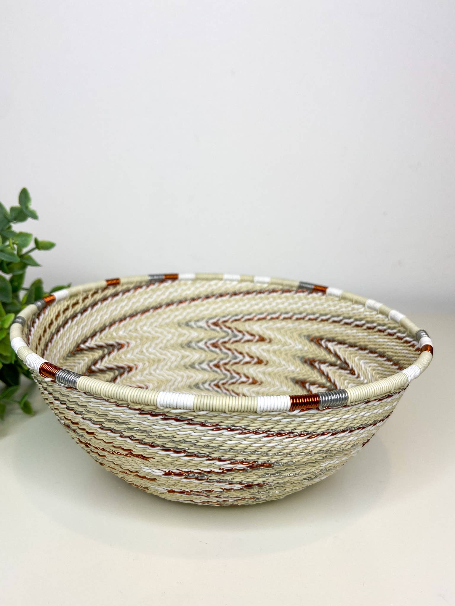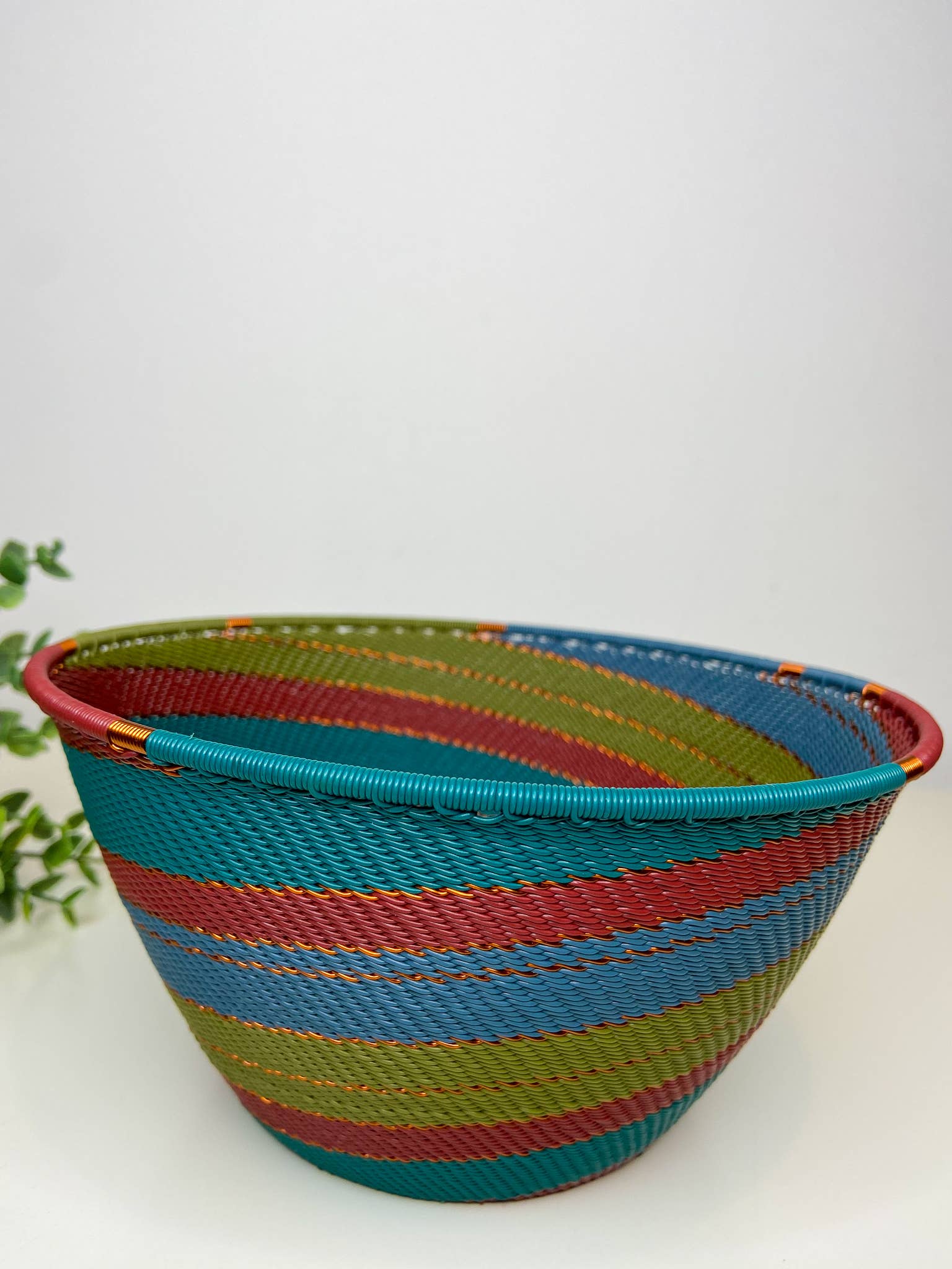 Diese dekorative Platte ist aus Telefonkabel handgewebt. Es ist eine traditionelle Zulu-Arbeit und besteht aus Spulen von Telefonkabeln, die um einen festen Metallkern gewickelt sind, um seine Form zu definieren. Es hat eine moderne Wendung mit der Infusion von hellen Farbmustern. Die Komplexität im Design macht diese Platte aufgrund der langen Produktionstage, die mit ihrem Design verbunden sind, so wertvoll. Keine zwei Teile sind gleich. Die Designs können variieren, wodurch jedes einzelne Stück so viel einzigartiger wird. Es kann als Obstschale perfekt in der Küche, als Catch-All für Küchenzubehör verwendet werden. Es macht auch lustige, einzigartige und wunderbare Geschenke. Durchmesser: 16 cm Höhe: 6,5 cm