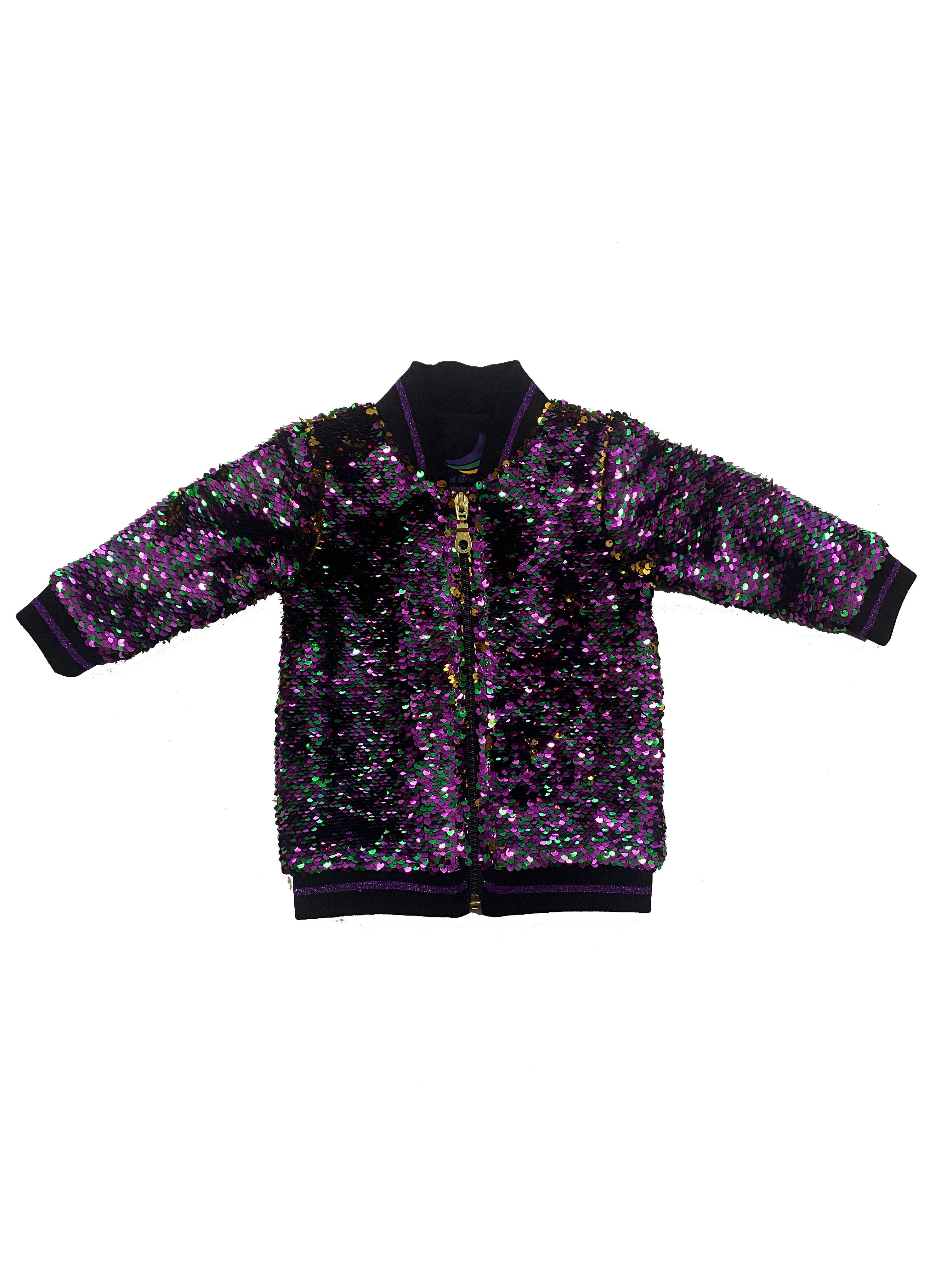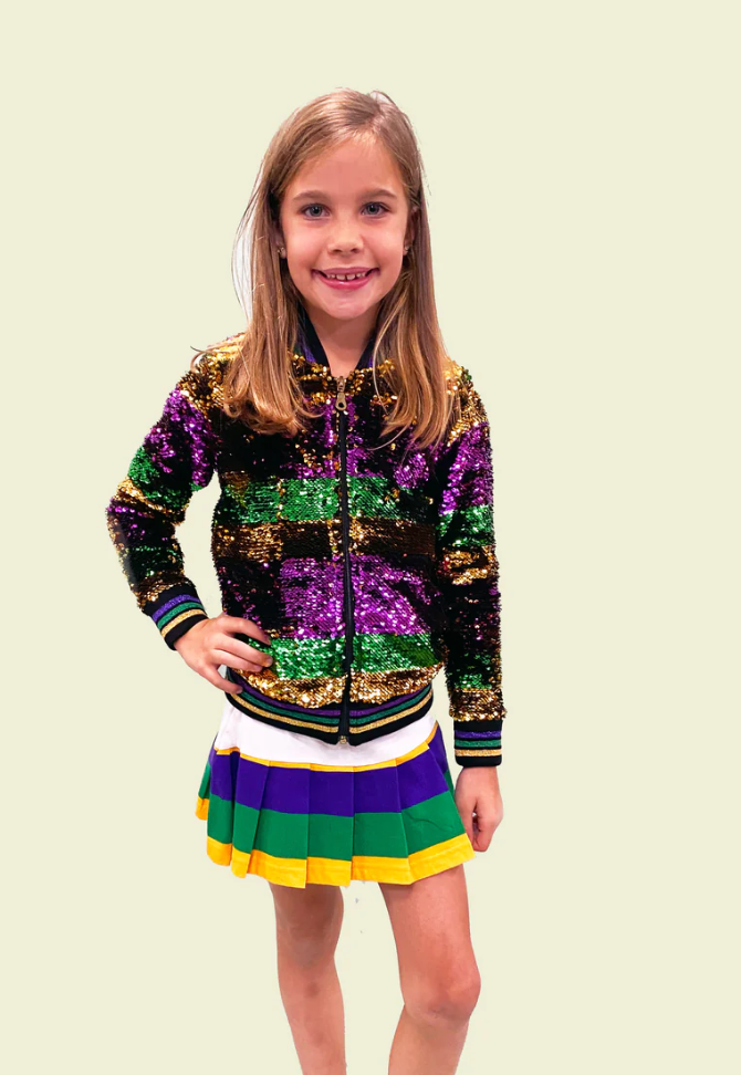 Mit dieser Paillettenjacke für Ihre Kleinen verzaubern Sie die Straßen im wahren Karnevalsstil! Mit einem lila, grünen und goldenen Colorblock-Design, das von Mardi Gras inspiriert ist, bleibt Ihr Kind warm und sieht gleichzeitig zu süß aus! Der perfekte Weg, um deine Kleinen zu kombinieren! Erhältlich in Säuglings-, Jugend- und Erwachsenengrößen.