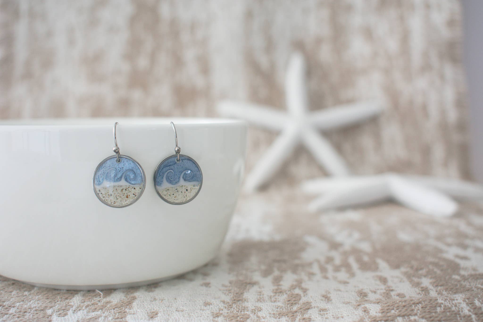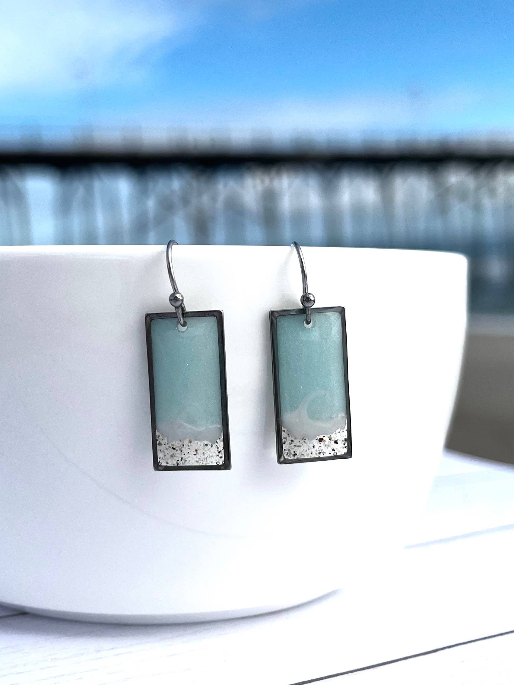 Einzigartige, handgefertigte Ohrhänger mit echtem Strandsand, mit denen Sie Ihren Lieblingsstrand ganz nah an Ihrem Herzen halten können. Perfekt, um Sie an Tage zu erinnern, an denen Sie in der Meeresbrise die Sonne genießen konnten. Ein ideales Geschenk für Ihre Mutter, Schwester, Tochter oder wen auch immer Ihr Strandbestie sein mag. Jedes Paar wird mit Sorgfalt hergestellt und keine zwei Paare sind genau gleich. Bitte beachten Sie, dass die Wellenform und die Sandstruktur variieren, genau wie von Strand zu Strand. Bitte wählen Sie beim Auschecken aus, ob Sie meinen Sand verwenden oder mir Sand senden möchten. Ich habe eine Vielzahl von Sand aus North Carolina und anderen Stränden, mit denen ich gerne Ihren Schmuck herstellen würde. Wenn ich Ihren speziellen Strand nicht habe, benötige ich ungefähr eine Tasse, die an mein Postfach geschickt wird, bevor ich anfange. Jedes Paar Ohrringe wird auf einer Karte mit einer Karte des ausgewählten Bereichs geliefert, wobei die Position unten hervorgehoben ist. Die Ohrringe sind aus Edelstahl gefertigt.