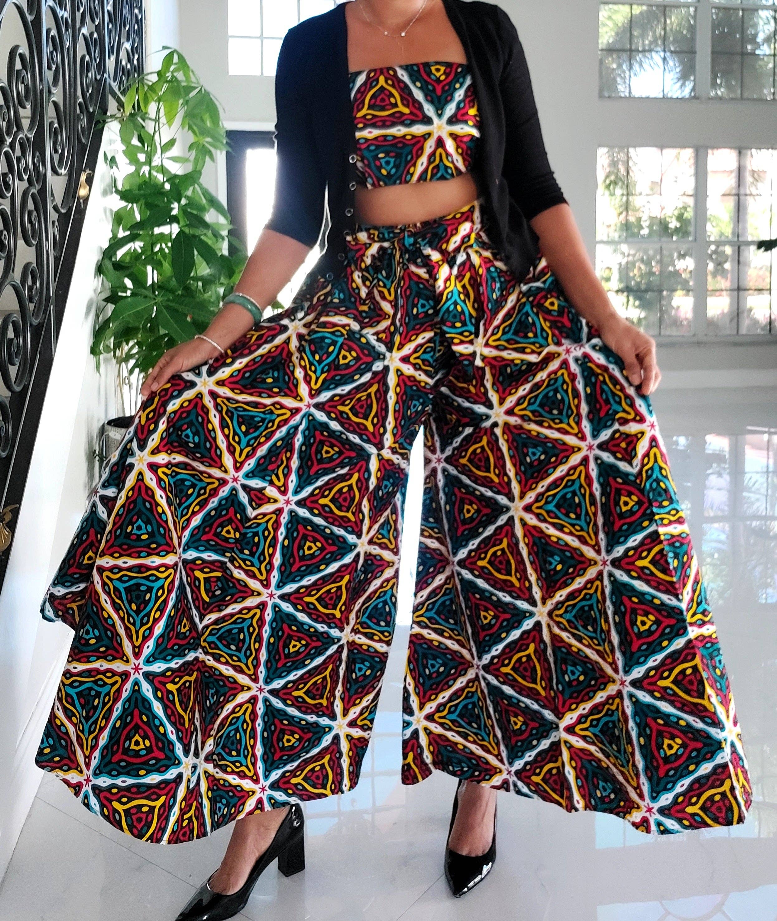 Lange Palazzo-Hose für Damen. Ein Unikat. Material: Denim und gewachste Baumwolle Einheitsgröße für S bis 3XL Farbe: blauer Denim und mehrere Drucke und Muster Hinweis: Muster und Farbe variieren bei jedem Stück. Keine zwei sind gleich.