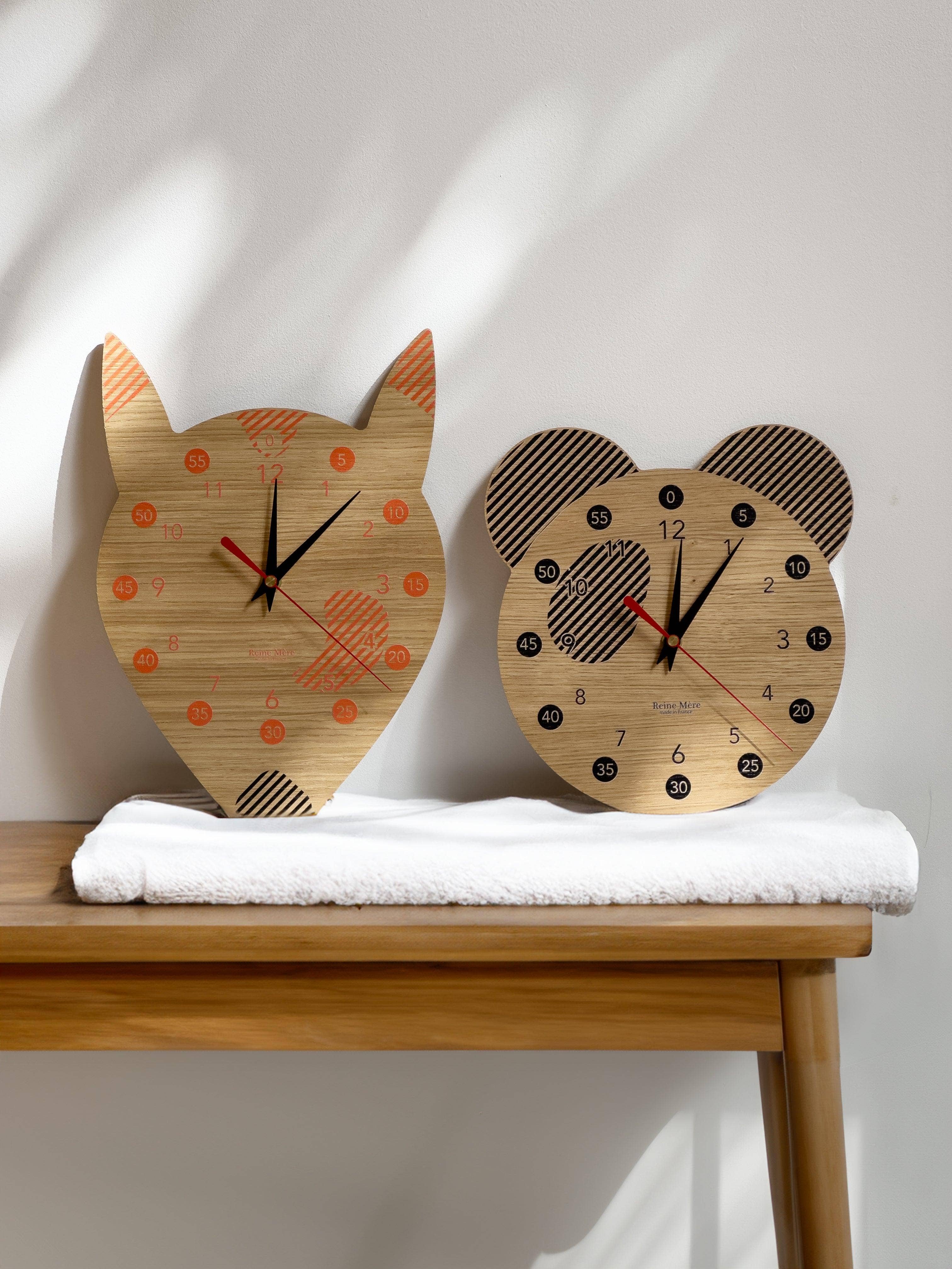 Praktisch für die Kleinen, diese Uhr aus mitteldichter Faserplatte mit Eichenfurnier hat ein Zifferblatt für Stunden und Minuten, um spielerisch die Uhrzeit zu lernen und ein kleiner Erwachsener zu werden! Wanduhr aus mitteldichter Faserplatte mit Eichenfurnier und leisem Uhrwerk. Hergestellt in Deutschland, für einen Hauch von Jura. • Material: Mitteldichte Faserplatte mit Eichenfurnier • Mechanismus: Leises Uhrwerk. • Abmessung: L 24 cm x B 23 cm