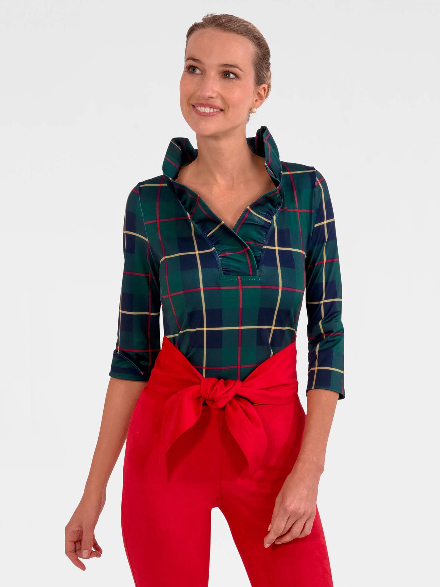 Beschreibung - 22" Länge - 14" Ärmel - 3/4 Ärmel mit 2" Schlitz - Wildlederknöpfe - Falten - Kontraststoff: Innere Rückwand Stoff & Pflege - 95% Polyester 5% Elastan - Kaltwäsche oder Schonwaschgang/ Aufhängen zum Trocknen oder Kaltlufttrocknen - Dunkle Farben separat von hellen waschen Verfügbare Größen: XXS (Shrimp) - XXXL (Diva) Wie man misst BRUST: Messen Sie unter Ihren Armen um den vollsten Teil Ihrer Brust. TAILLE: Messen Sie um Ihre natürliche Taille, das Maßband dabei etwas locker halten. HÜFTE: Messen Sie um den vollsten Teil Ihres Körpers am oberen Bein. Immer noch unsicher, welche Größe Sie benötigen? Unser Kundenservice-Team kann Ihnen helfen, die perfekte Größe zu finden, rufen Sie 914-465-5180 an oder senden Sie eine E-Mail an customerservice@gretchenscott.com.