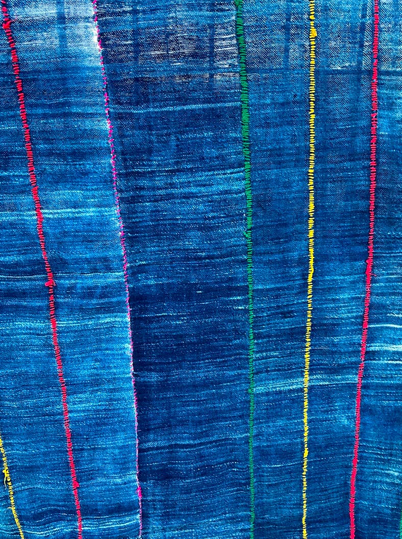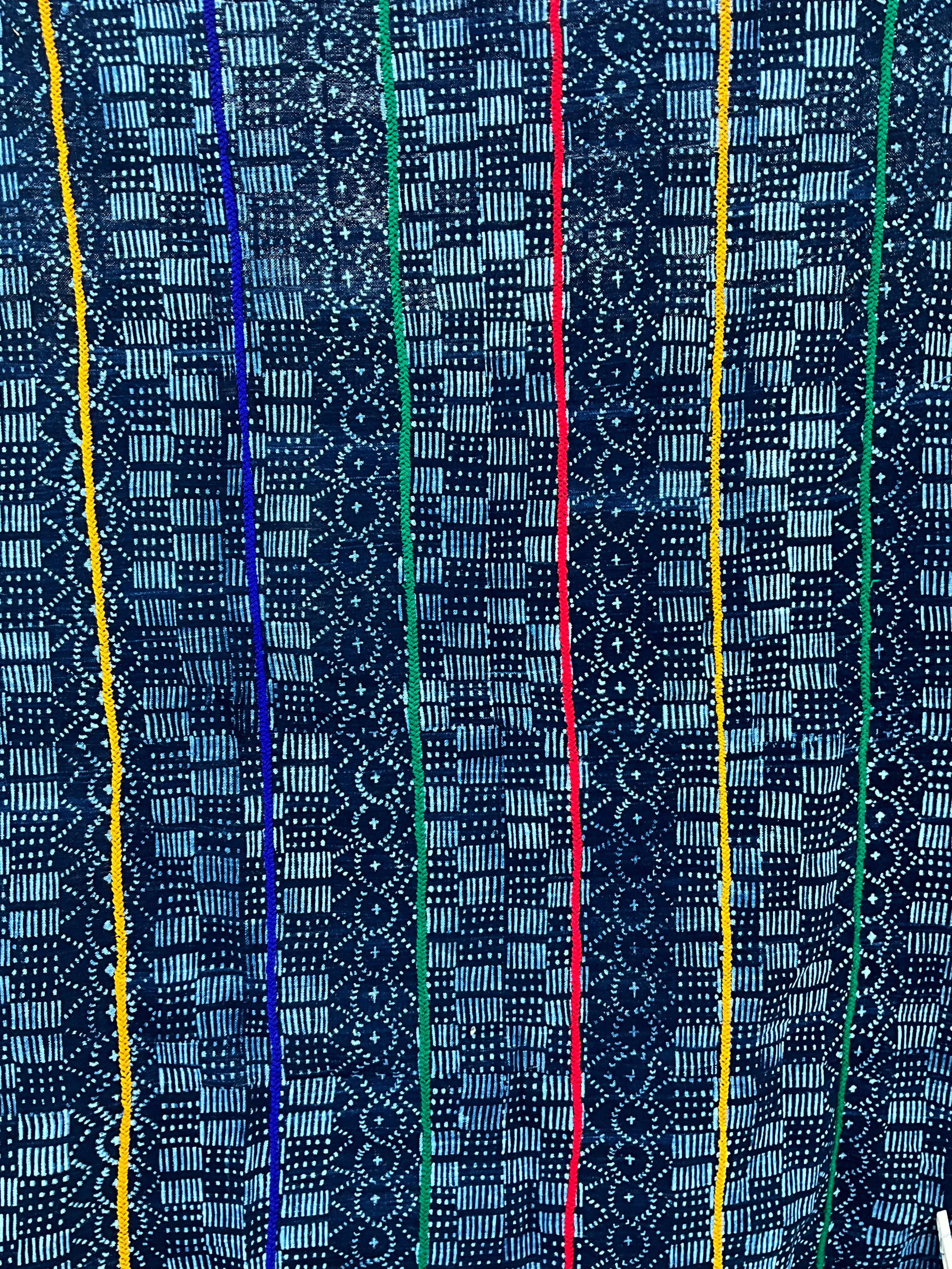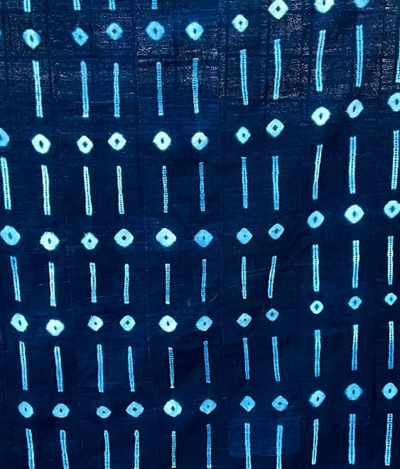 Handgewebte Streifen aus handgesponnener Baumwolle werden zuerst zu Paneelen zusammengenäht. Dann gibt es zwei Methoden, um Designs auf dem Stoff zu erstellen. Die erste ist die Batikmethode, bei der Designs in den Stoff genäht werden; wenn fertig, wird der Stoff in natürlichen Indigo getaucht. Nach dem Trocknen werden die Fäden geschnitten, um das endgültige Design zu enthüllen. Die zweite Methode verwendet handgefertigte Schablonen oder Stempel, um Wachs in den Stoff zu imprägnieren, bevor er in den Indigo getaucht wird. Der einfachste Weg, um festzustellen, welche Methode verwendet wurde, besteht darin, die Rückseite des Paneels anzusehen und zu sehen, ob das Design sichtbar ist. Wenn ja, ist es die Batikmethode. Diese Paneele haben viele Verwendungen in Westafrika: Kleidung, Kopftücher, Babytragen usw. Indigo gehört zur Familie der Hülsenfrüchte. Abmessungen: 60" x 44"