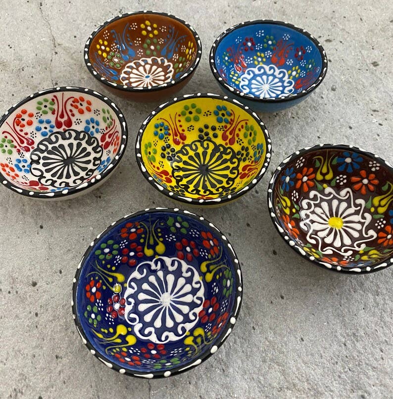 Bringen Sie die Schönheit türkischer Handwerkskunst in Ihr Geschäft mit unseren exquisiten 3-Zoll-Türkischen Çini-Schalen. Jede Schale ist eine atemberaubende Mischung aus Tradition und Funktionalität, handgefertigt von erfahrenen Kunsthandwerkern und entworfen, um zu begeistern. - **Authentisches Design**: Verziert mit lebendigen, handbemalten Çini-Mustern, inspiriert von der reichen künstlerischen Tradition der Türkei. - **Größe**: Kompakter Durchmesser von 3 Zoll, perfekt zum Servieren von Dips, Saucen, Snacks oder Gewürzen. - **Lebensmittelsicher**: Hergestellt aus hochwertiger Keramik, sind diese Schalen vollständig lebensmittelsicher und gewährleisten ein sicheres Esserlebnis. - **Spülmaschinenfest**: Für modernen Komfort entworfen, sind sie leicht zu reinigen und spülmaschinenfreundlich, ohne ihre lebendigen Farben zu beeinträchtigen. - **Vielseitige Verwendung**: Ideal für den täglichen Gebrauch, das Bewirten von Gästen oder um jedem Tischarrangement einen Hauch von kulturellem Charme zu verleihen. Versand am nächsten Tag bei den meisten Bestellungen!