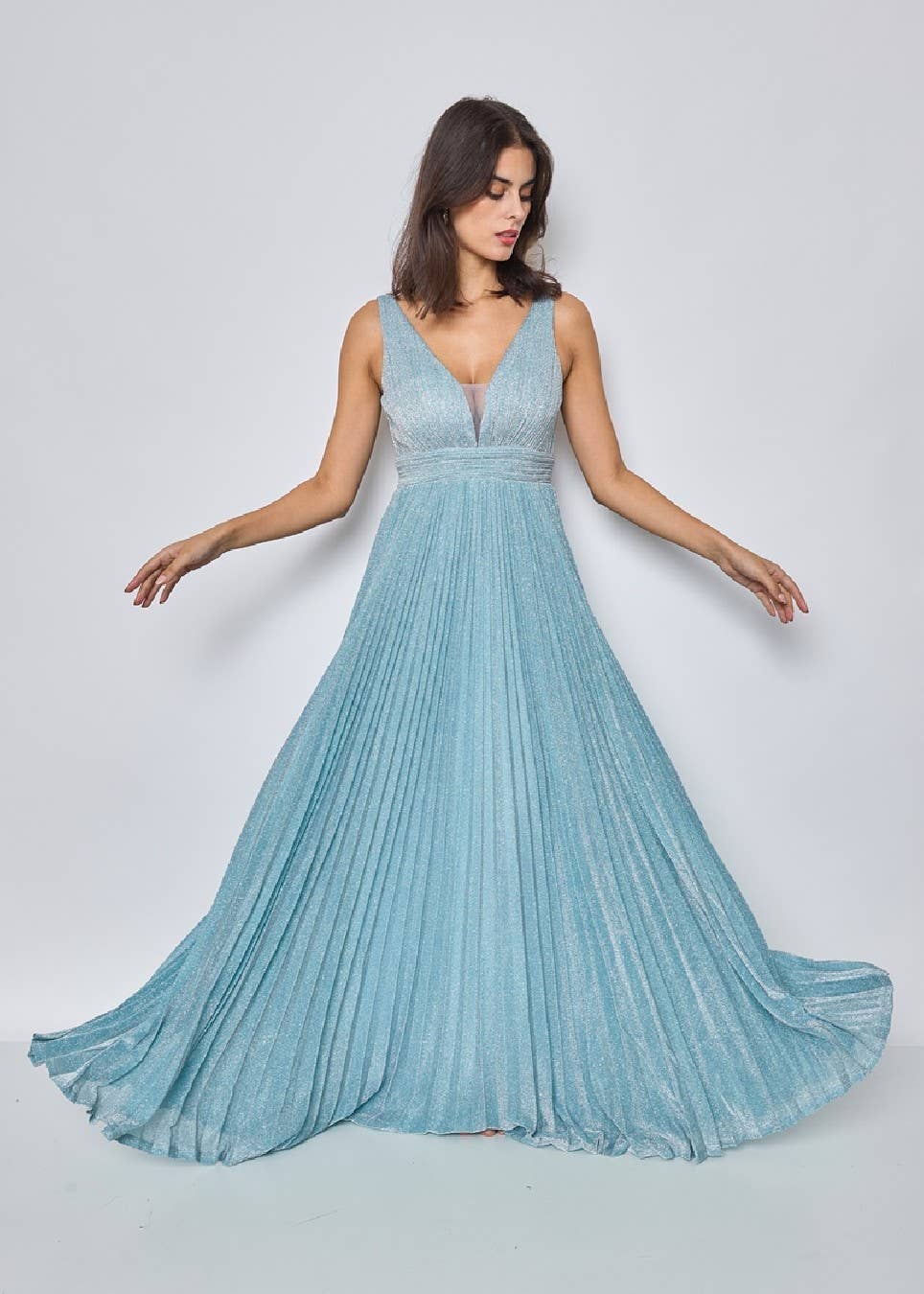 Langes Maxikleid in Übergröße mit Plisseefalten und glänzendem Stoff, offenem Rücken für einen eleganten Look.