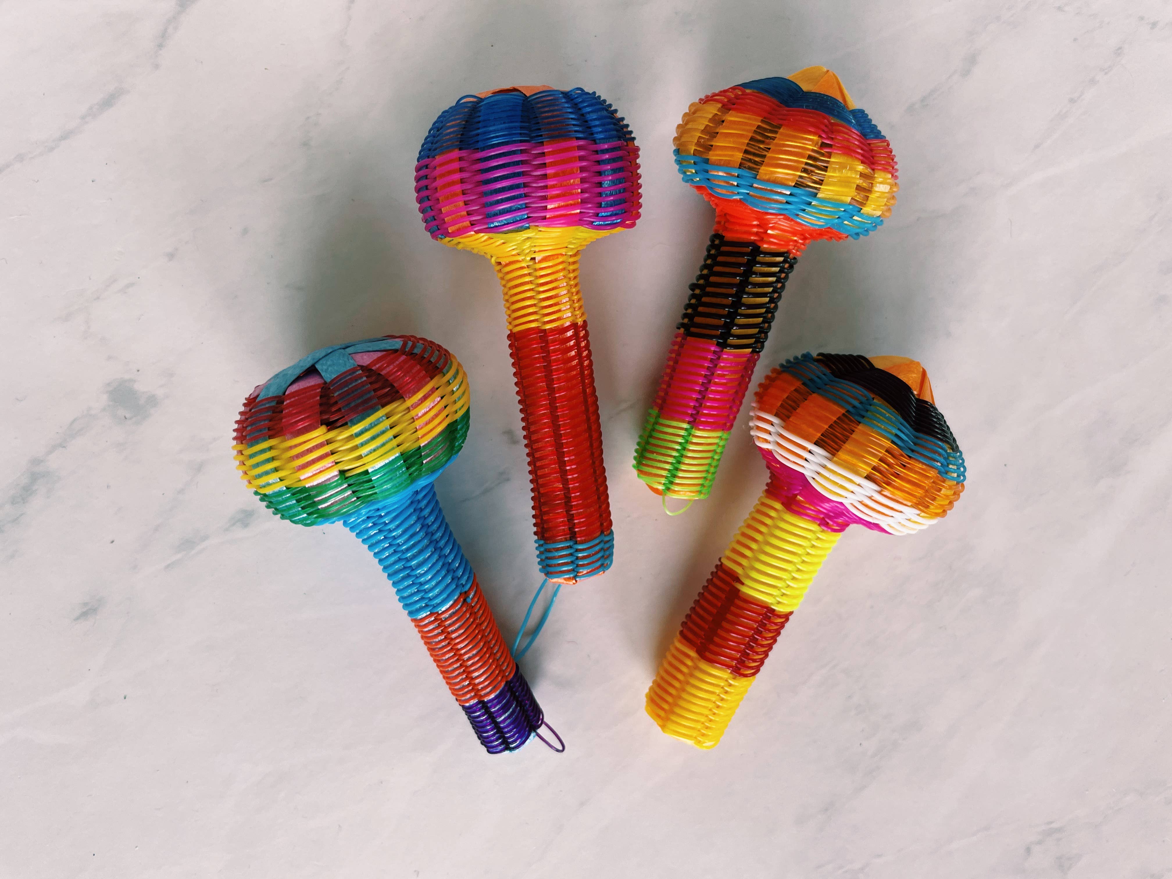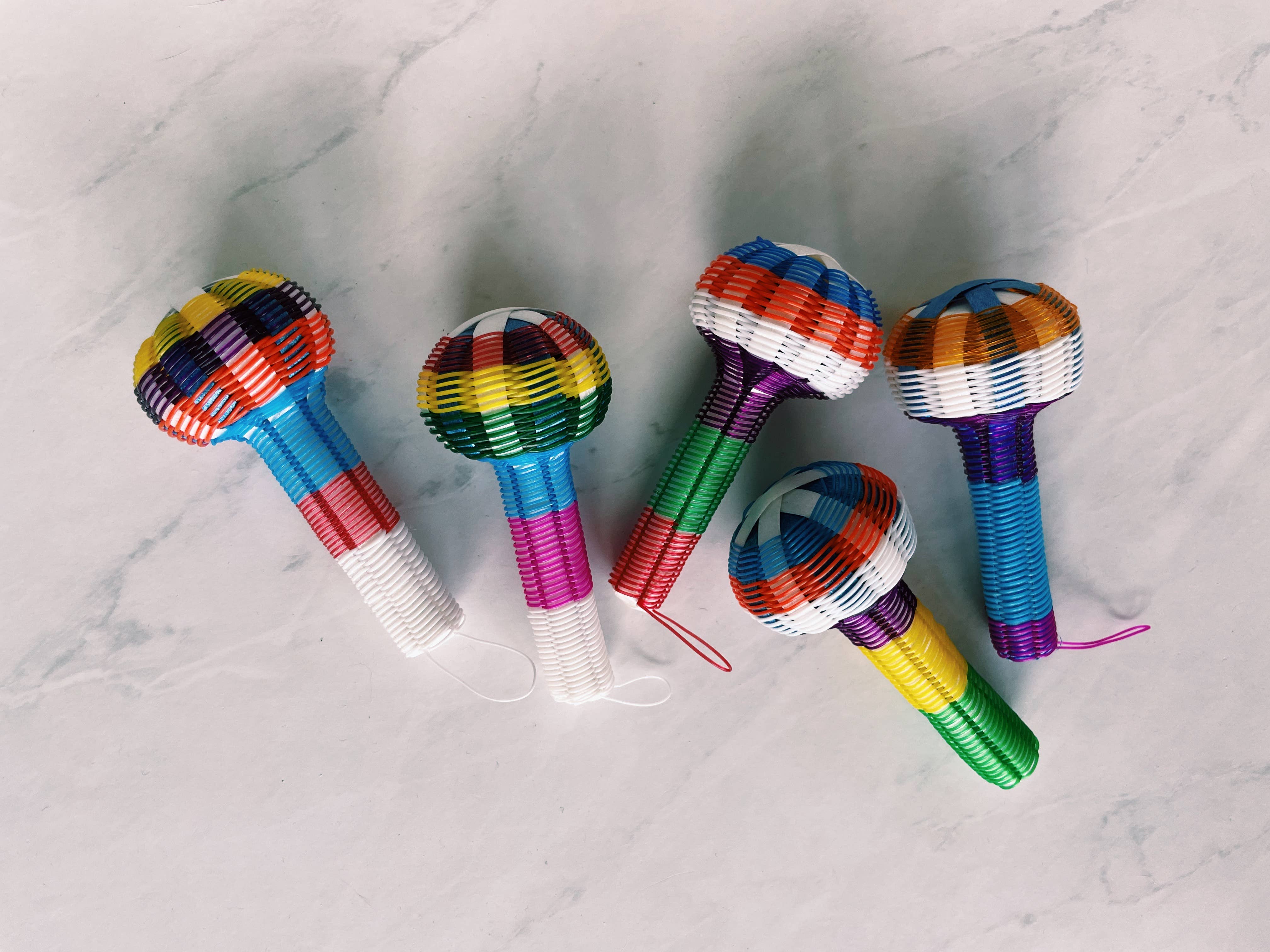Dieses bunte, sichere und spaßige Spielzeug hält Jung und Alt gleichermaßen unterhalten. Es ist handgewebt aus dünnem Kunststoffgarn und enthält eine Metallkugel im Inneren. Der Griff ist ebenfalls gewebt, damit das Baby das Spielzeug gut halten kann, und es gibt drei separate Rasseln. Man kann es auch am Kinderbett oder im Spielbereich des Babys aufhängen. Der Griff misst 5 cm im Durchmesser, die drei Rasseln sind jeweils 12,7 cm breit, und jede einzelne Rassel hat einen Durchmesser von 3,8 cm. Bitte beaufsichtigen Sie kleine Kinder jederzeit. Preisoptionen: Die Maracas können auch einzeln gekauft werden.