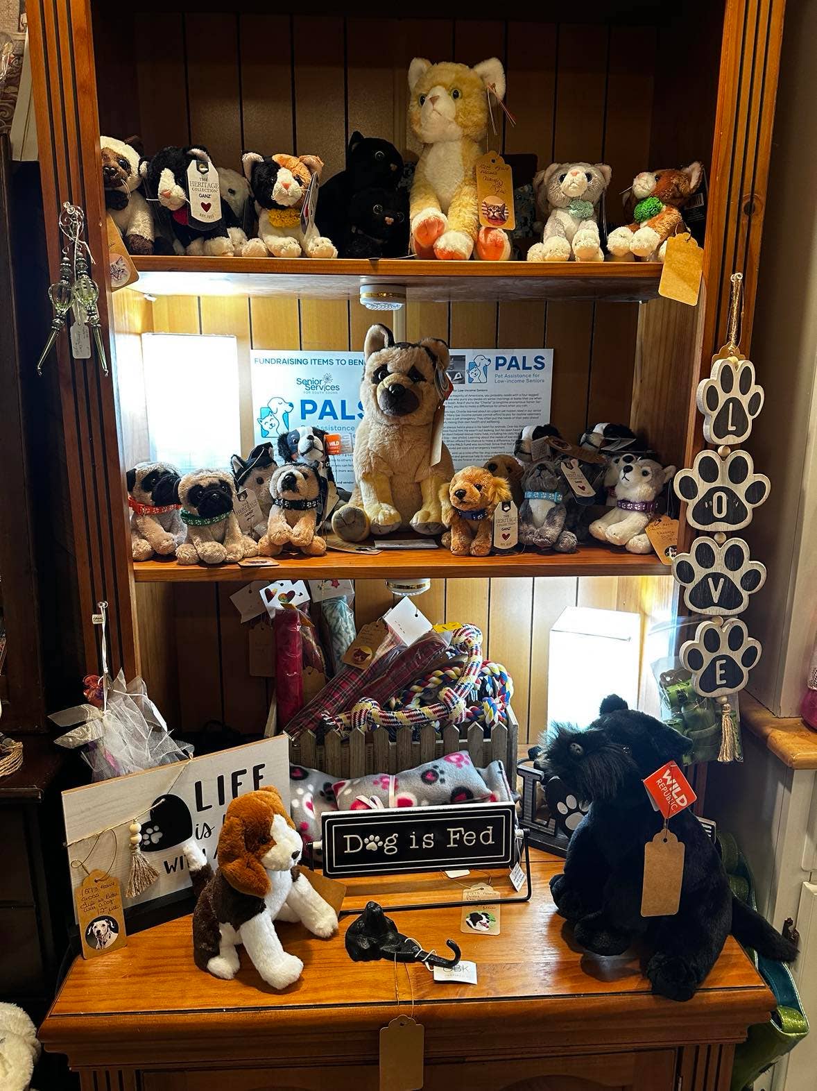 Ich habe kürzlich ein Projekt für unser gemeinnütziges Seniorenzentrum übernommen, wo ich ehrenamtlich arbeite. Eine unserer Abteilungen heißt Pals. Haustierhilfe für einkommensschwache Senioren. Da diese Abteilung ausschließlich auf Spenden angewiesen ist, ist es schwierig, die Bedürfnisse unserer Senioren zu erfüllen. Ich miete einen Raum in einem Antiquitäten- und Geschenkeladen und habe einen Bereich eingerichtet, in dem ich Plüschtiere und andere Haustierartikel verkaufe. Ich finanziere dies zu 100 % und spende 100 % der Einnahmen. Als ich den Verkauf und den Käuferrabatt sah, war es ein Geschenk Gottes.