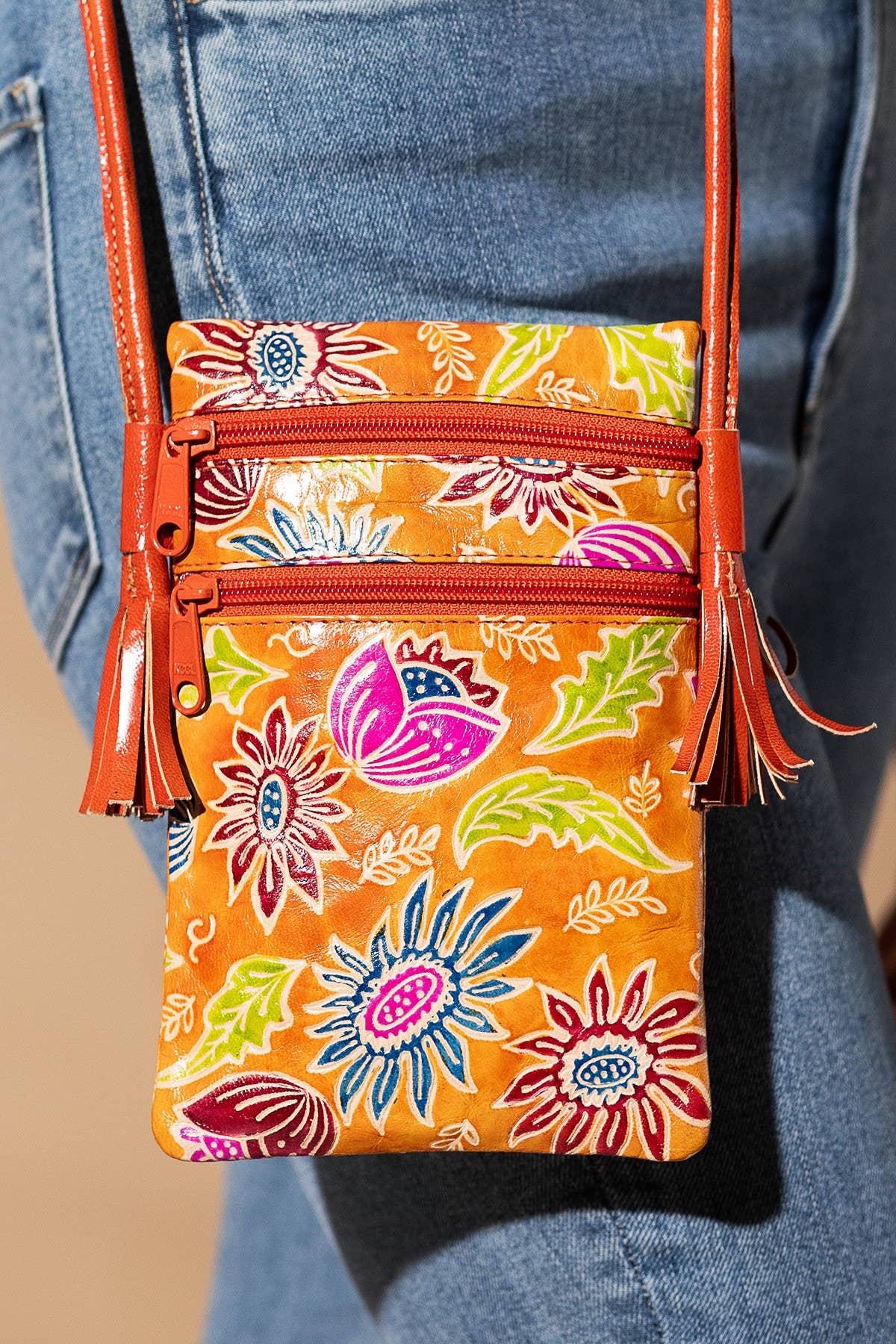 *Ruggine* Handbemalte Handytasche aus echtem Leder mit geprägtem Blumenmuster und eleganten Quastenakzenten. Diese einzigartige Tasche vereint handwerkliches Können mit praktischem Design und ist ideal, um stilvoll Ihre wichtigsten Dinge zu transportieren. *Außenmaterial: 100% Echtes Leder *Futter: 100% Polyester *CA. L 19,8 cm B 12,7 cm 0,16 kg *Hergestellt in Indien