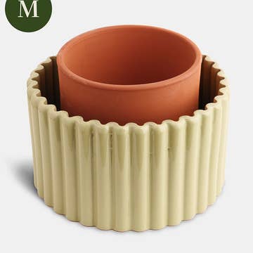 6,75”b x 4,25”h Auf der Töpferscheibe gedrehtes Steinzeug, unglasiert, um den Austausch von Wasser und Sauerstoff zu ermöglichen. Quarzit-Tonmasse reicht von cremeweiß bis hellgrau. Integriertes Abflussloch und passender Untersetzer inklusive. Alle Stücke sind mit unserem Herstellerstempel handgestempelt.