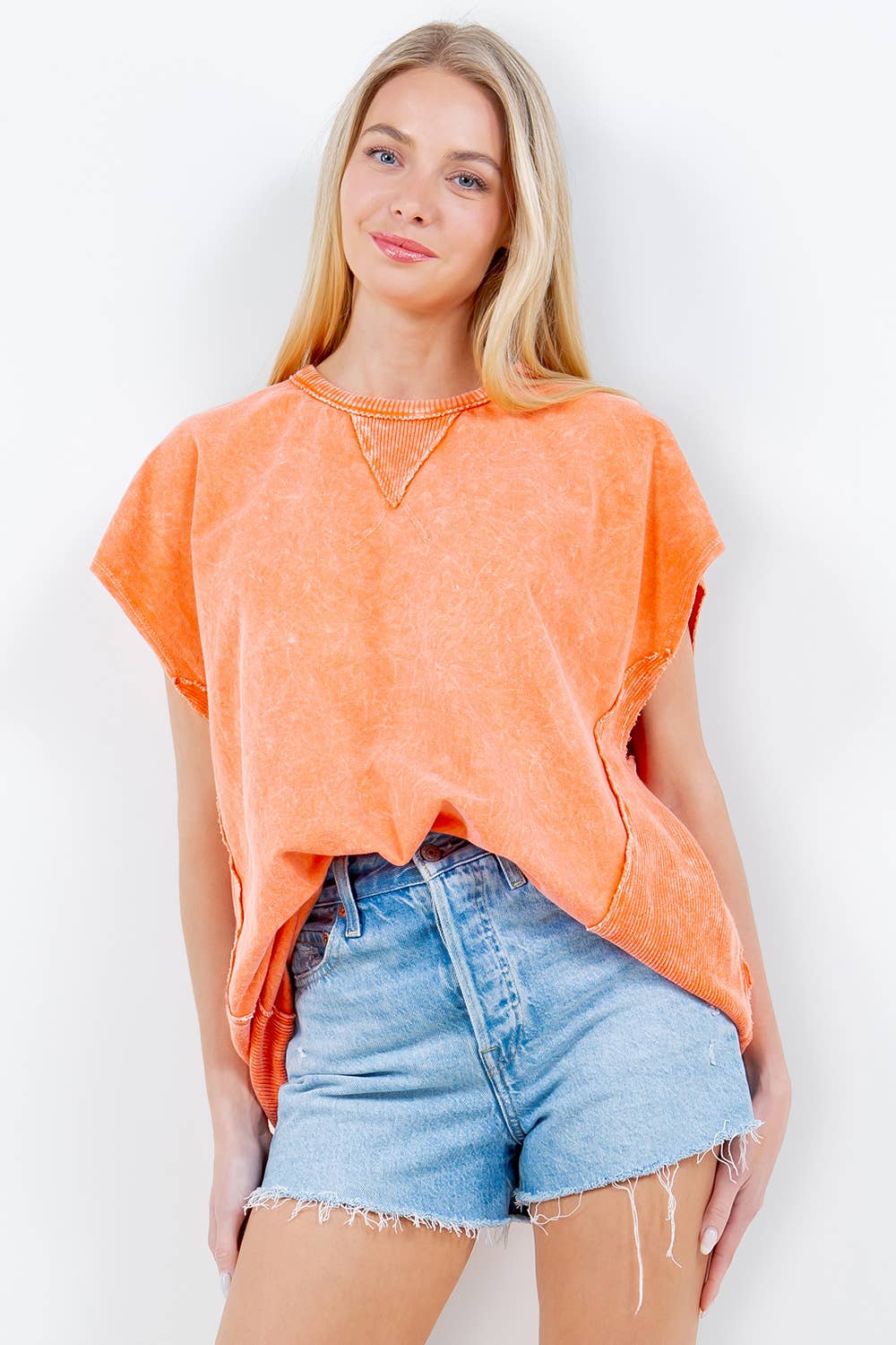 Mineral Wash Vintage-Top mit Rundhalsausschnitt und Fransen HT4000 im Großhandel