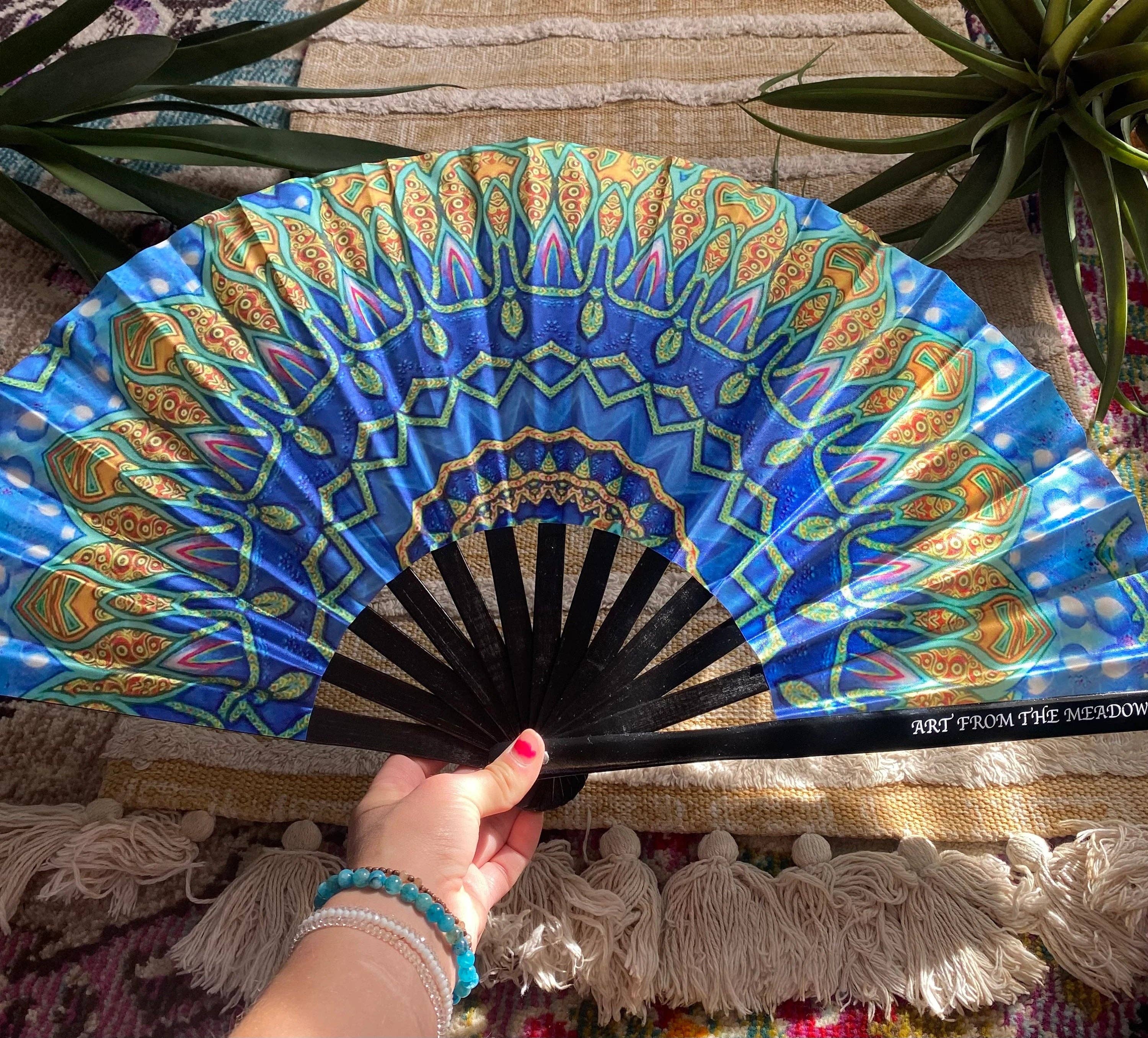 Feen-Göttin-Festival-Fächer – Bambus-Handfächer, UV-reaktiv, leicht und langlebig, entworfen von Justin Chamberlain, Enlighten Clothing Co.