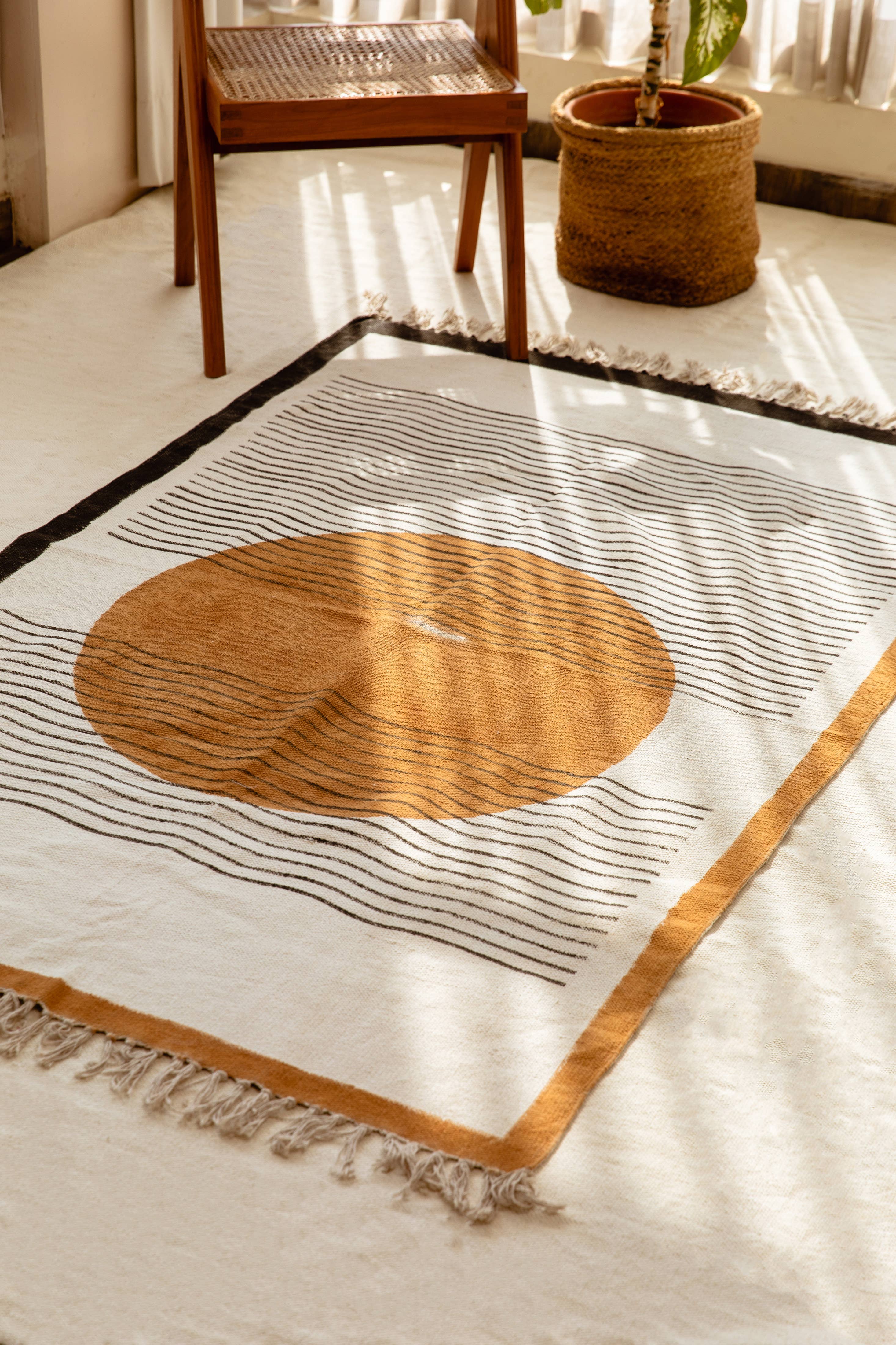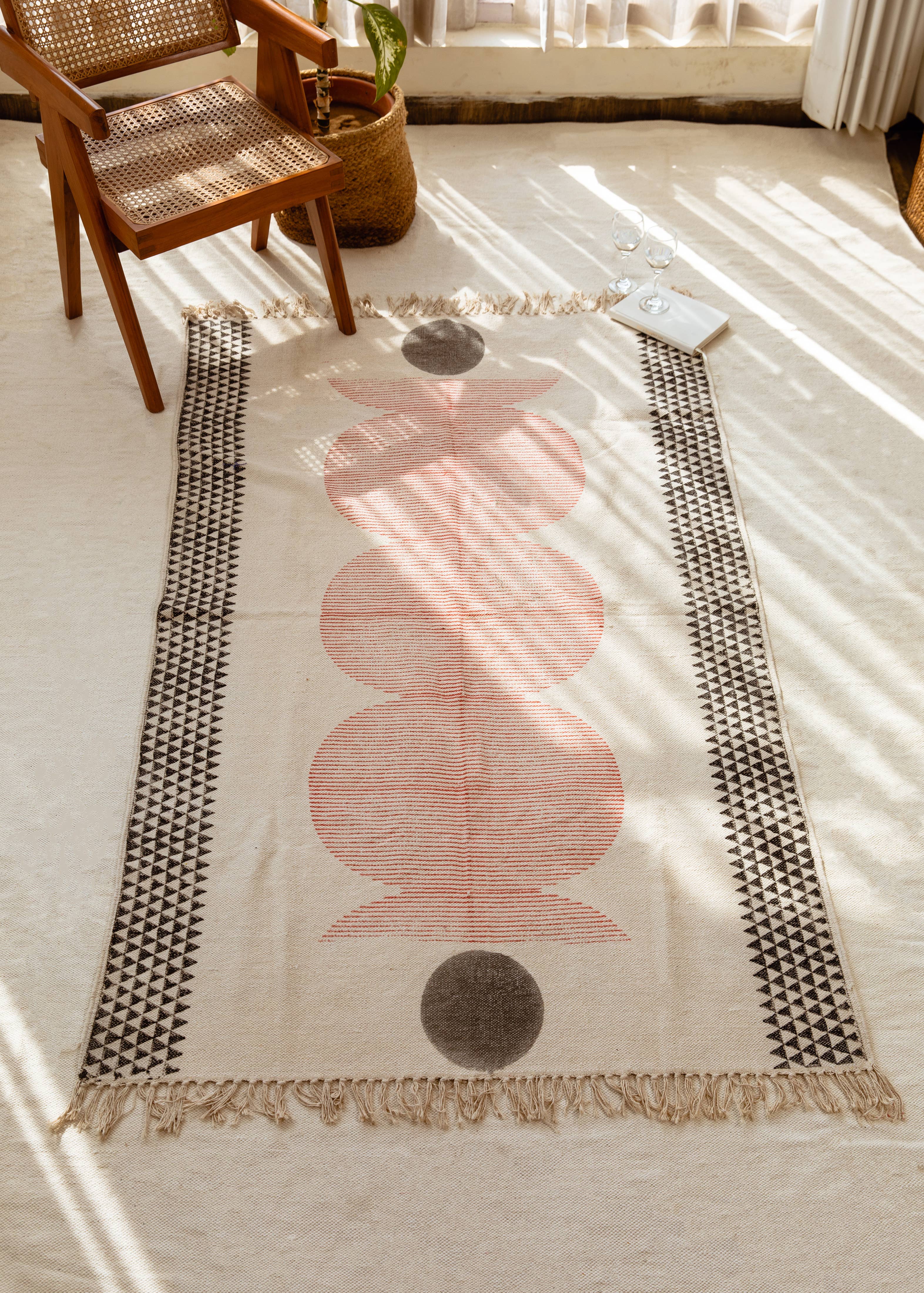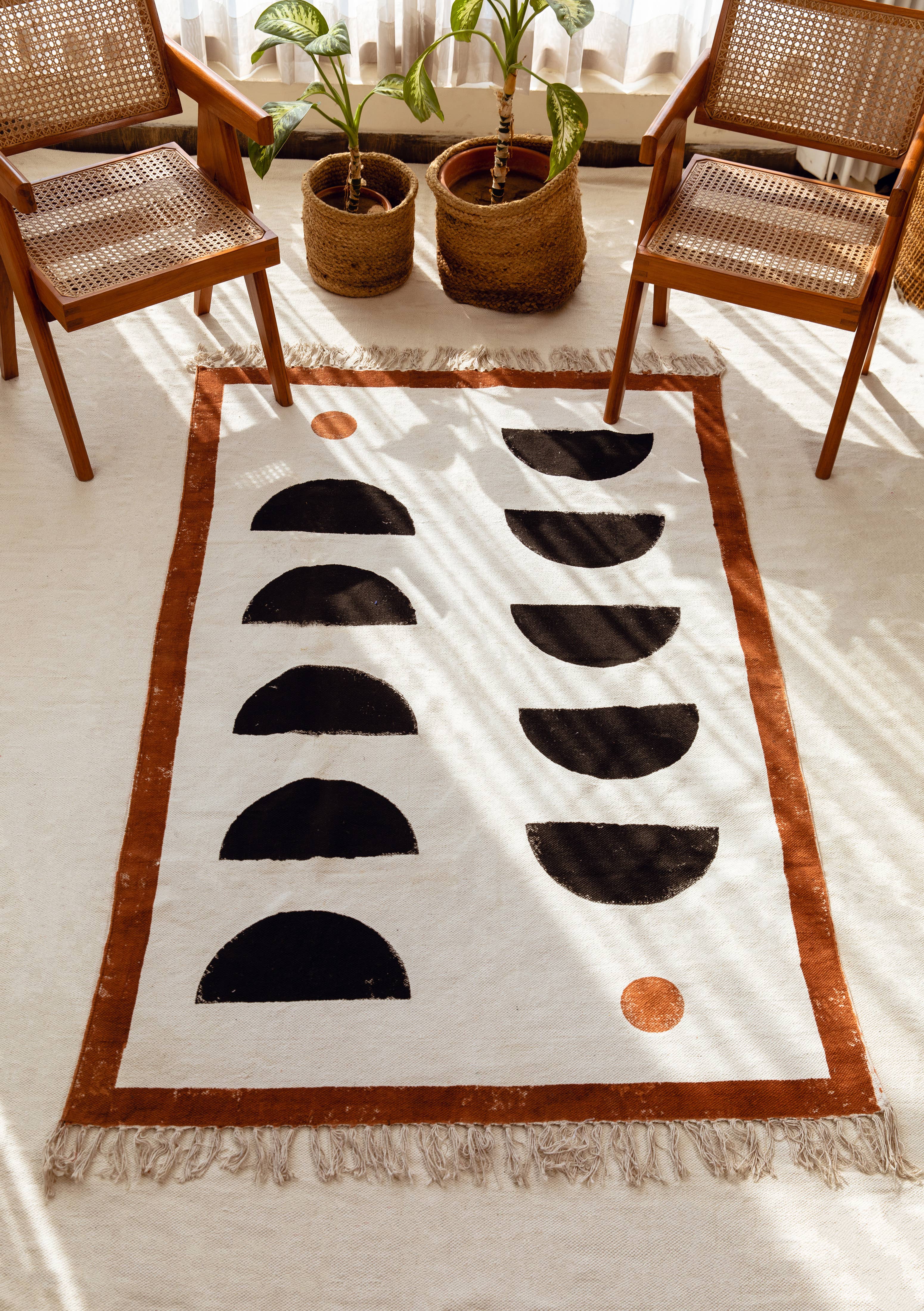 Der Prozess: Jeder Teppich ist handgefertigt und erfordert die Aufmerksamkeit von 4 verschiedenen Handwerkern, darunter Holzschnitzer, Blockdrucker, Weber und Farbspezialisten. Das Design wird mit handgeschnitzten, in Farbstoffen getauchten Holzblöcken von Hand auf jeden Teppich gepresst. Alle Teppiche werden in kleinen Chargen hergestellt. Aufgrund der handwerklichen Beschaffenheit dieses Artikels erwarten Sie leichte Abweichungen im Erscheinungsbild jedes Einzelstücks. Angaben zum Produkt: 100% Baumwolle Hergestellt in Indien Schiffe aus Kalifornien Abmessungen: 4' x 6'