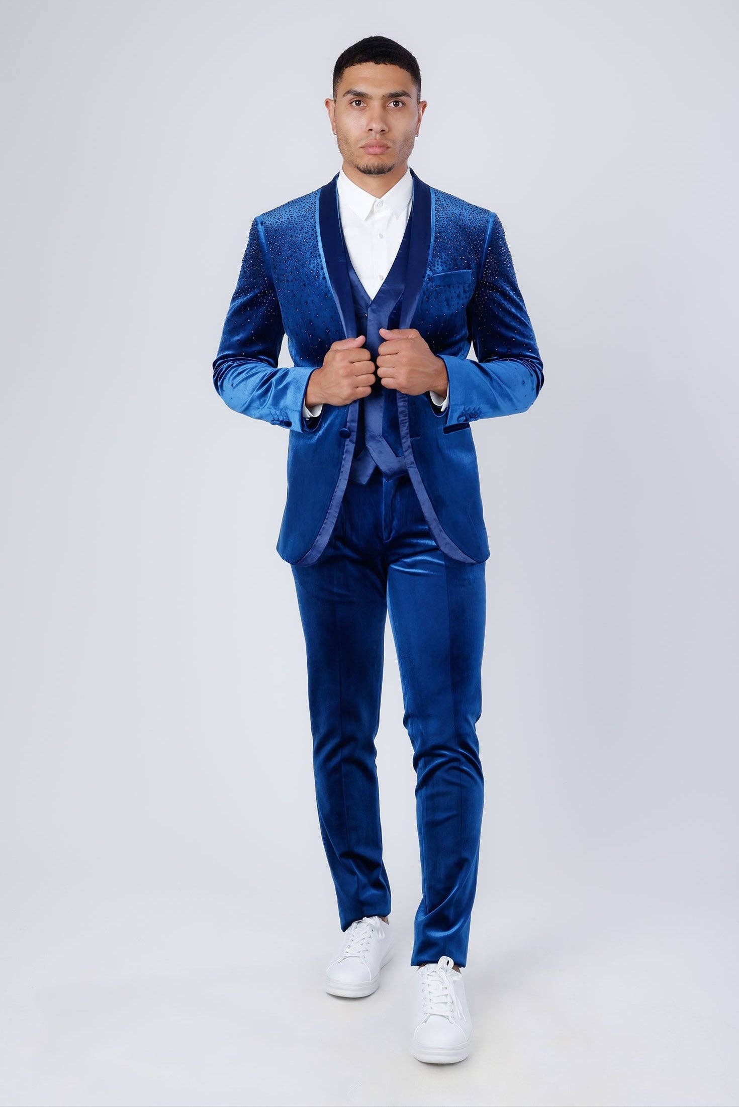 Einzelheiten: * Barabas-Signaturanzug * Schmale Passform: Schnitt mit schmalem Punkt-zu-Punkt-Schulterumfang und höheren Armlöchern * Samtstoff * Passende Samthose im Lieferumfang enthalten * Peak Reverskragen * Leistentasche auf der Brust * Pattentaschen * Zwei vordere Knopfverschlüsse * Manschetten mit vier Knöpfen * Blazerlänge: Regulär Material und Pflege: * 100% regenerierte Faser * Nur chemisch reinigen Informationen zur Verpackung: * Auf Lager, Sie können jede Größe bestellen, die Sie benötigen
