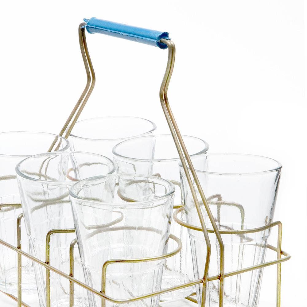 Dieses Chaigestell mit Gläsern, wie es von Straßenverkäufern verwendet wird, ist ein unverzichtbarer Teil des Alltagslebens in Indien! Verwenden Sie es zum Servieren von Chai, Saft und anderen Getränken. Set mit 4 großen Gläsern im Gestell. Die Gläser sind 14,6 cm (5,75 Zoll) hoch und fassen jeweils 295,73 ml (10 fl oz). Hergestellt in Gujarat, Indien.