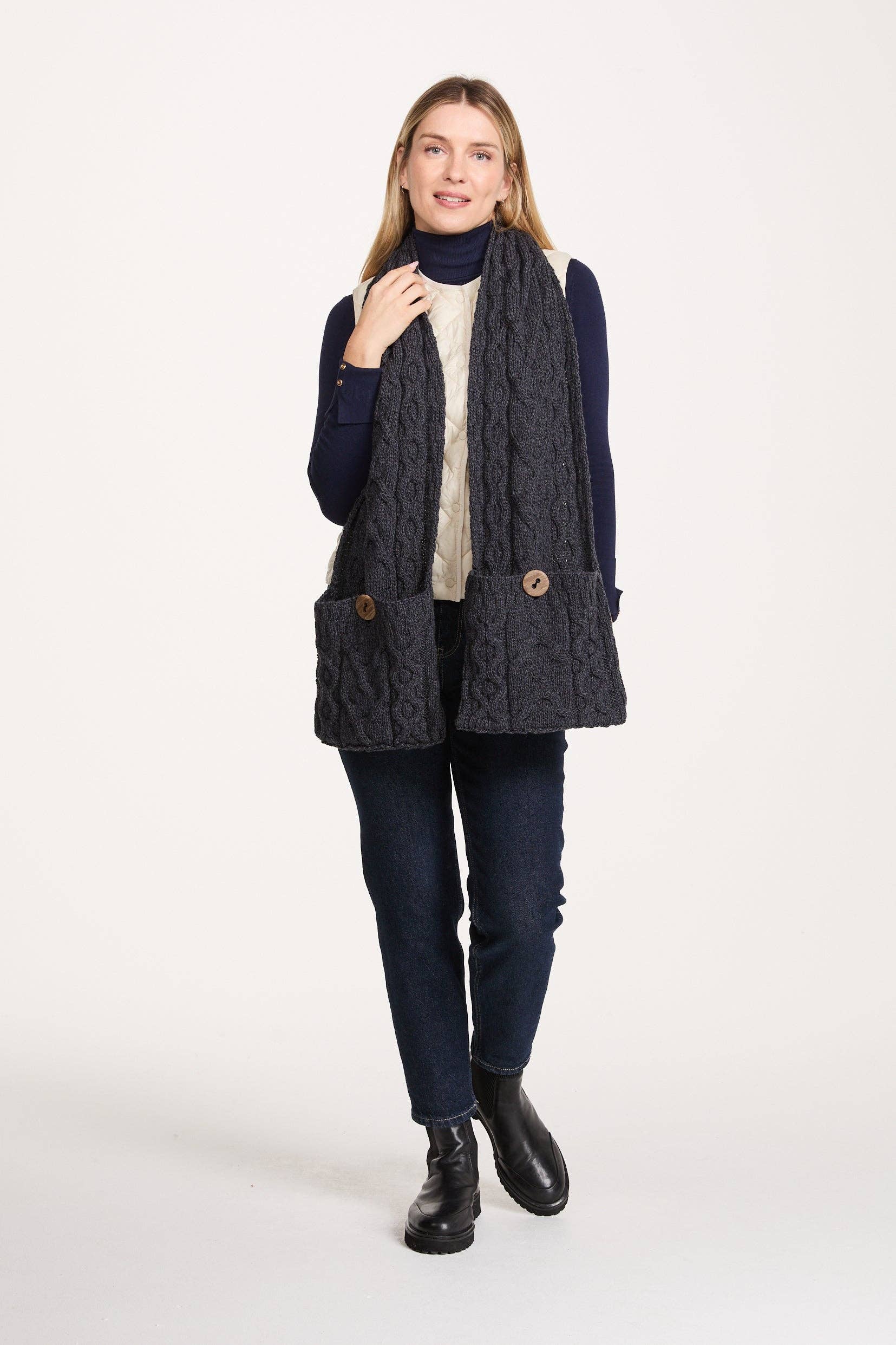 Der Corrib Crossover Aran Schal ist ein raffiniertes Kleidungsstück, das Sie warm, gemütlich und modisch hält. Er kombiniert elegant dicke und normale Kordelstrickmuster mit einem strukturierten, gewaffelten Rückenteil, das mit Knöpfen versehen ist. Dieser Schal verleiht einfachen Outfits eine wunderschöne Textur. Der Corrib Crossover Aran Schal besteht aus 100 % Merinowolle und verfügt über vier Knöpfe mit einer reizvollen, strukturierten Oberfläche, die ein Verschließen auf der linken Rückseite ermöglichen. Eine einzigartige und moderne Interpretation der zeitlosen Aran-Tradition. Passform: Standardbreite und -länge. Model trägt: Größe S, Körpergröße 1,78 m.