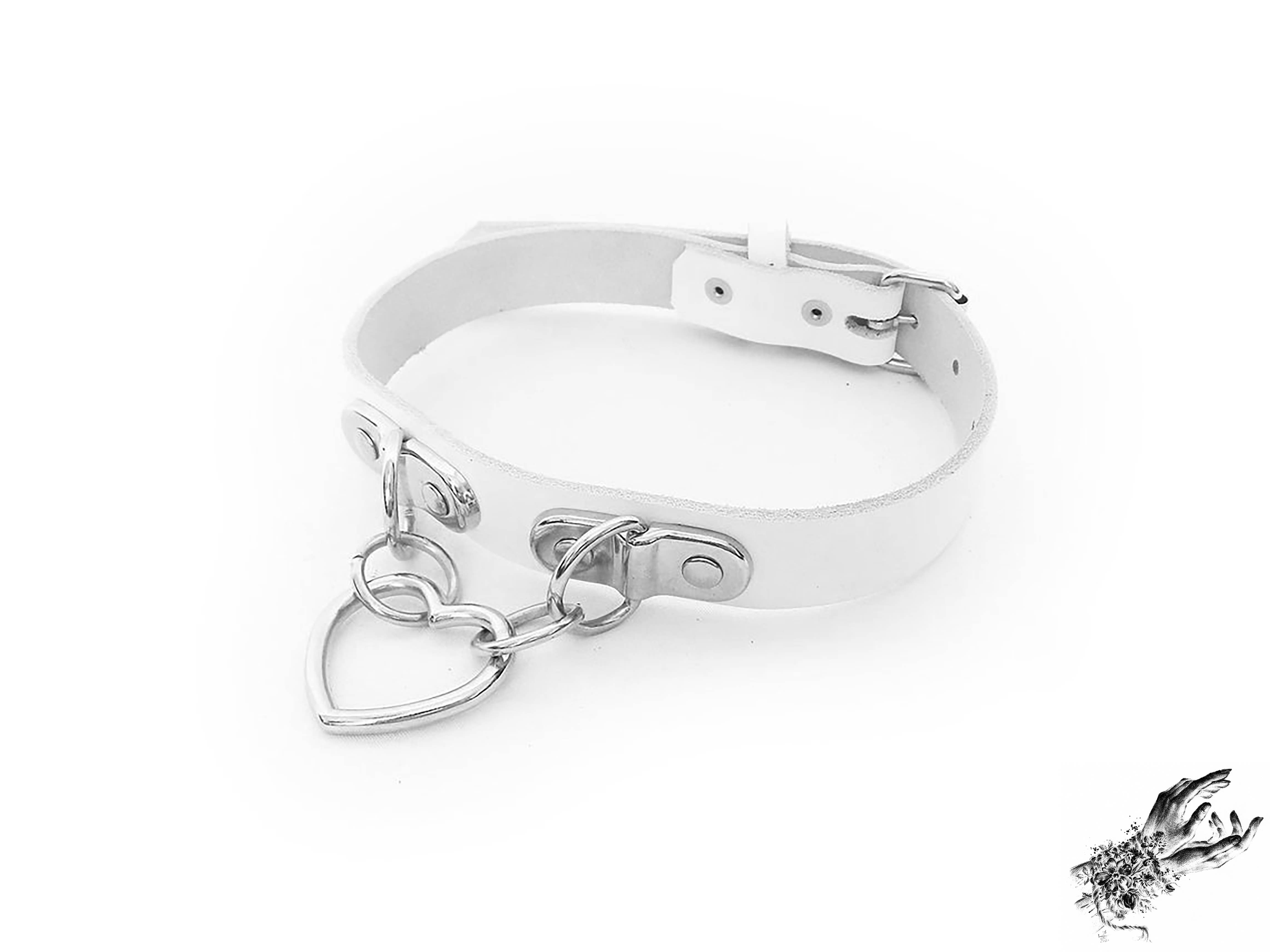 Dies ist ein rosafarbenes Lederhalsband mit einem silbernen herzförmigen Ring in einem klassischen und dennoch unverwechselbaren Design. Dieses rosafarbene Herzringhalsband aus Leder ist ein süßes alternatives Geschenk für pastellfarbene Gothic-, Kawaii-, E-Girl-, Harajuku- und andere alternative Modestile. Das pinke Herzringhalsband eignet sich sowohl für Mode als auch zum Spielen. Hergestellt aus echtem Leder, hergestellt in England, mit einem Herzring und Beschlägen aus Edelstahl. Das Halsband ist verstellbar und passt von 32 cm (12,5 Zoll) bis 42 cm (16,5 Zoll). Wir akzeptieren auch Sondergrößen. Bitte geben Sie Ihren Halsumfang im Bereich „Hinweis für Verkäufer“ an der Kasse an, wenn Sie eine benutzerdefinierte Größe von bis zu 20 Zoll ohne zusätzliche Kosten wünschen. Wir akzeptieren auch individuelle Anpassungen bei diesem Design, wie z. B. das Hinzufügen von Nieten, einem Anhänger, der am Herzring hängt, einer abschließbaren Schnalle oder persönlich gravierten Haustiermarken gegen einen geringen Aufpreis. Bitte kontaktieren Sie uns vor dem Kauf für eine individuelle Gestaltung.