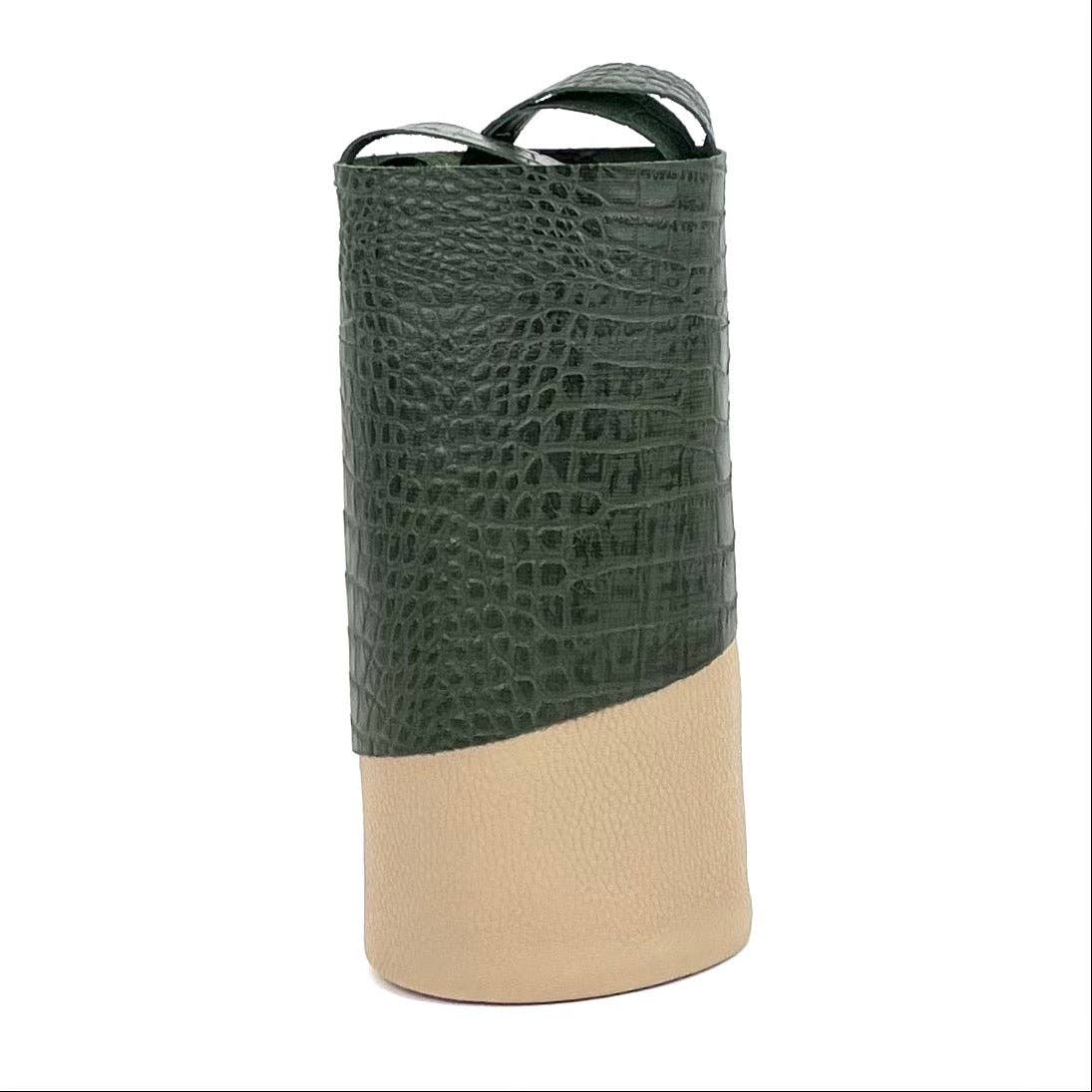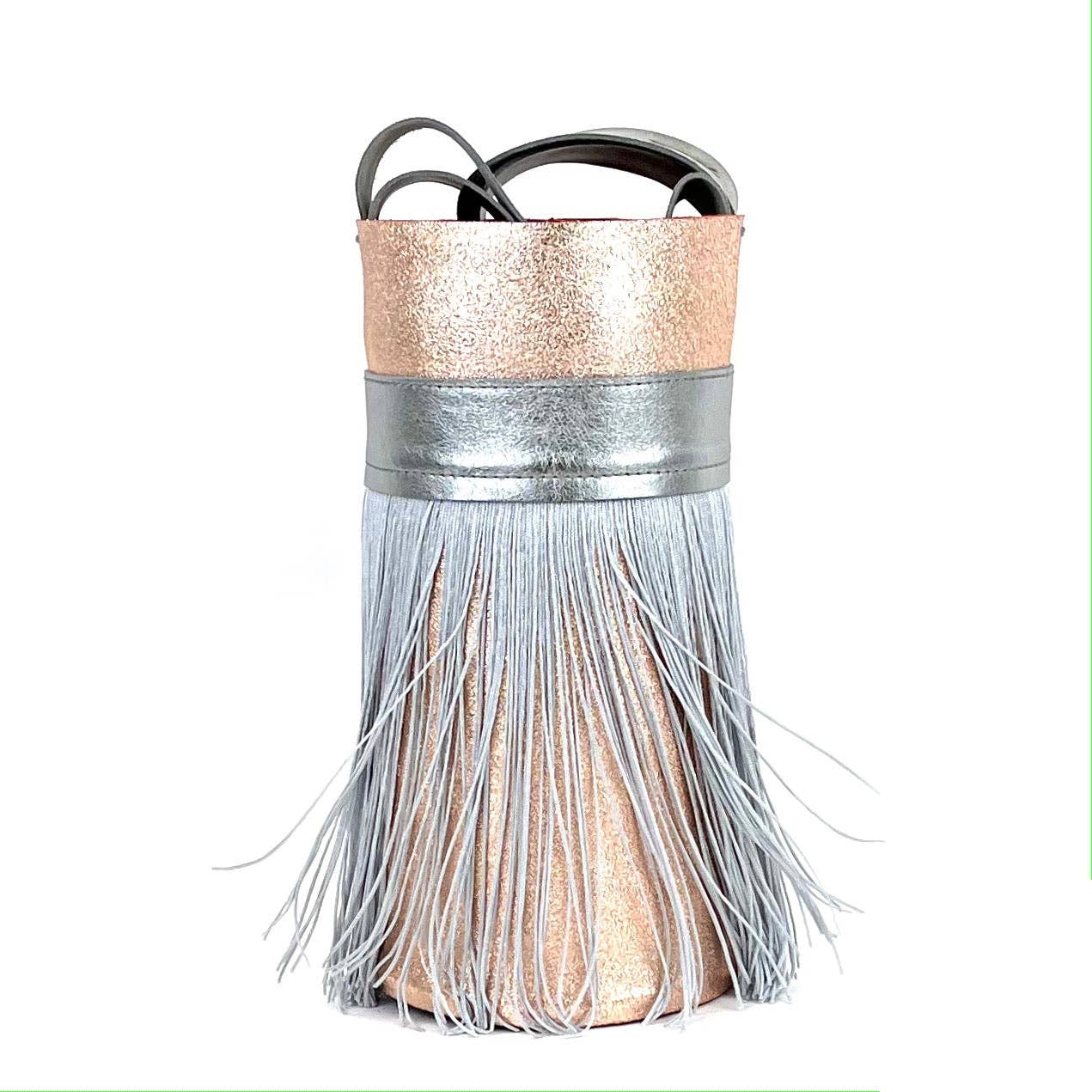 Minicubo Modelltasche aus roségoldenem Leder mit Risseffekt, Anwendung auf kurzen Haaren und erneut ein roségoldenes Leder mit Risseffekt, Basis aus champagnerfarbenem Leder mit Risseffekt. Der Griff ist aus braunem Leder gefertigt. Handgefertigtes, exklusives Design, keine zwei sind gleich. Maße: Höhe 28 cm, Durchmesser der Basis 13 cm, Länge des Griffs ca. 98,5 cm. Trotz ihrer Abmessungen hat diese Taschengröße ein großes Fassungsvermögen. Es kann gekreuzt oder an einer Schulter aufgehängt getragen werden. „Unvollkommenheit macht sie einzigartig.“