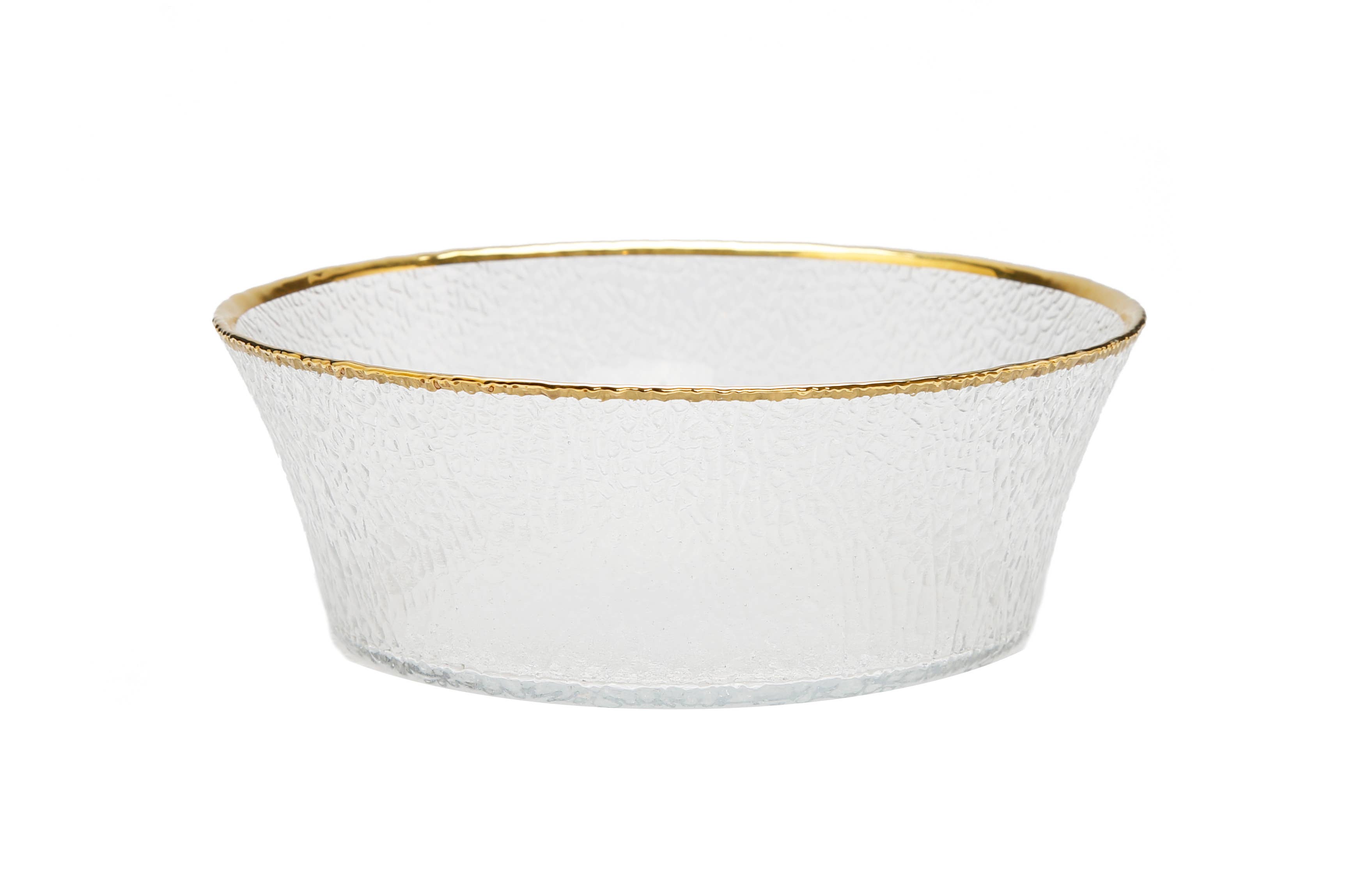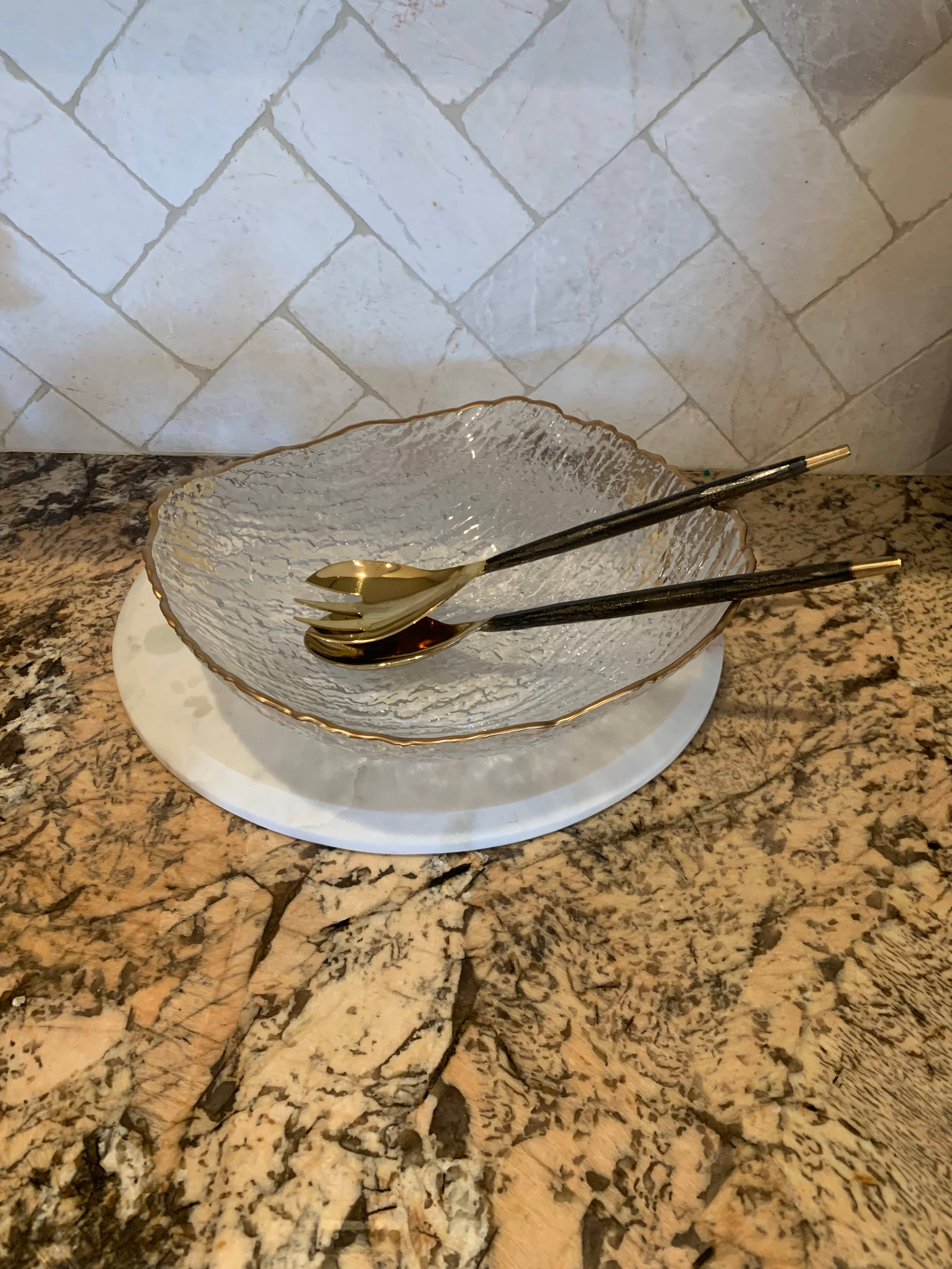 Diese Salatschüssel wurde aus feinem Glasmaterial gefertigt und mit einer kräftigen Goldverzierung verziert. Seine schöne Form, Größe und sein Design machen es ideal für jeden Anlass. Egal, ob Sie es alleine ausstellen oder mit seiner erweiterten Kollektion kombinieren möchten, diese Schale wird Ihren gedeckten Tisch wirklich aufwerten. Maße: 11" D