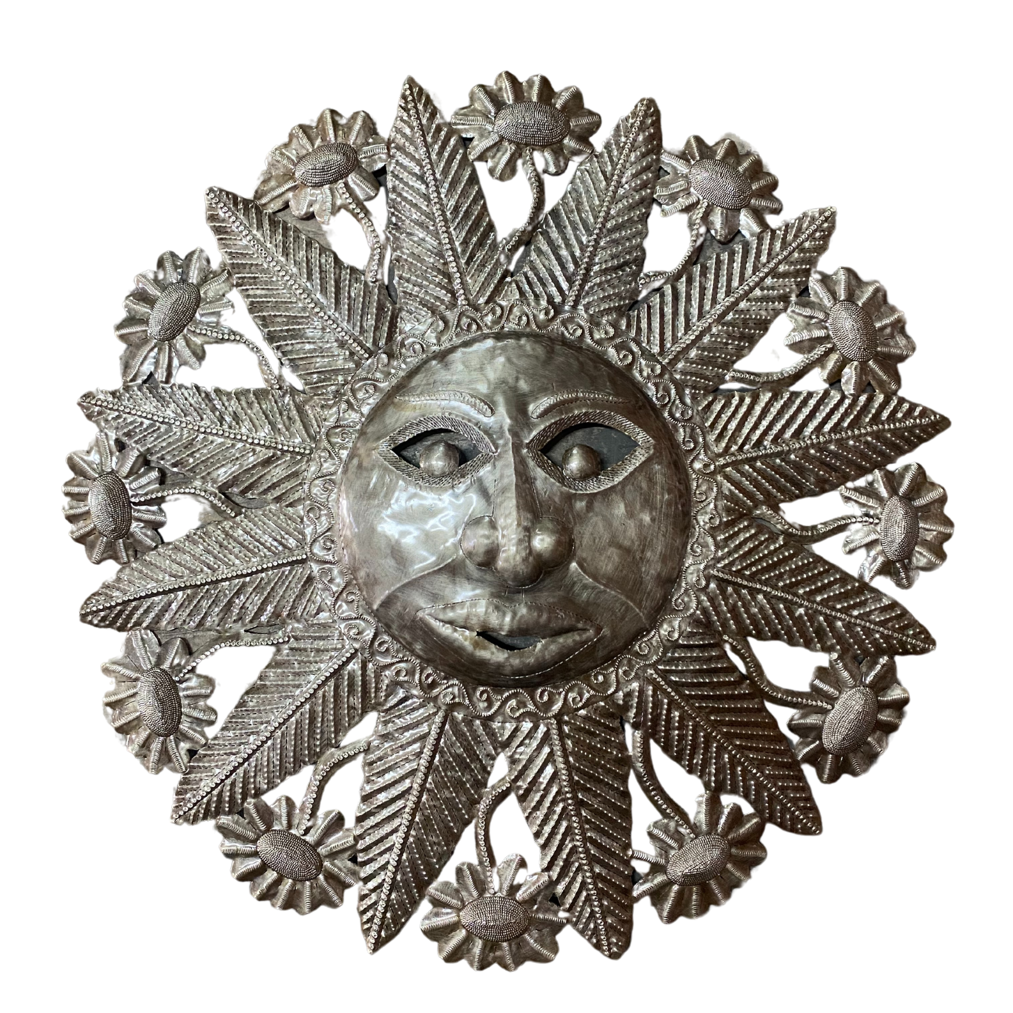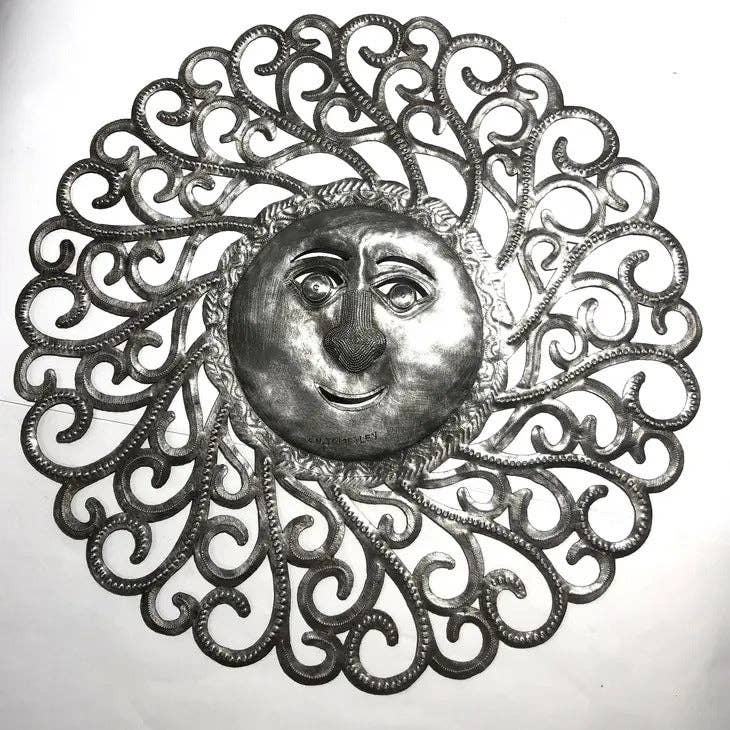 Glorious Sunshine ist ein Metallkunstwerk mit Sonnenmotiven, das sich zu entfalten scheint, einzigartig mit lockigen Strahlen, die sich zu entfalten scheinen. Es eignet sich sowohl für den Innen- als auch für den Außenbereich als Dekoration. Das perfekte dekorative Metallkunststück für die Terrasse oder den Gartenbereich Ihres Hauses. * Von der Fair Trade Federation zertifizierte haitianische Metallkunst aus Stahl * Beschichtet mit einem schützenden Glanzlack * Abmessungen: 32 Zoll x 32 Zoll - *Bitte beachten Sie, dass dieser Artikel in Übergröße erhältlich ist* * Handgefertigt im Village Artistique de Noailles in Croix-des-Bouquets, Haiti, von haitianischen Metal-Künstlern Die haitianische Metallkunst, eine Volkskunst, die bis in die Mitte des 20. Jahrhunderts zurückreicht, ist heute die Kunst, weggeworfene Stahlölfässer zu recyceln und in kunstvolle Metallkunstwerke umzuwandeln. Da es sich um handgefertigte haitianische Metallkunst handelt, kann es von einem Stück zum anderen leichte Abweichungen geben, was den einzigartigen Charakter und Wert jedes Metallkunstwerks verstärkt.