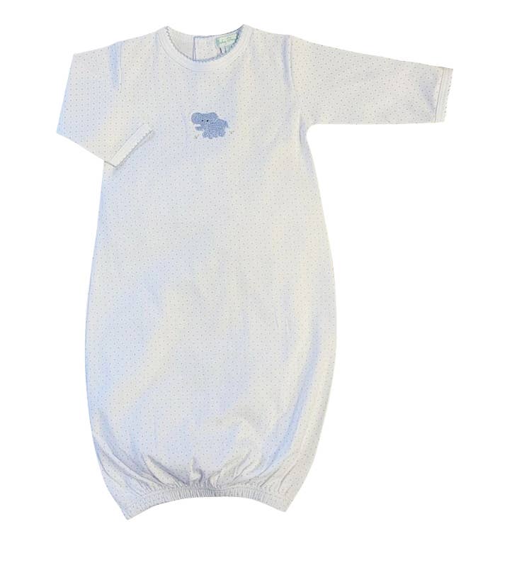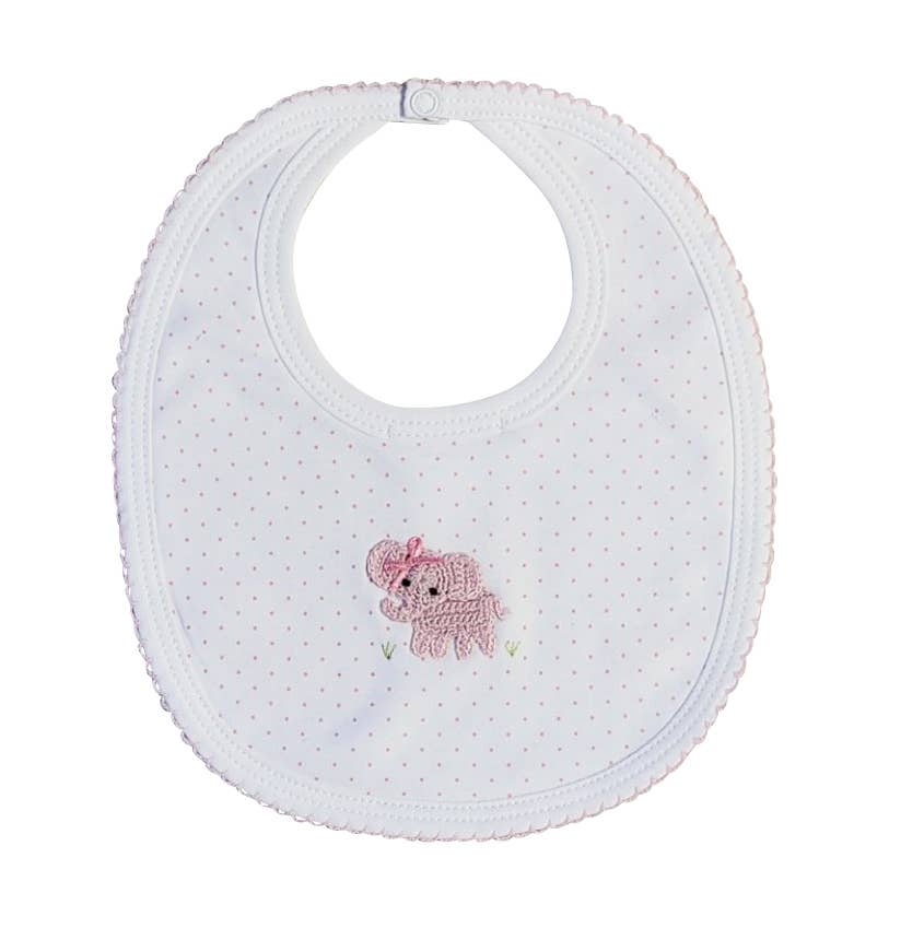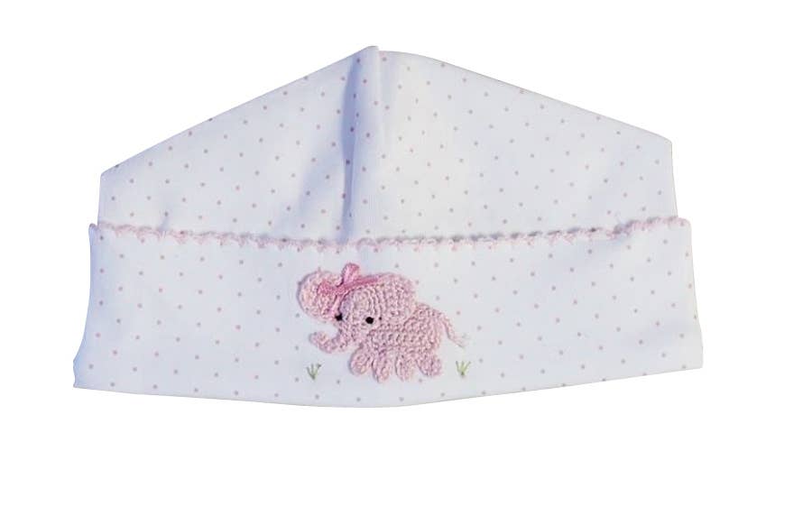 Dieses sehr weiche Kleid besteht aus 100% Pima-Baumwolle. Es hat überall rosafarbene Tupfen und pinke Borten am Kragen und an den Ärmeln. Es hat eine rosafarbene handgehäkelte Elefantenapplikation. 100% Pima-Baumwolle Maschinenwäsche, trocknergeeignet