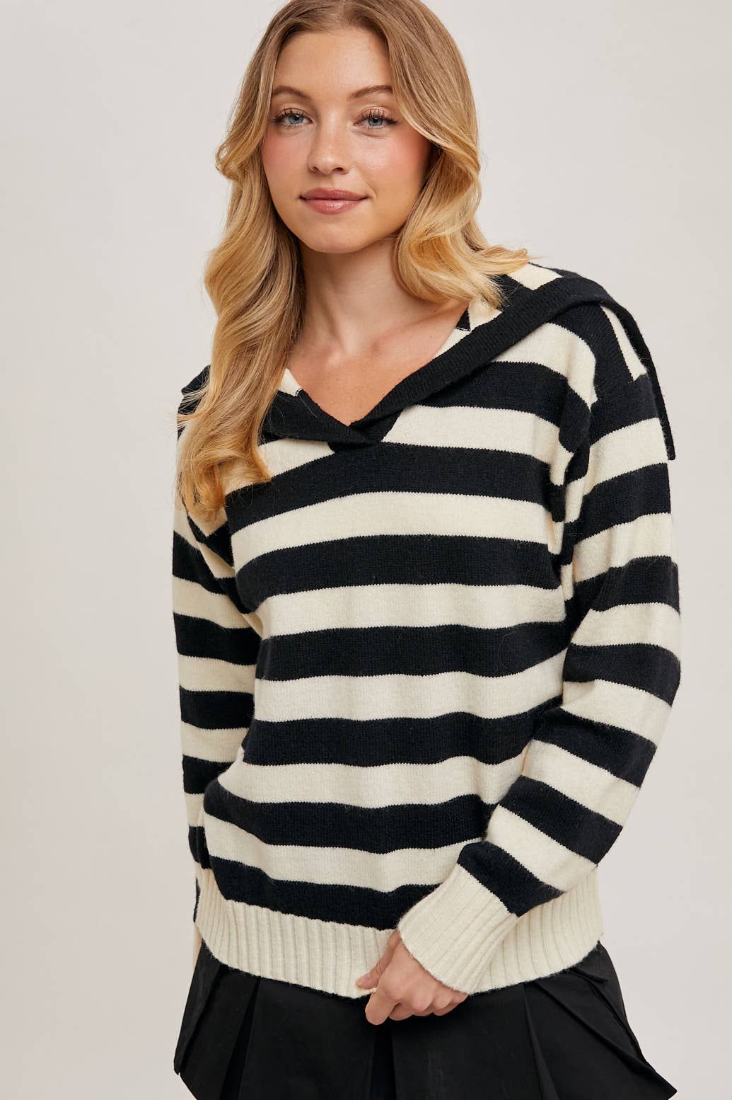 Das gestreifte Strickpulloverkleid mit Rollkragen ist ein schickes und kuscheliges Stück, perfekt für kühleres Wetter. Es verfügt über ein hohes Rollkragendesign, das Wärme und einen eleganten Look bietet, während die kräftigen Streifen für einen stilvollen und modernen Touch sorgen. Der Strickstoff sorgt für eine bequeme, dehnbare Passform, die dem Körper schmeichelt, und die Länge des Kleides macht es vielseitig genug, um es alleine oder im Lagenlook mit Strumpfhosen oder Leggings zu tragen. Dieses Pulloverkleid ist ideal für lässige Ausflüge oder elegante Anlässe und vereint mühelos Stil und Komfort. -Das Model ist 1,80 m groß und trägt Größe S/M