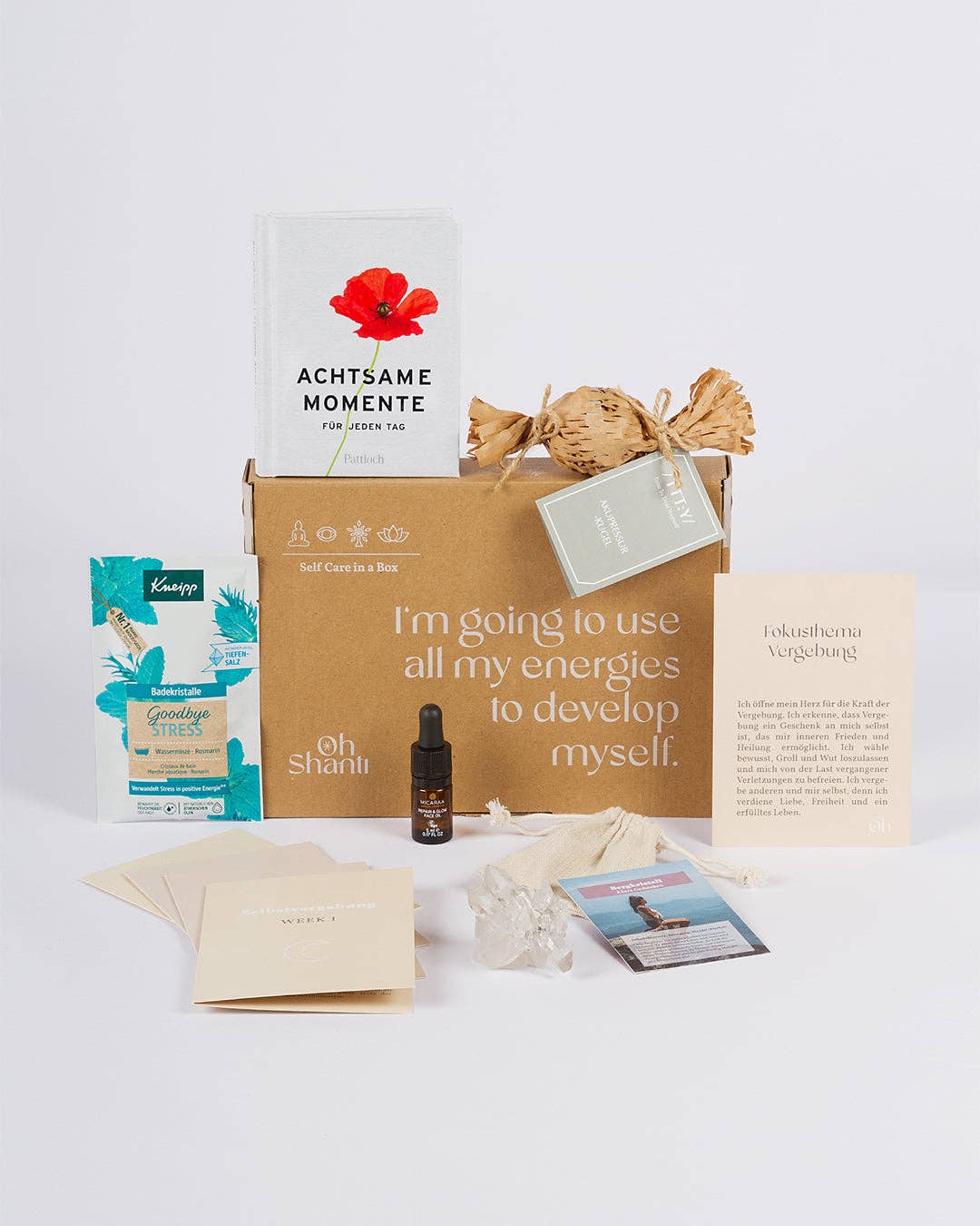 Innere Klarheit finden * Die Box unterstützt dich mit dir selbst in Kontakt zu kommen * 4 Mind Cards zum Fokusthema Klarheit für deinen persönlichen Wachstum * Edelstein aus Bergkristall und Räucherständchen mit Räucherstäbchenhalter zur Unterstützung & Begleitung * Nachhaltig, vegan, tierversuchsfrei & fair gehandelt * Wunderschöne Geschenk Box um die eigenen Wünsche und Ziele zu finden Mit unserer Geschenk Box möchten wir dich für klare Entscheidungen in deinem Leben bestärken. Es geht um mehr Verantwortung, frei in seinen Gedanken zu sein, um sich letztlich das Leben nach seinen eigenen Wünschen zu gestalten. Die Oh Shanti Mind Cards unterstützen dich in den nächsten vier Wochen den Fokus nur auf dich und deine innere Klarheit zu richten.
