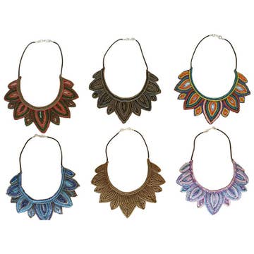 Lätzchenhalskette mit rotem, weißem und orangefarbenem, rundem Kragen, besetzt mit gewirbelten Steinperlen-Details. Rückseite aus schwarzem veganem Leder. Toggle Closure. 4 Zoll lang und 9 Zoll breit. Handgefertigt. Fairer Handel. Exklusiv