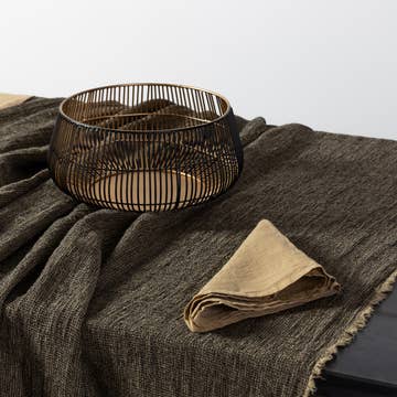 Blaue quadratische Tischdecke mit ecru Motiven. Inklusive 10 Servietten. Größe 220 x 220 cm, ideal für quadratische oder runde Tische. Handbedruckt mit Naturfarben. 100 % Baumwolle.