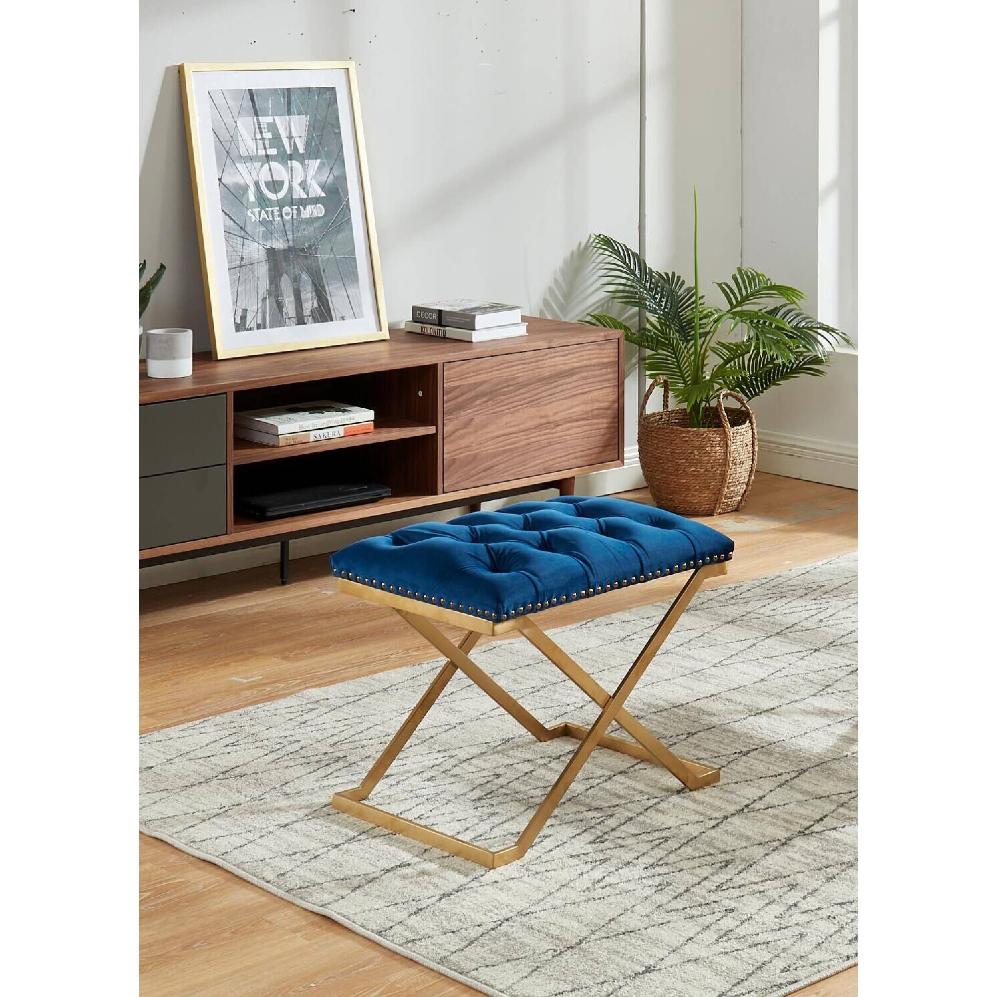 Akzentuieren Sie Ihr Wohnzimmer mit dieser runden marineblauen Ottomane von Charlotte mit goldenem Fuß. Diese moderne Ottomane ist komplett mit Samt bezogen und sorgt für ein weiches und plüschiges Tragegefühl. Es hat einen abnehmbaren Deckel, der Stauraum für kleine Gegenstände des täglichen Bedarfs bietet. Alle für die Konstruktion verwendeten Materialien sind robust und langlebig. Das goldfarbene Gestell bildet einen markanten Kontrast zu den marineblauen Polstern und sorgt für zusätzliche Attraktivität. Design: Navyfarbener runder Hocker mit abnehmbarem Oberteil und goldenem Fuß Farbe:Blau Material: Samt Abmessung:17,75 DIA X 17,75 H