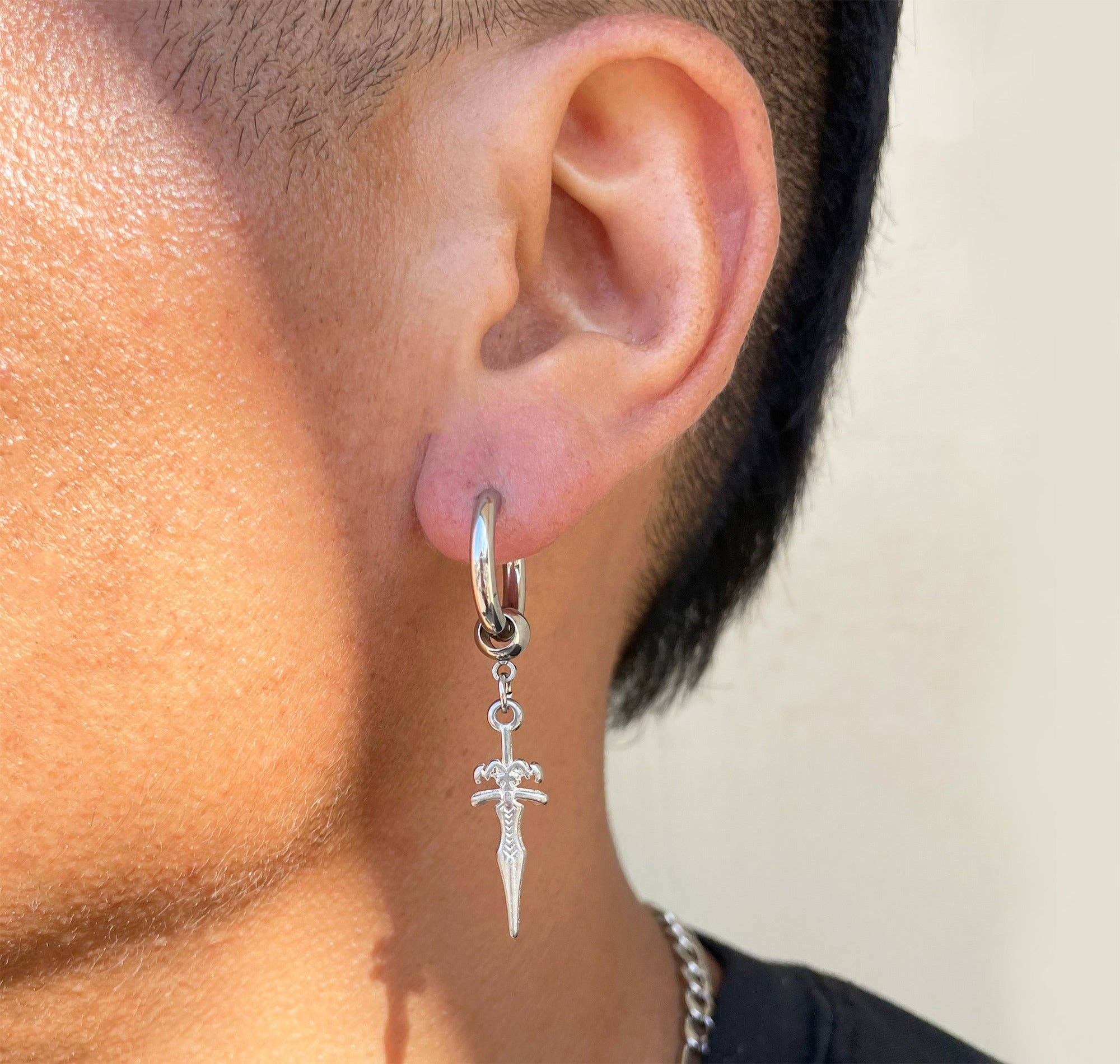 GOLDENER OHRRING MIT DOLCH **Als Einzelstück verkauft** Materialien: Edelstahl, 18 Karat vergoldet Breite: Dolchlänge: 25 mm Reifen: 10 mm Ringstärke: 2 mm Verschluss: Rückseite mit Schnappverschluss Zusätzliche Informationen: Hypoallergen Hochglanzpolierte Oberfläche Umweltfreundlich: Wir verwenden nachhaltige Metalle und recyceltes Gold Anlaufgeschützt und wasserfest: Hier müssen Sie sich keine Sorgen machen, dass die Farbe verblasst. Bei richtiger Pflege hält dieses Stück jahrelang! Weitere Informationen finden Sie in unserem Pflegebereich.