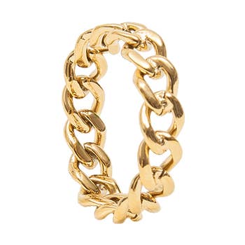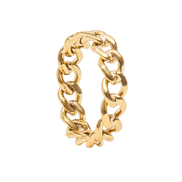 GLIEDERKETTENRING AUS 18-KARÄTIGEM GOLD Dieses moderne Kettenblatt ist mit 18-karätigem Gold überzogen und weist eine hochglanzpolierte Oberfläche auf. Der trendige und auffällige Dylan-Ring ist ein großartiger, zurückhaltender Statement-Ring für den Alltag! Materialien: Edelstahl, 18k vergoldet Maße: Breite des Ringbandes: 5 mm Zusätzliche Informationen: * Hypoallergen * Hochglanzpoliert * Umweltfreundlich: Wir verwenden nachhaltige Metalle und recyceltes Gold * Anlaufgeschützt und wasserfest * 1 Jahr Garantie Unser gesamter Goldschmuck ist mit recyceltem Gold überzogen. Jedes Stück ist mit der hochwertigsten Technik beschichtet, die achtmal haltbarer ist als herkömmlicher vergoldeter Schmuck.