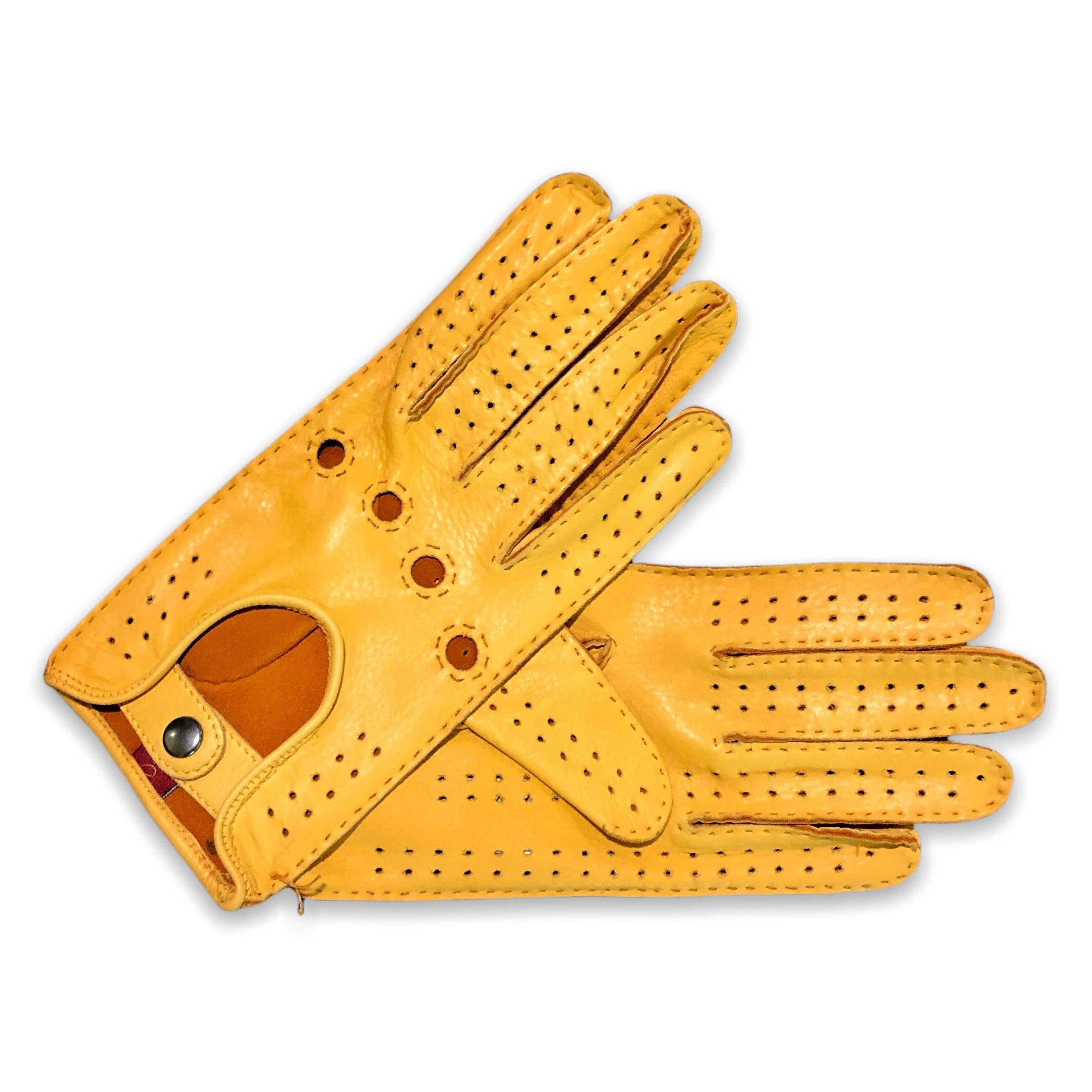 100 % aus hochwertigem Leder gefertigt. Die Handschuhe verfügen über eine doppelte Handgelenkverstellung mittels Metallknopf und handgenähten Abschlüssen. Farbe: Senfgelb