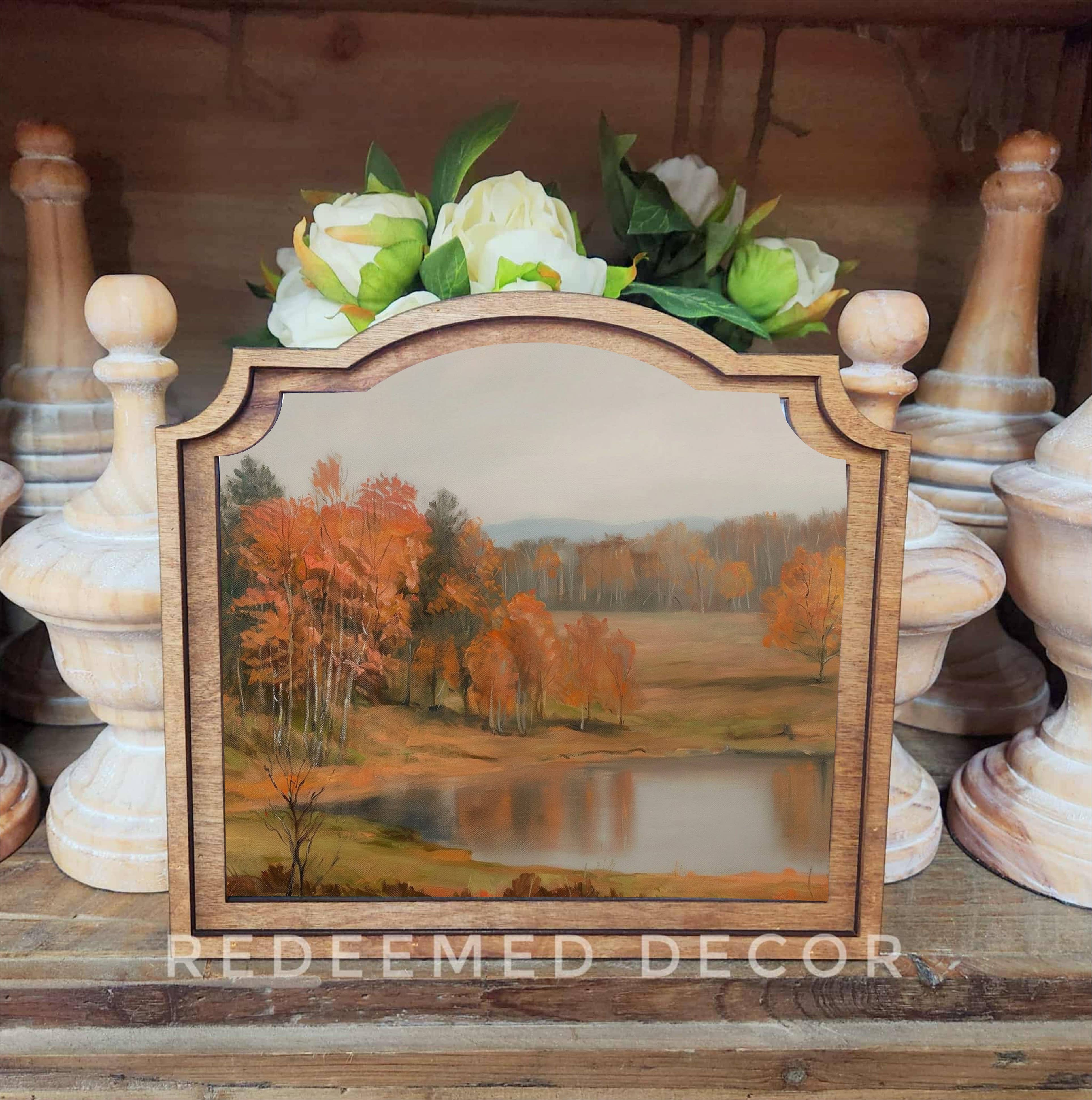 Dieses einzigartige gerahmte Kunstwerk wird in Idaho handgefertigt. Es misst 9 Zoll in der Höhe und 10 Zoll in der Breite. Die individuelle Rahmenform verleiht dem Stück einen Vintage-Look. Das Kunstwerk wird mit schönen Canon-Pigmenttinten auf Leinwand gedruckt. Die Leinwand ist auf eine Holzrückwand montiert. Der obere Rahmen besteht aus lasergeschnittenem Birkenholz, das in einem neutralen Early American-Ton gebeizt ist. Das gesamte Stück ist leicht und kann mit einem Klebestreifen (nicht enthalten) einfach aufgehängt werden. Sie können dieses Kunstwerk auch gegen eine Wand oder ein anderes Dekorationsobjekt lehnen, um es auf einem Regal oder Tisch zu präsentieren. Es könnte auch auf einer Staffelei ausgestellt werden.