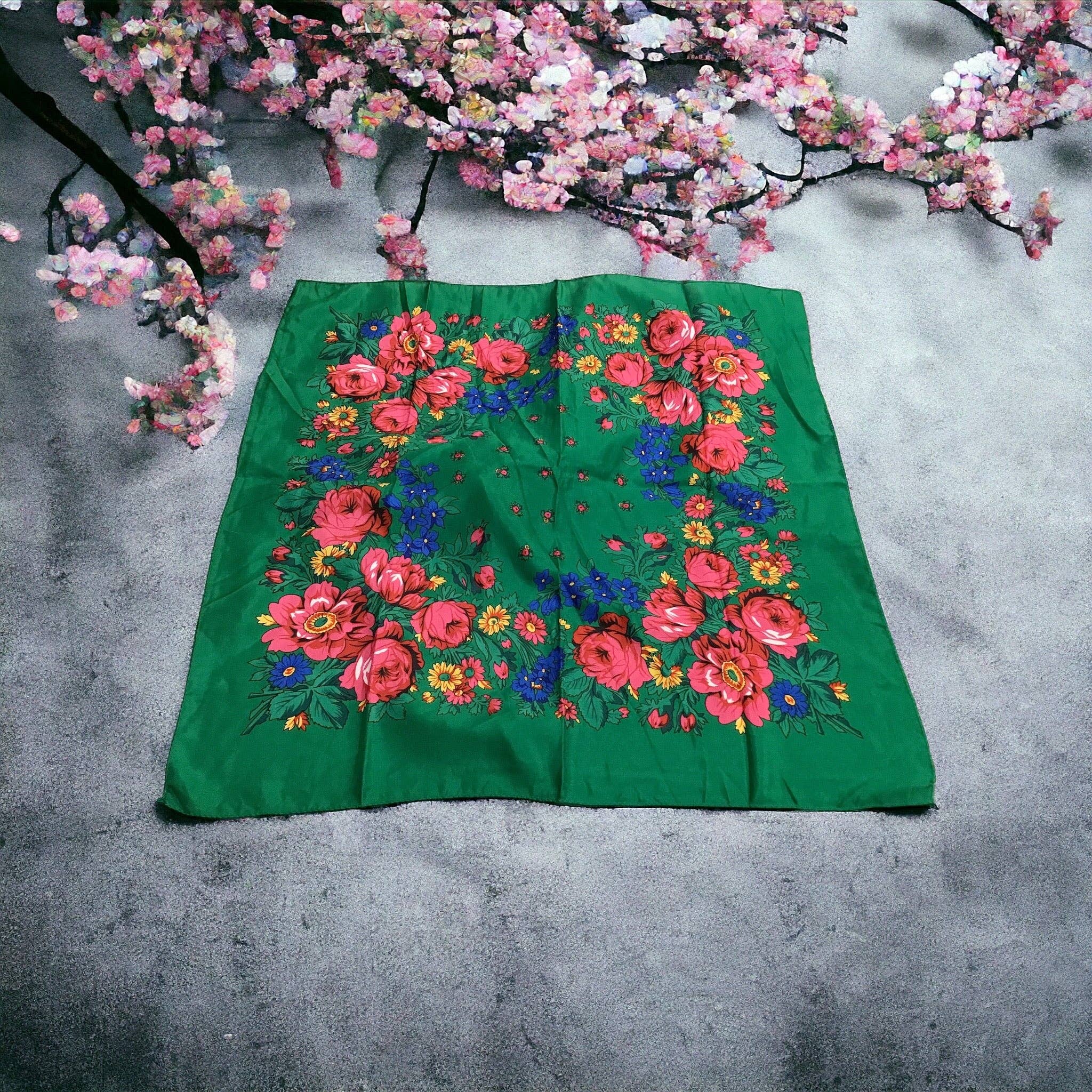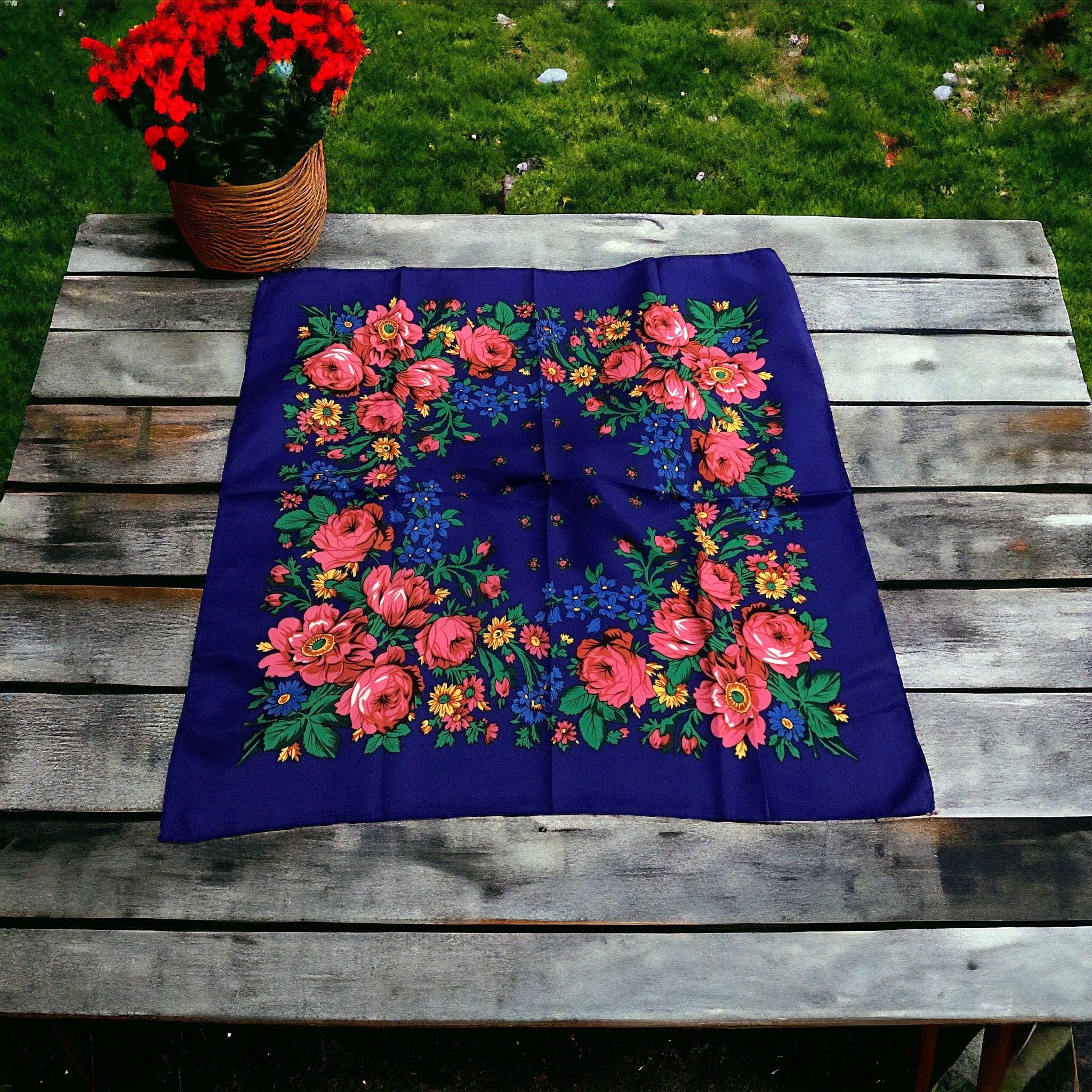 Das Kookum-Tuch oder ukrainische Tuch ist ein Symbol für die Beziehungen der indigenen Völker, die die ukrainischen Siedler unterstützten, die nach Kanada kamen. Diese Tücher wurden zwischen indigenen und ukrainischen Frauen gehandelt. Es gibt viele Ähnlichkeiten zwischen unseren Kulturen, und das Tuch steht heute für unsere Einheit. Indigene Völker tragen diese Tücher nun mit unserer traditionellen Tracht und in unserem Alltag. 65 cm x 65 cm 26 x 26 Zoll