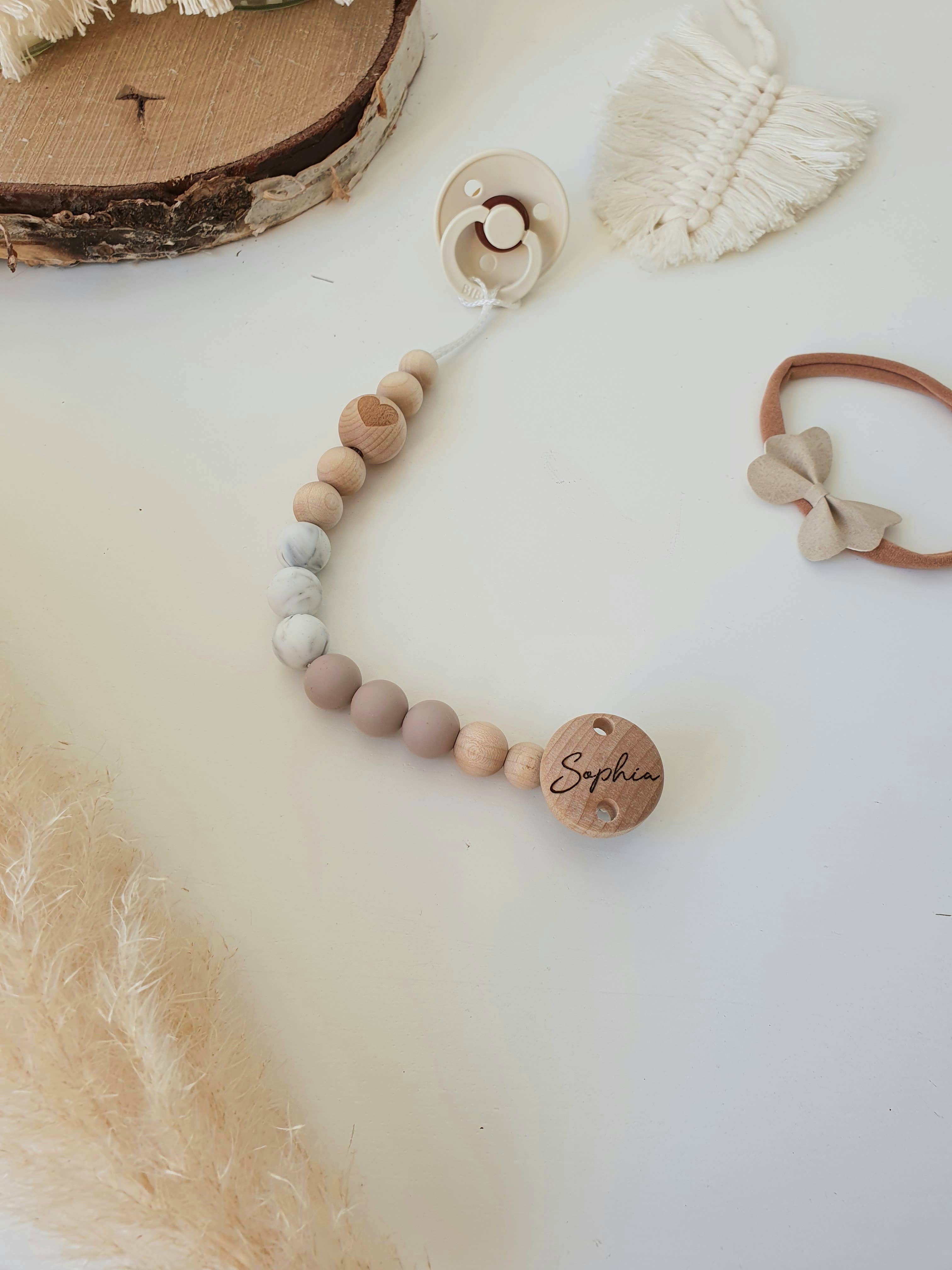 Der Preis gilt für 1 Schnullerclip. Schnuller sind NICHT im Lieferumfang enthalten. Mach dir keine Sorgen, dass dein Baby jemals wieder seinen Schnullerclip fallen lässt! Dieser wunderschöne Clip sorgt dafür, dass der Schnuller sicher an Ort und Stelle bleibt. Beschreibung Die Silikonbestandteile bestehen aus ungiftigem, zu 100% lebensmitteltauglichem Silikon. Frei von schädlichen Substanzen wie PVC, BPA und Phthalaten. Die Holzprodukte sind aus kanadischem Ahorn oder Beachwood und alle sind naturbelassen und unlackiert. Verwenden Sie zum Reinigen der Silikonprodukte einfach milde Seife und Wasser. Vermeiden Sie, dass der Metallverschluss in Wasser getaucht wird. Lassen Sie alle Holzteile zwischen den Anwendungen vollständig trocknen und lassen Sie sie nicht für längere Zeit im Wasser liegen. Diese Produkte sind NICHT spülmaschinen- oder mikrowellengeeignet. Wie jedes Produkt für das Zahnen dürfen unsere Produkte nur unter sorgfältiger Aufsicht von Erwachsenen verwendet werden. Alle Teile des Beißrings sollten regelmäßig auf Anzeichen von Beschädigung oder Verschleiß überprüft werden. Wenn Schäden oder Verschleiß festgestellt werden, stellen Sie die Verwendung sofort ein. Pebble to Peak haftet nicht für Probleme.