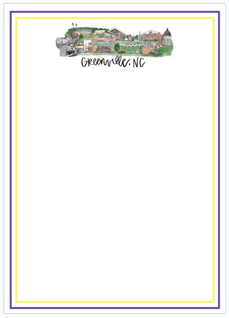 Teilen Sie Ihre Liebe zu Greenville, North Carolina, mit diesem wunderschönen digital gezeichneten Skyline-Aufkleber. Es bietet viele Favoriten der East Carolina University. Es ist eine großartige Möglichkeit, die Piratennation zu repräsentieren! Dieser Aufkleber ist ~2x5in groß. Es besteht aus hochwertigem Vinyl und ist wasser-, wetter- und spülmaschinenfest.