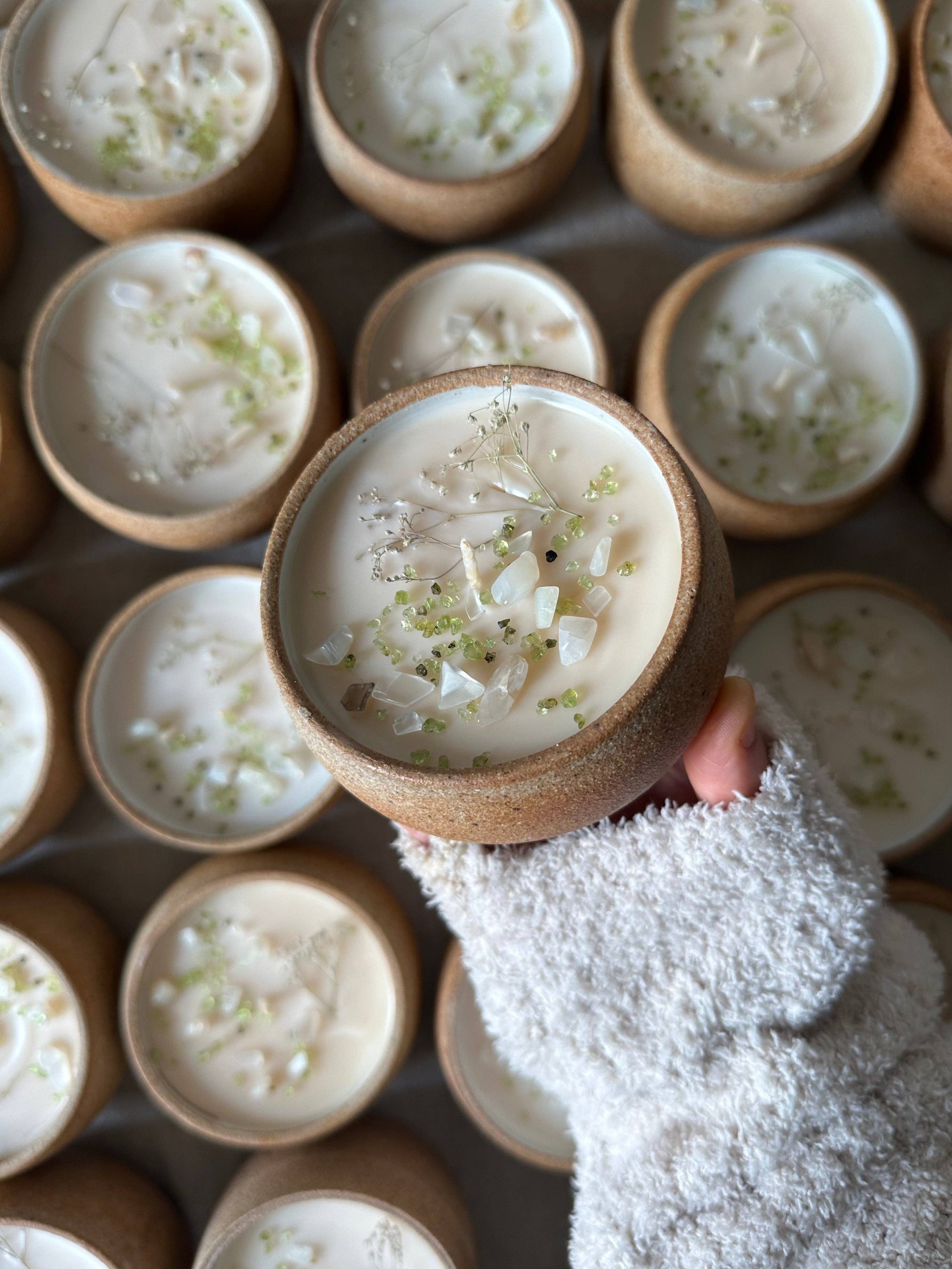 Duftnoten: Pflaume, Bergamotte, Kiefer, Bernstein, Sandelholz, Eichenmoos Brenndauer: 8 Unzen: 60 Stunden saubere Brenndauer. 12 Unzen: 90 Stunden saubere Brenndauer. 25 Unzen: 120 Stunden saubere Brenndauer. Edelsteine: Roter Jaspis, Obsidian und klarer Quarz sollen, wenn sie kombiniert werden, Grundenergie, emotionale Stärke und verbesserte Klarheit bieten und körperliche Vitalität mit schützenden und reinigenden Eigenschaften in Einklang bringen. Gefäß: Tauchen Sie ein in die bezaubernde Welt der Soltree-Kerzen mit diesen exquisiten handgefertigten Keramikgefäßen, die von der talentierten lokalen Künstlerin Beth Bowman gefertigt wurden. Jedes Gefäß verkörpert mühelos das einzigartige Ambiente der Soltree-Kerzen und zeichnet sich durch ein erdiges und minimalistisches Design aus, das jedem Raum einen Hauch von Eleganz verleiht.