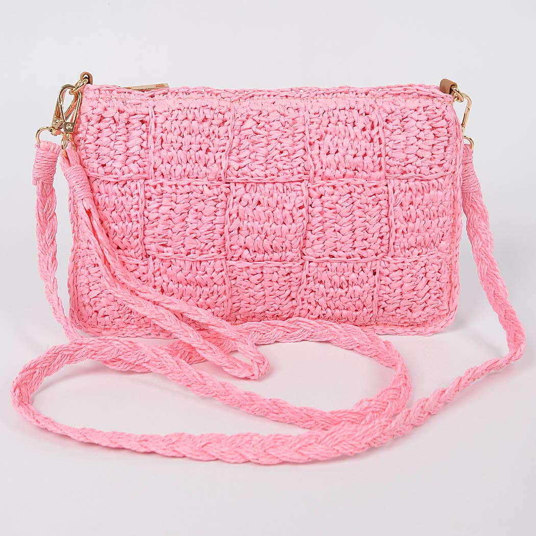 * Schultertasche mit Klappe aus Kunststroh * 12 W* 7 H* 1,5 D * Polyurethan, gemischtes Metall.