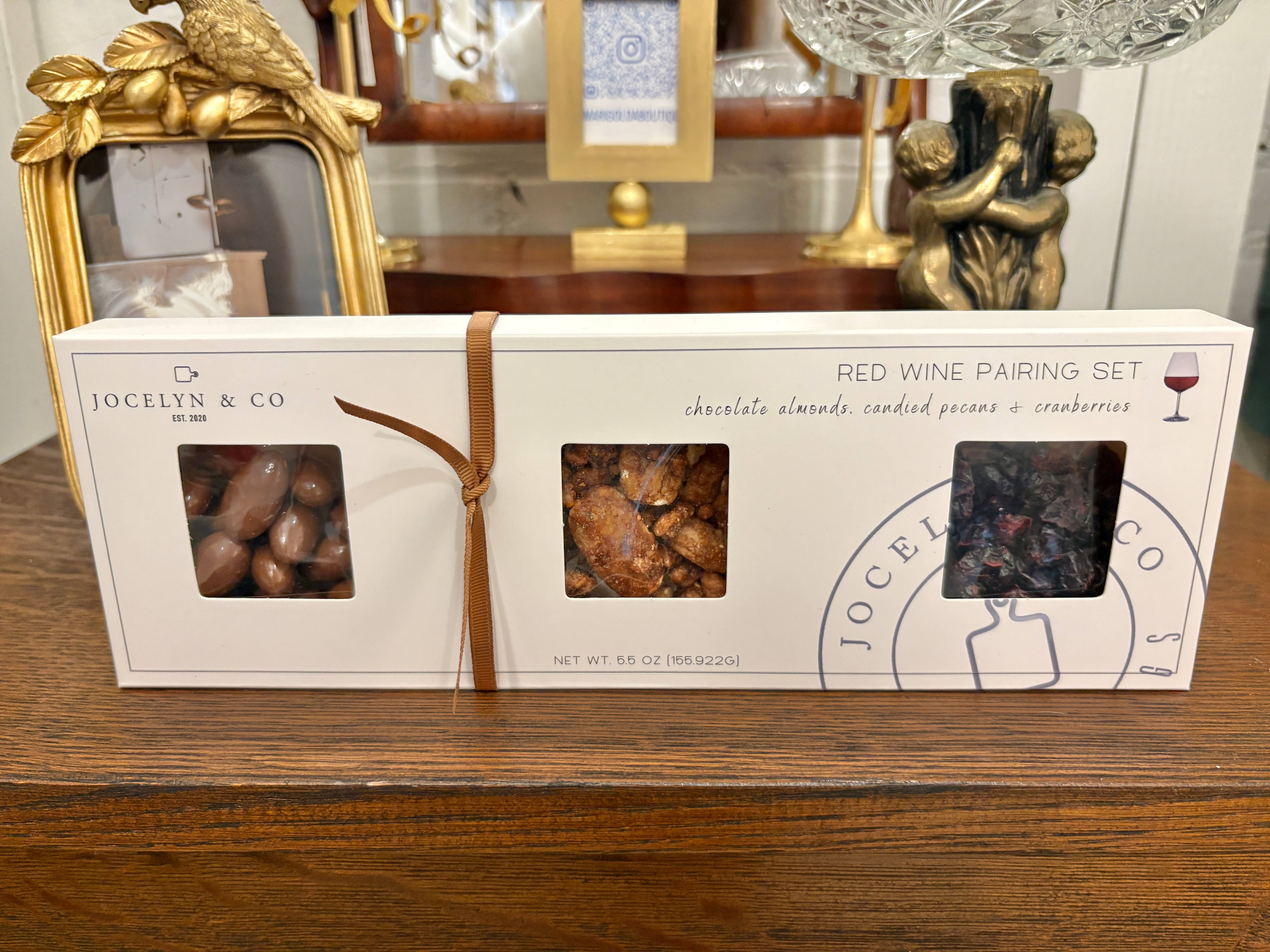 Eine 12 Zoll breite Box mit drei Fenstern, damit Sie die fabelhaften Produkte darin sehen können. Aufgrund des Wetters wird dieses Geschenk am 3. Oktober versendet. Diese Kollektion soll mit Schaumweinen wie Portweinen, Madeira und Pinot Noir kombiniert werden. Diese Sammlung umfasst: Mandeln mit Schokoladenüberzug Kandierte Pekannüsse Gesüßte Preiselbeeren