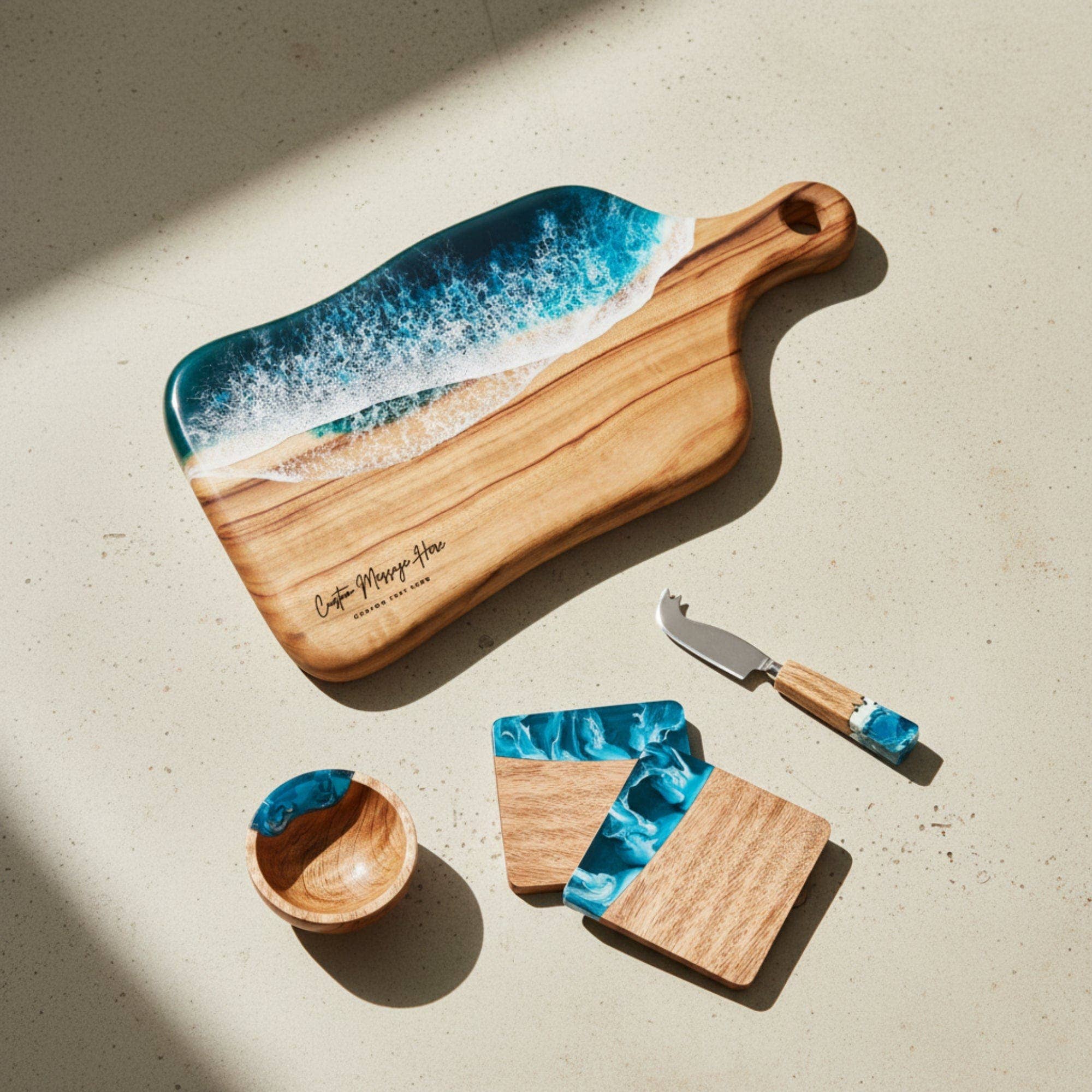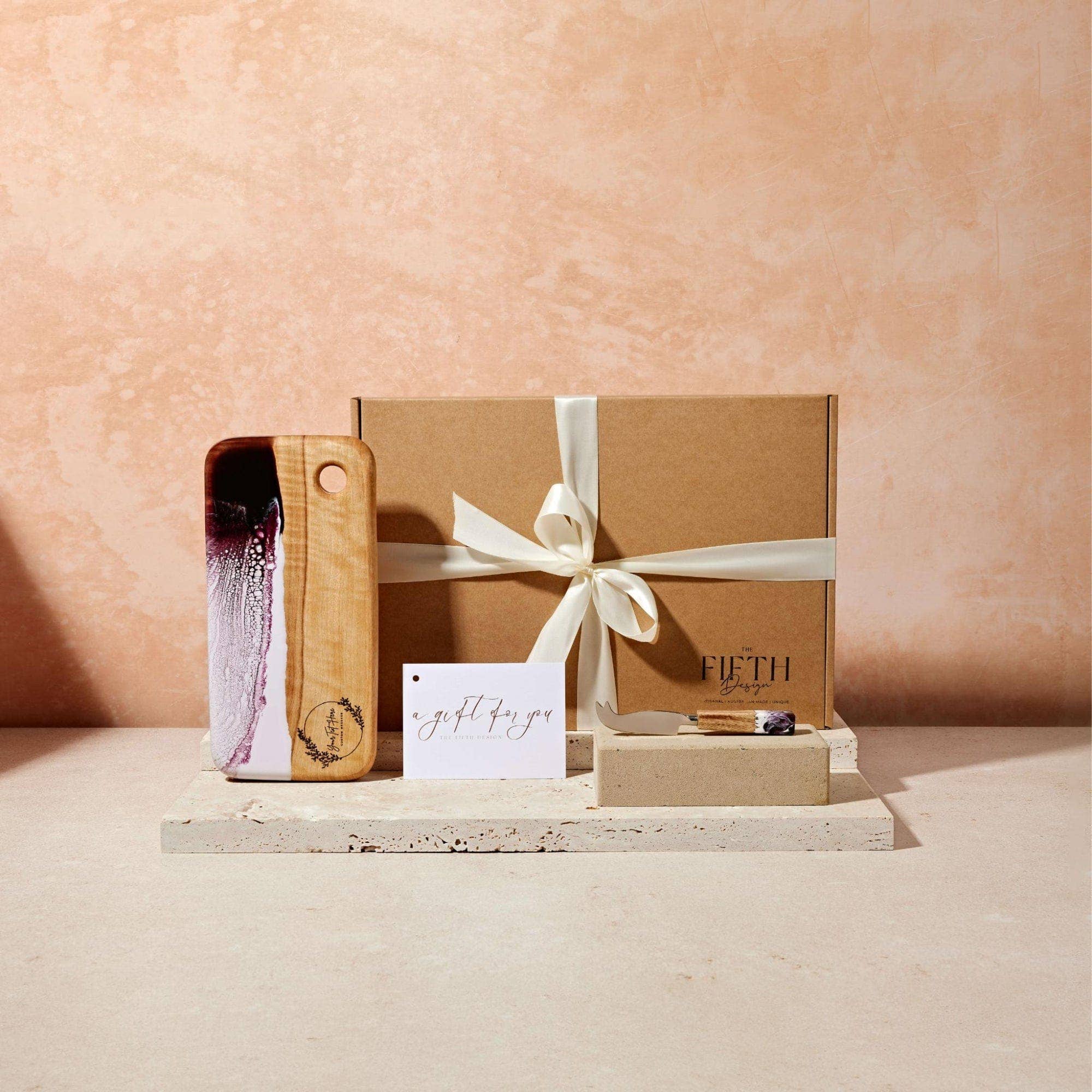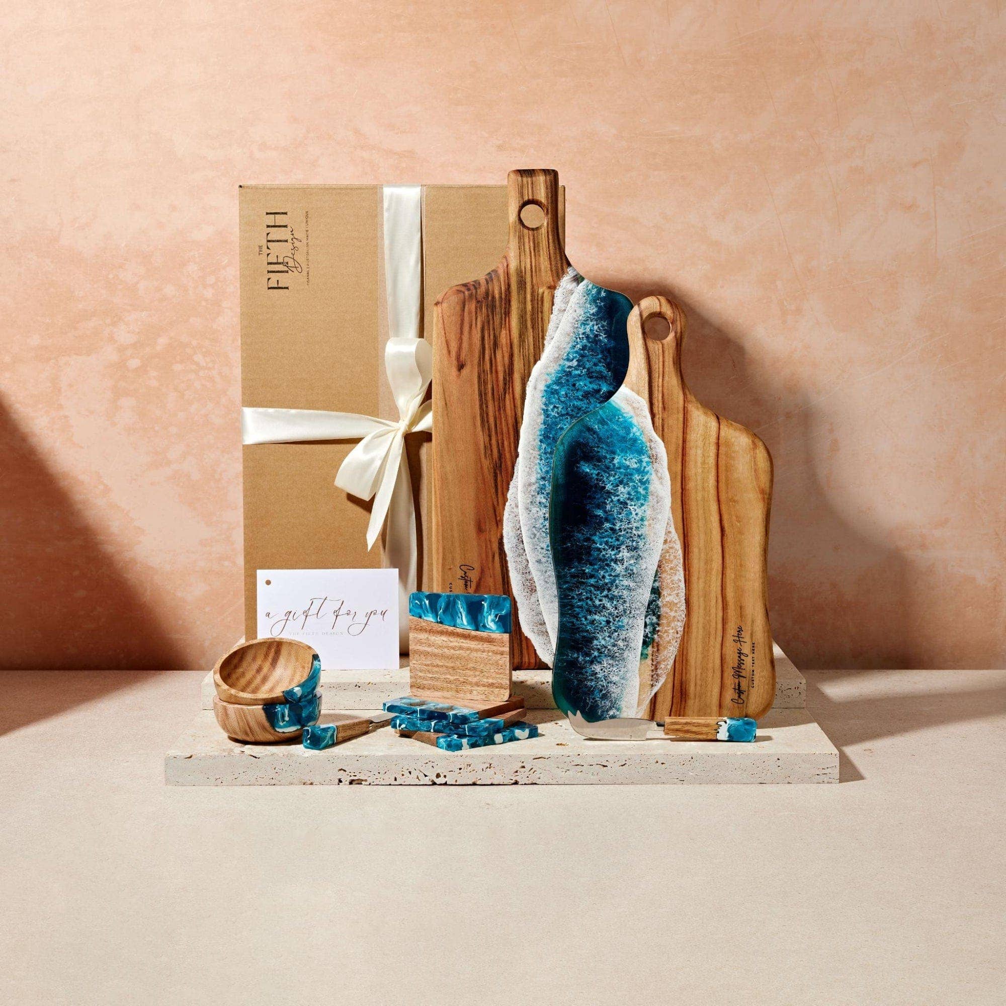 At The Fifth Design, we offer high-quality, sustainable, handmade products that people can cherish forever. Our cheese boards, serving trays, coasters and other products are designed and created with a focus on sharing and congregating with loved ones. These products can also serve as unique and personalized gifts, empowering individuals, couples, and families to commemorate important life events and express their love through thoughtful giving. It is our team’s hope that the products we create will find happy use as centerpieces for friends and loved ones who gather to share good food, good wine, and good stories. We are also proud to offer truly one-of-a-kind products. Too often the housewares marketplace is filled with items that are useful — but uninspired in their design and aesthetics. We take a different approach to creating everyday kitchen and home products. Our artisanal process is rooted in taking art off of walls and giving it an active role in the lives of everyday people. For centuries, art has been revered and allocated to static environments like museums. We find this idea outdated (and frankly boring!). We pour artistic passion and inspiration into creating each of the products you’ll find in our selection, making art something that our customers can bring into their homes and share with others. Take a look at the products that emerge from our mission to deliver beautiful, handmade products that can play a role in your day-to-day life.