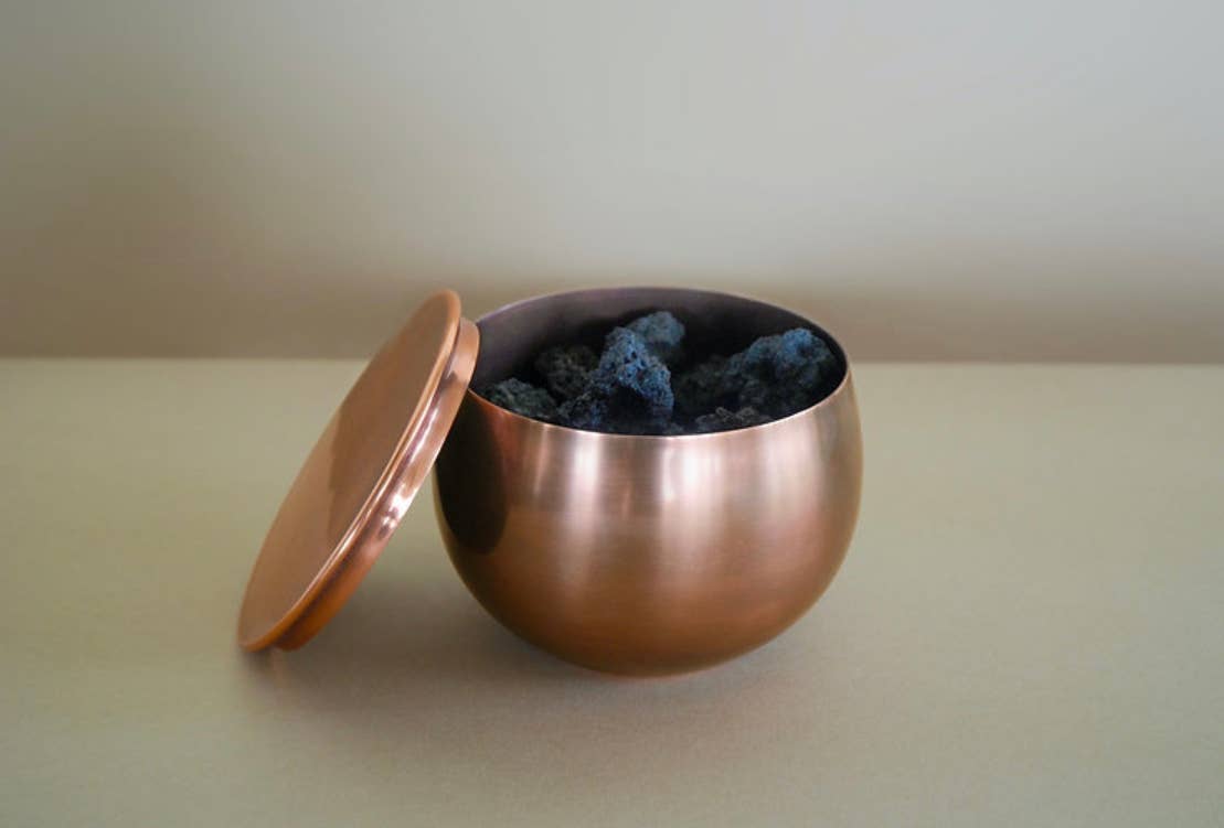 Lava stone home fragrance diffusers in copper bowls — by Hohm. Hohm Spirited Scents introduce an exciting new way of enjoying home fragrances, combining the relaxing properties of beautiful fragrances with the grounding qualities of lava stones. The raw beauty of New Zealand's thermal heart inspired the team behind Hohm to make lava stone the rock star of your Hohm experience. Lava stones are naturally porous and a clean carrier-diffuser for Hohm's spirited scents. Marisa en Arjan started Hohm after they changed country and careers. Leaving a busy life in Amsterdam behind, they now run Hohm from their property in beautiful Mangawhai, New Zealand.