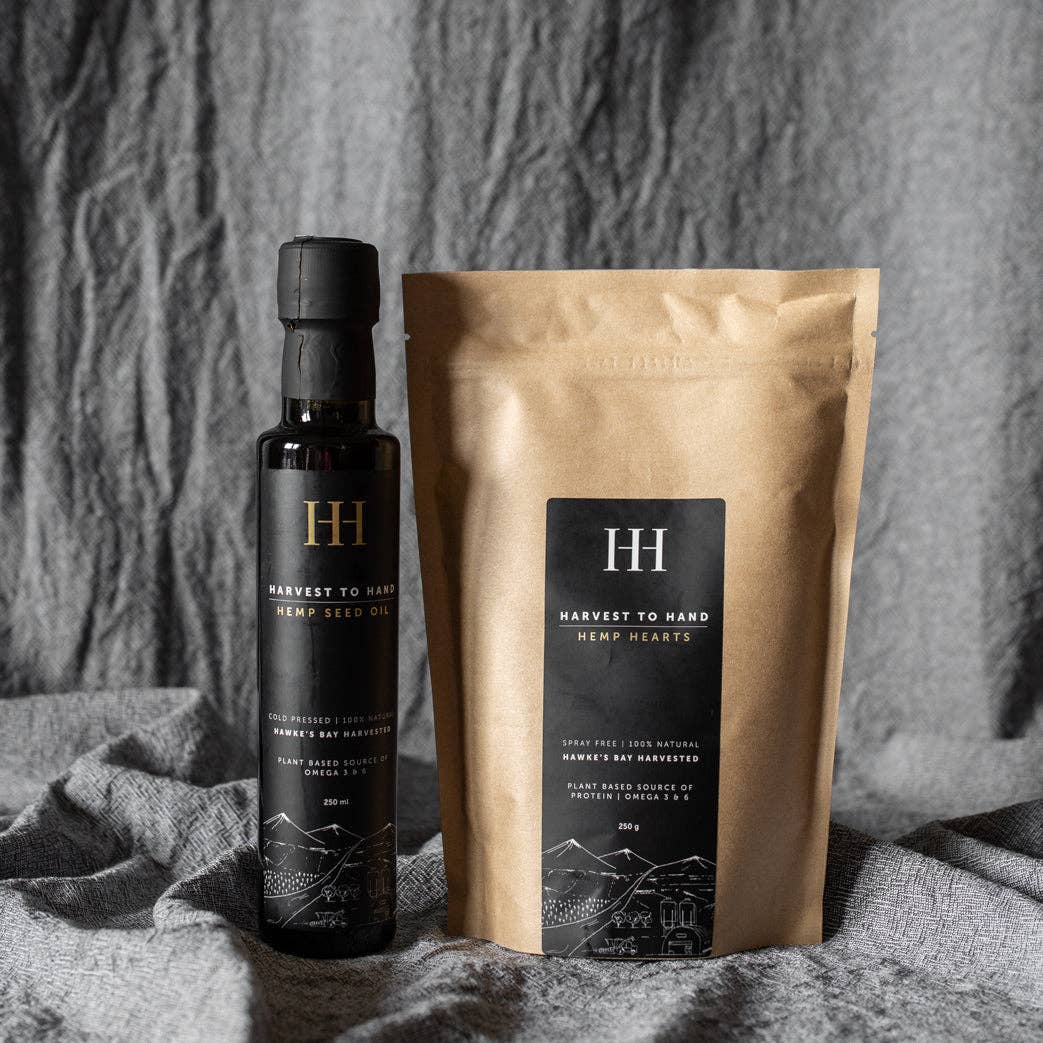 Harvest to Hand is a family affair, founded by Holleigh Ellis, Ian Ellis and Dylan Pearce in 2020, and based on the Ellis' family farm in Tikokino, Central Hawke's Bay. The brand's vision is to provide good, wholesome food products, grown sustainably in their own backyard, to New Zealanders who prioritise a healthy lifestyle. While Harvest to Hand's first product line is hemp-based (one of the world's most sustainable plants), the team has exciting new products in the pipeline, and will continue to diversify in the coming years, in keeping with the constant evolution of the Ellis' farm. The farm has a rich history; it's been in the family for three generations. John Ellis purchased an 800-acre property in 1965, and raised livestock for 35 years. When his son Ian Ellis took over in 2000, he discovered a deep aquifer beneath the farm. This allowed the family to add pivot irrigators, purchase neighbouring land and ultimately diversify the farm's practices and grow specialised crops that wouldn't usually withstand the long hot summers that Hawke's Bay is renowned for. Fast-forward to the present day, where Holleigh and her partner Dylan work alongside Ian on the farm, and the Harvest to Hand business. Holleigh is a Food Scientist, with several years' experience working across various stages of the food supply chain. Dylan is from a farming background, and has several years' experience managing his own family business. Both Holleigh and Dylan are passionate about healthy food