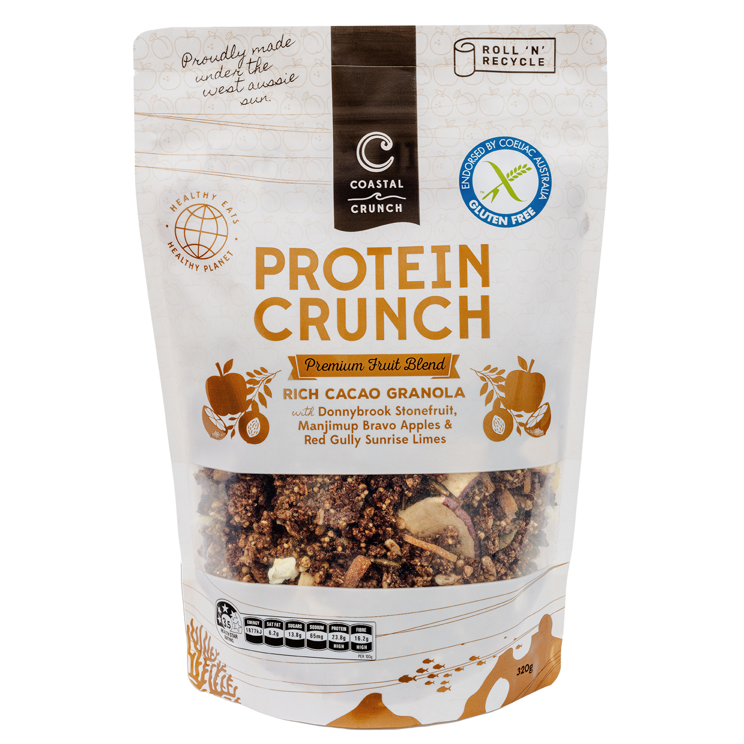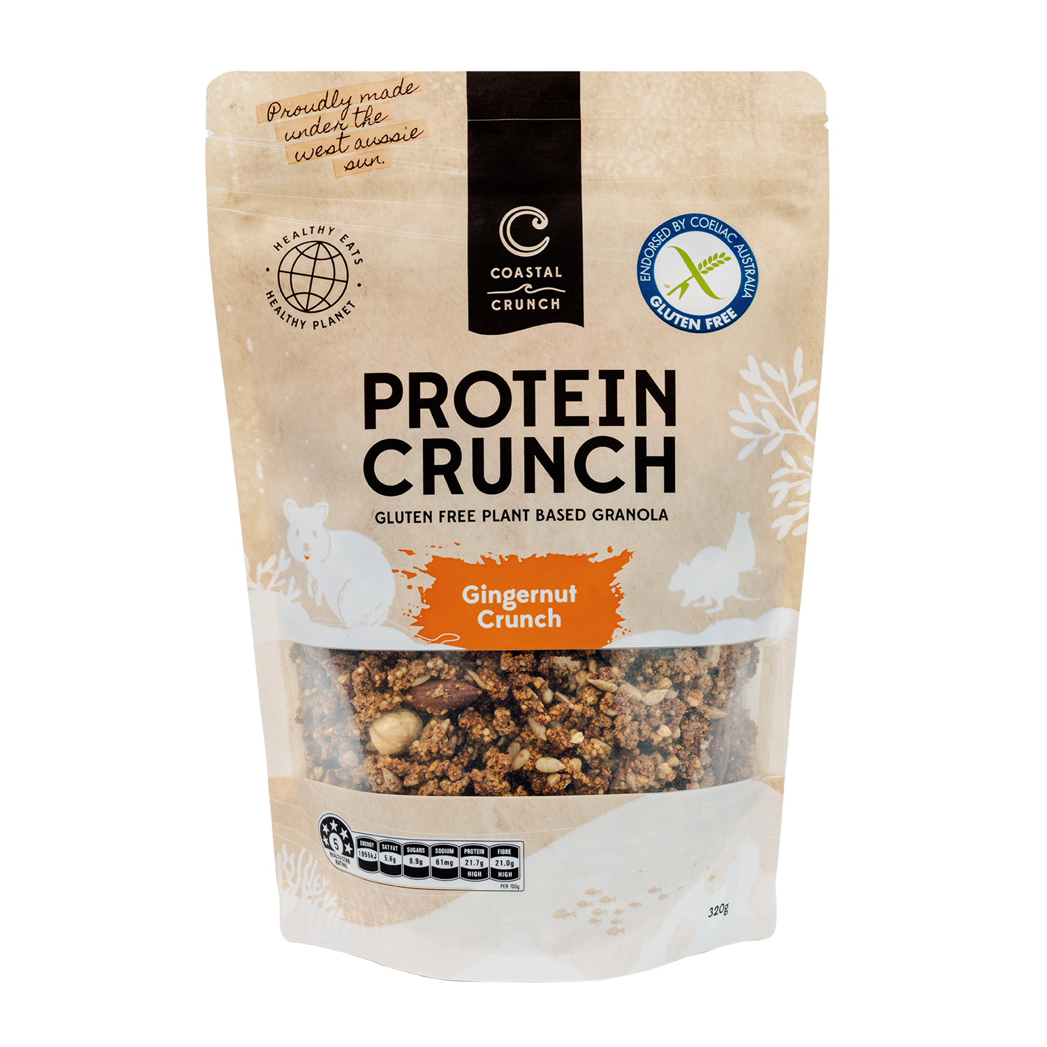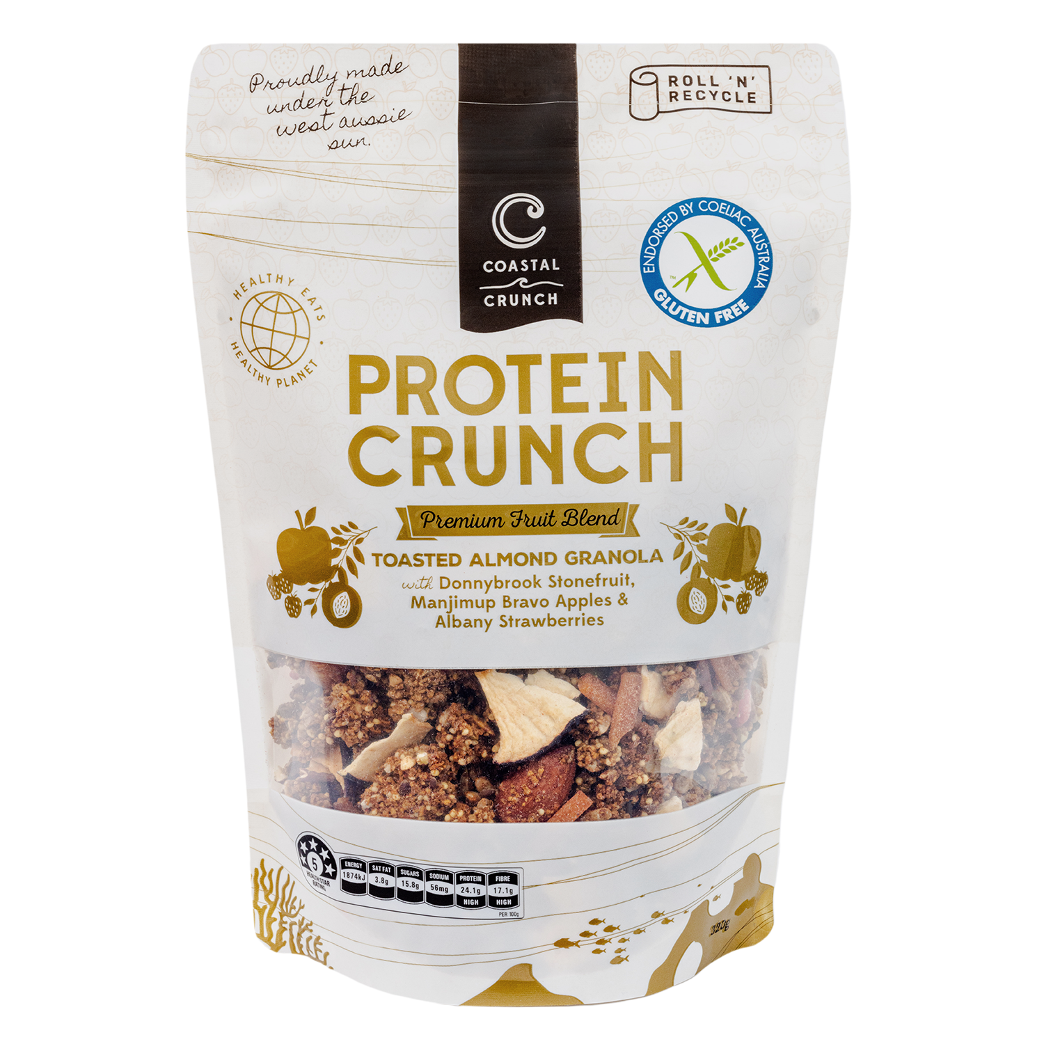 Coastal Crunch is created by Tim, a restaurant trained chef from Perth, WA. Our mission is to create healthy eats for a healthy planet. We are super proud to bring you the unique blend of ingredients that we call Protein Crunch. Our mixes are distinctly different from anything you’ve ever tried. All our blends pack a protein and fibre punch and are perfect with your favourite yoghurt or milk. We have also ensured that each flavour contains less than a teaspoon of unrefined sugar per serve. Our granolas are great as an addition to smoothies and smoothie bowls, sprinkled over porridge in the morning or over ice cream at night. There are also heaps of other ways to use our Protein Crunch in your own baking and snack recipes. Our range of Protein Crunch has been endorsed by Coeliac Australia so you know that you’re eating a genuinely gluten free product. We don’t have anything against gluten, but we know how careful you have to be if you suffer from Coeliac disease. All our products are manufactured in a completely gluten free facility for your peace of mind.