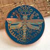 Rikrack embroidery's Mystic Dragonfly enamel pin is made with cloisonné hard enamel with locking butterfly clip back. Copper colored metal is filled with enamel in shades of blue. Measures 1.25x1.25 round. Packaged on recyclable Kraft backer card.